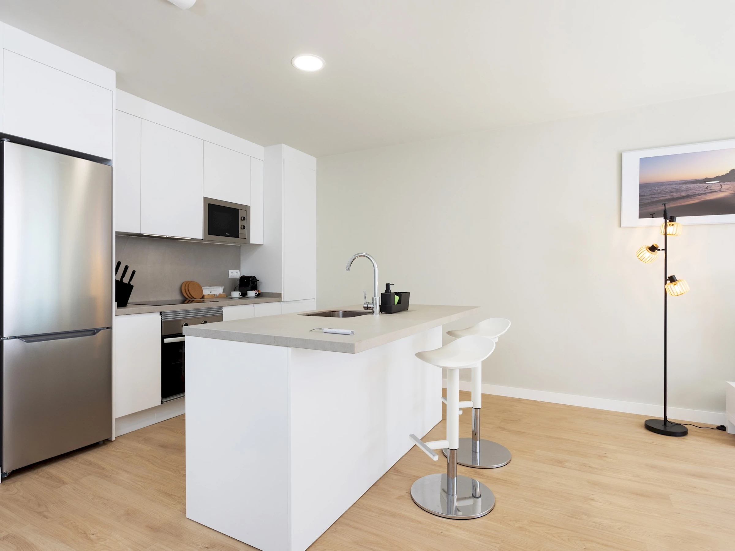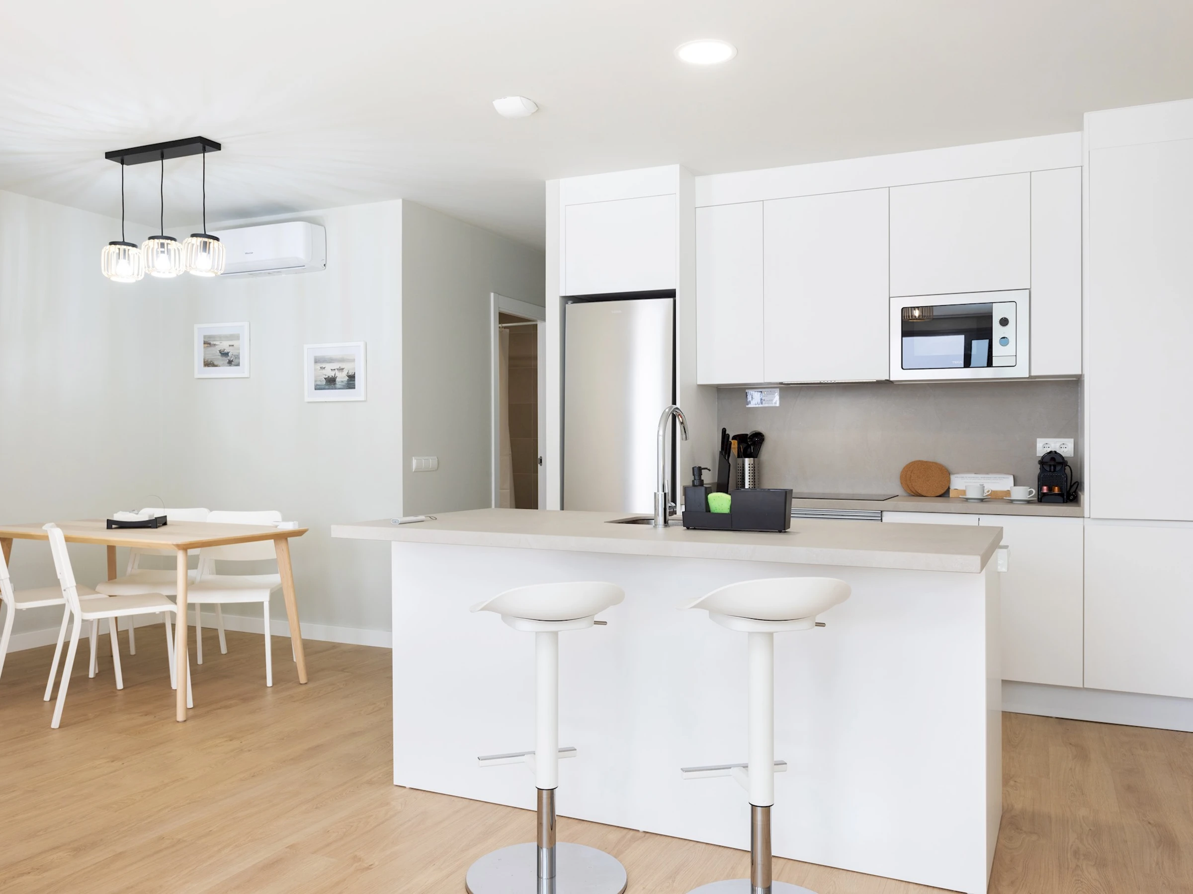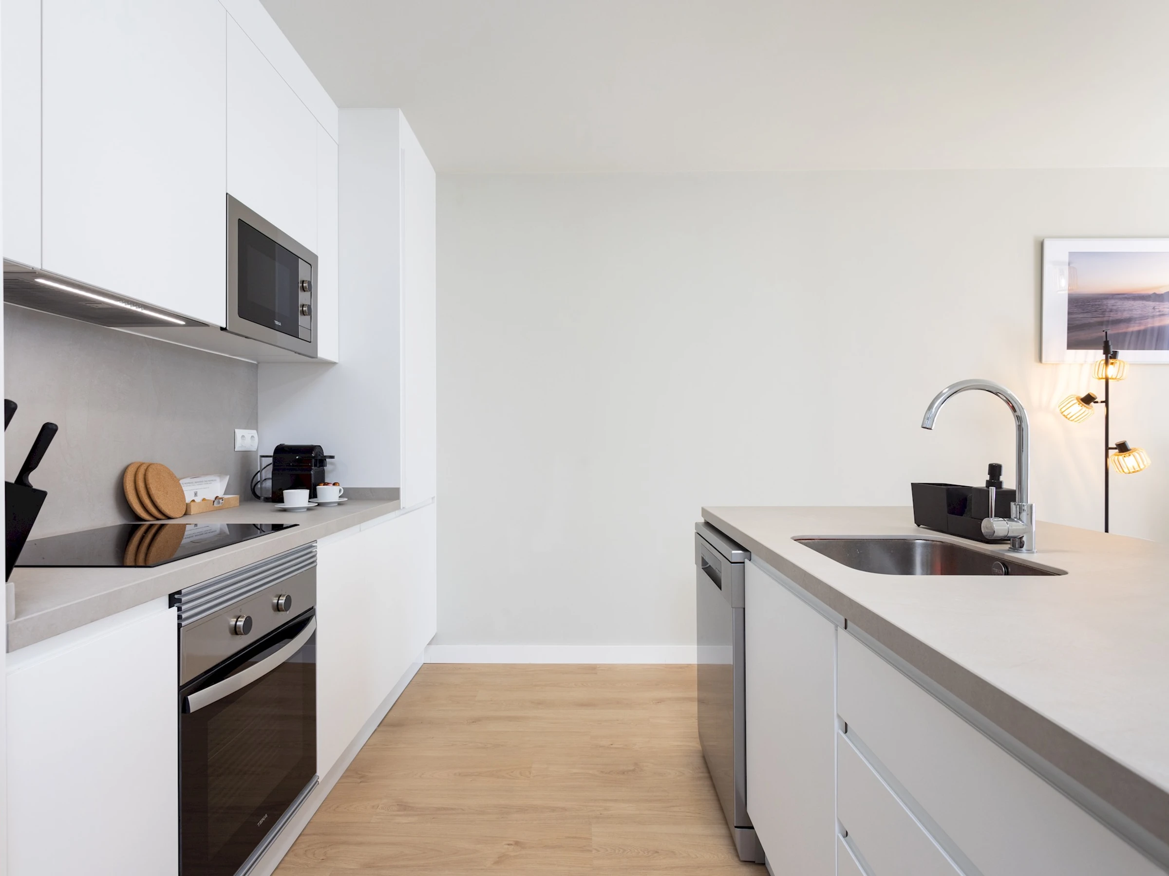 Dieses küche, ist ausgestattet in mikrowelle, backofen, spülmaschine, kochutensilien und kaffeemaschine.
