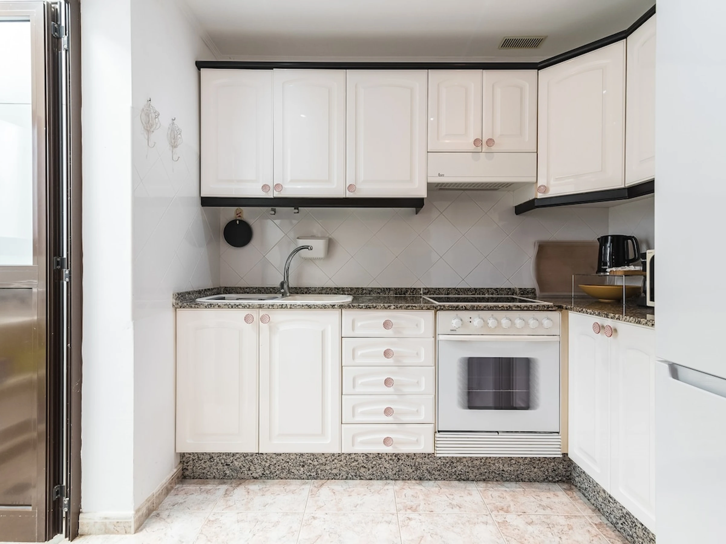 Dieses küche, ist ausgestattet in mikrowelle, backofen, kochutensilien und kaffeemaschine.