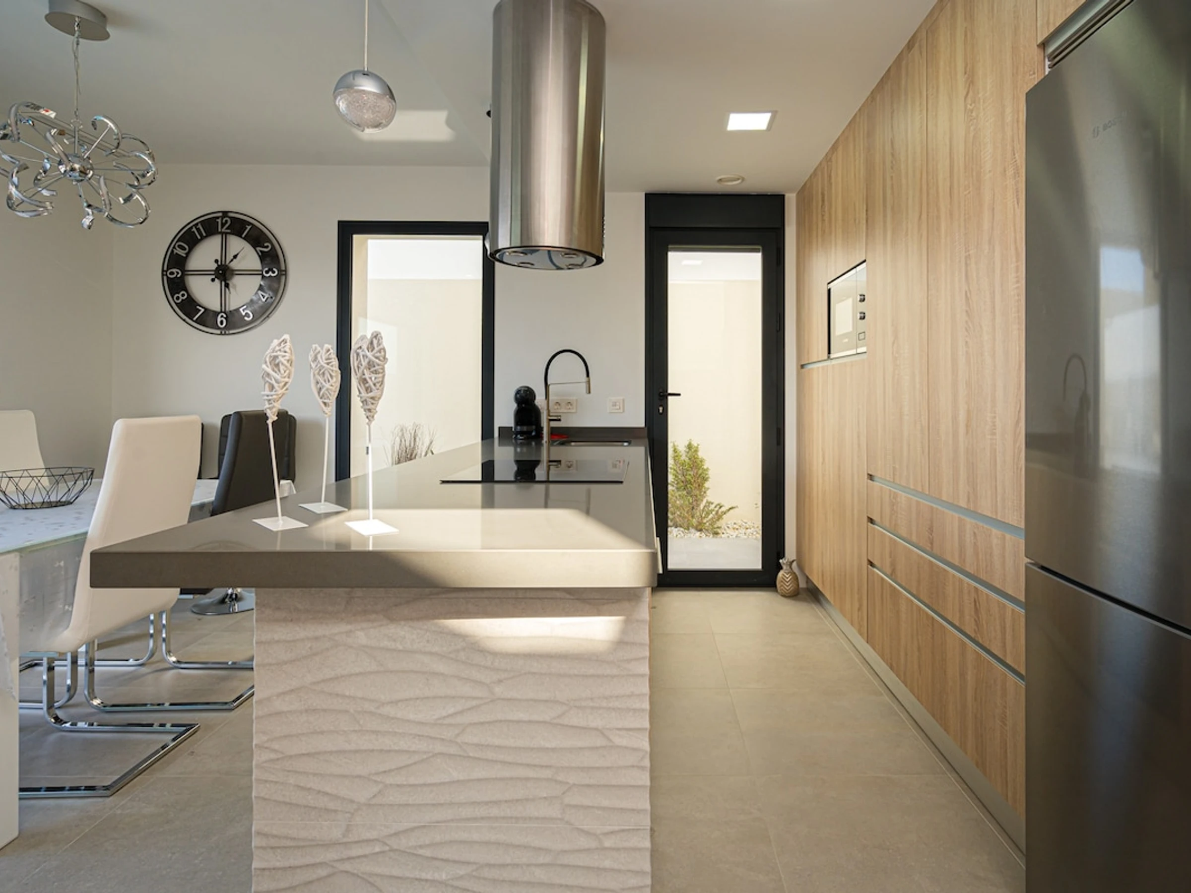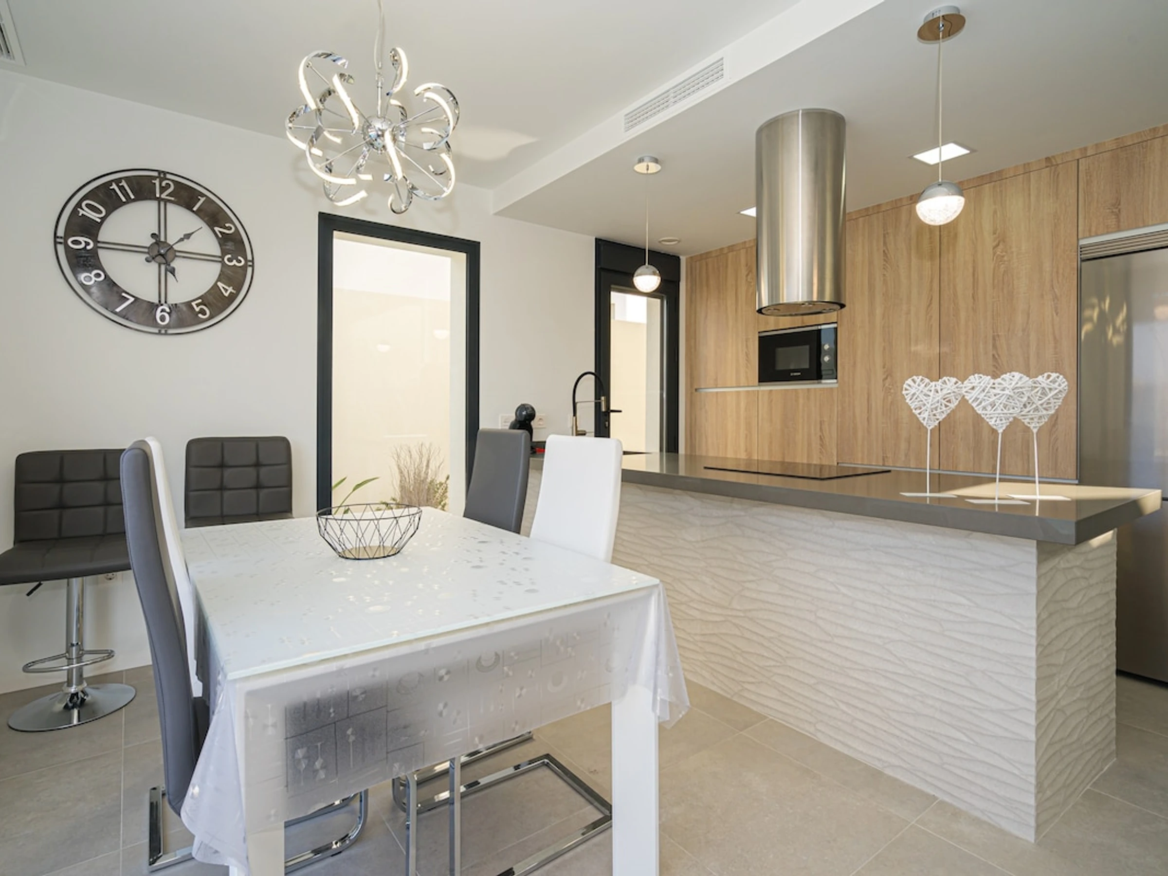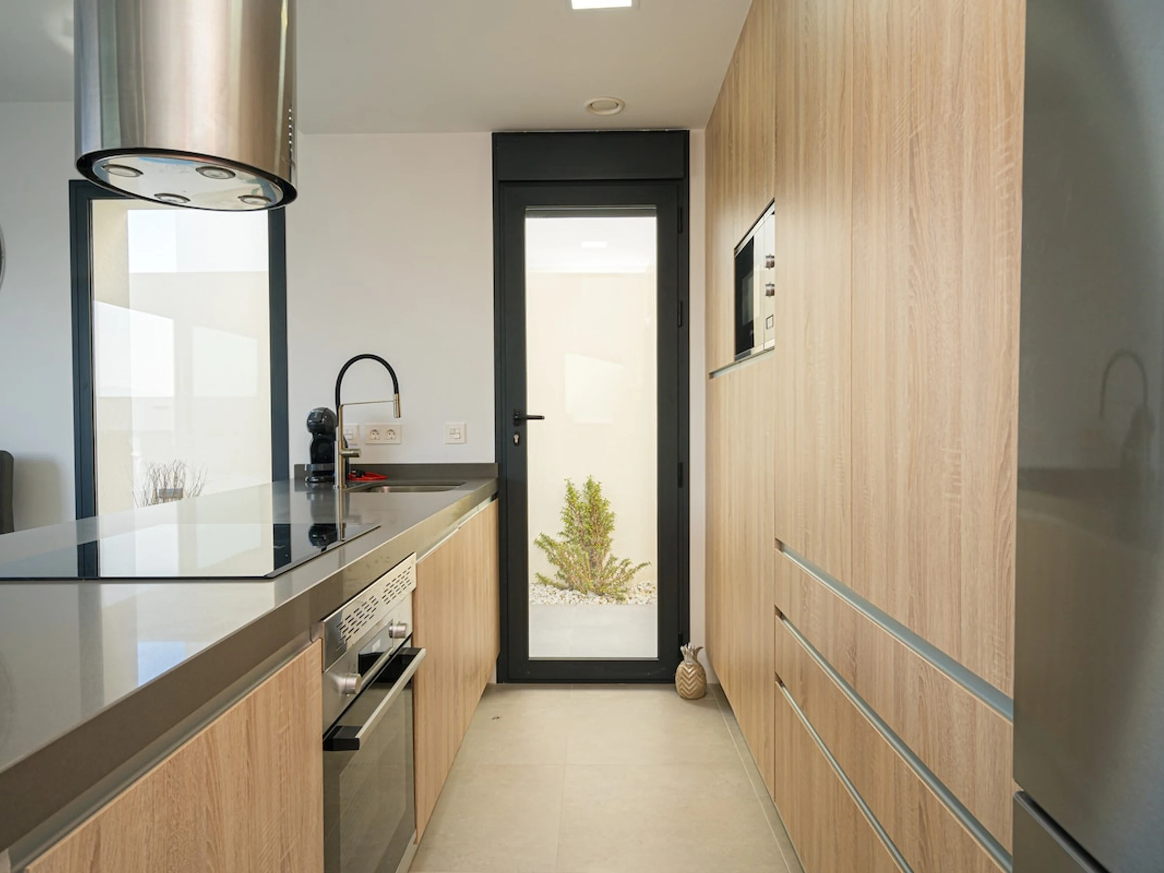 Dieses offene küche, mit ceranfeld, ist ausgestattet in kühlschrank, mikrowelle, backofen, gefrierschrank, spülmaschine, geschirr/besteck, kochutensilien, kaffeemaschine, toaster, wasserkocher und saftpresse.