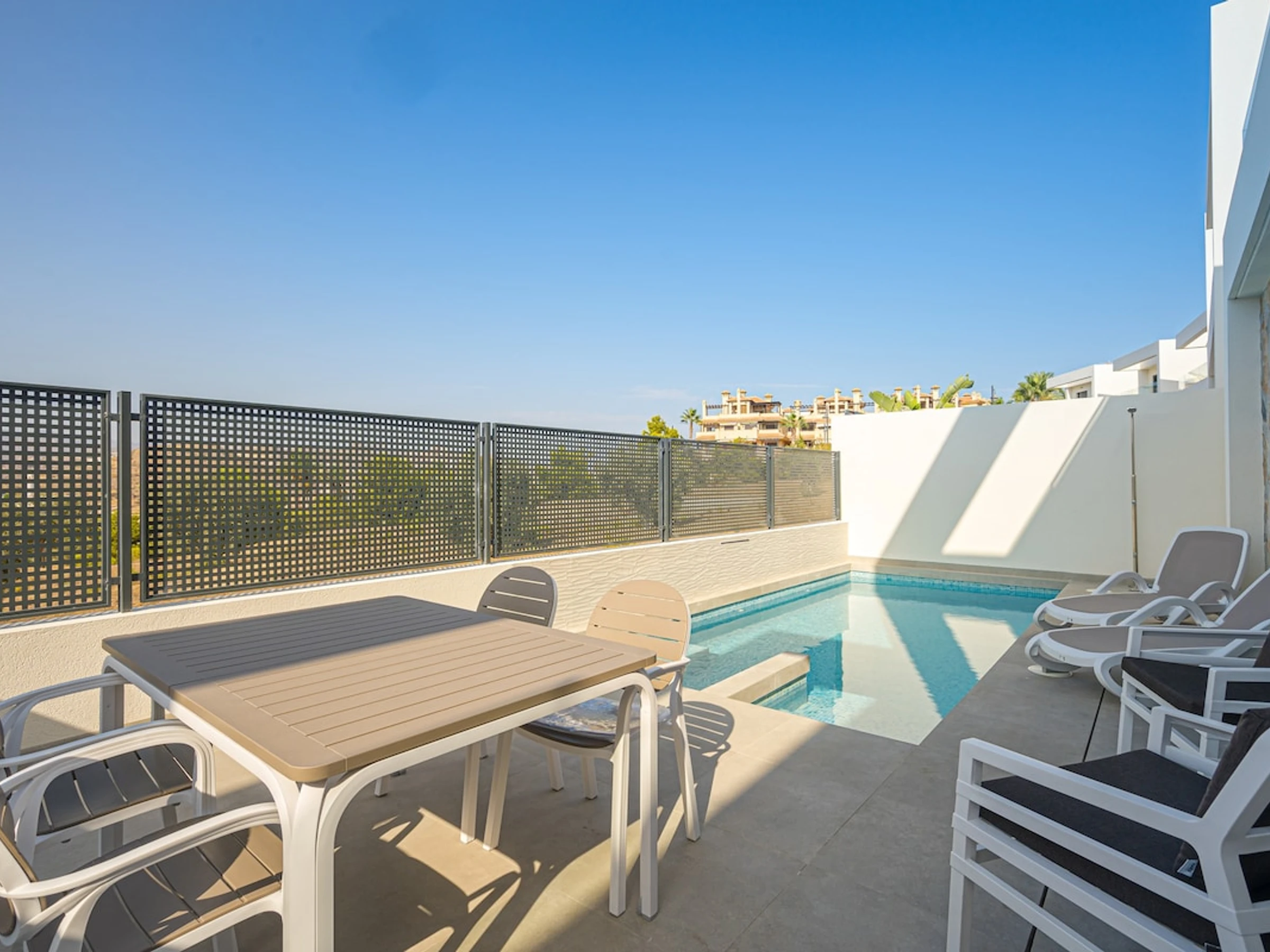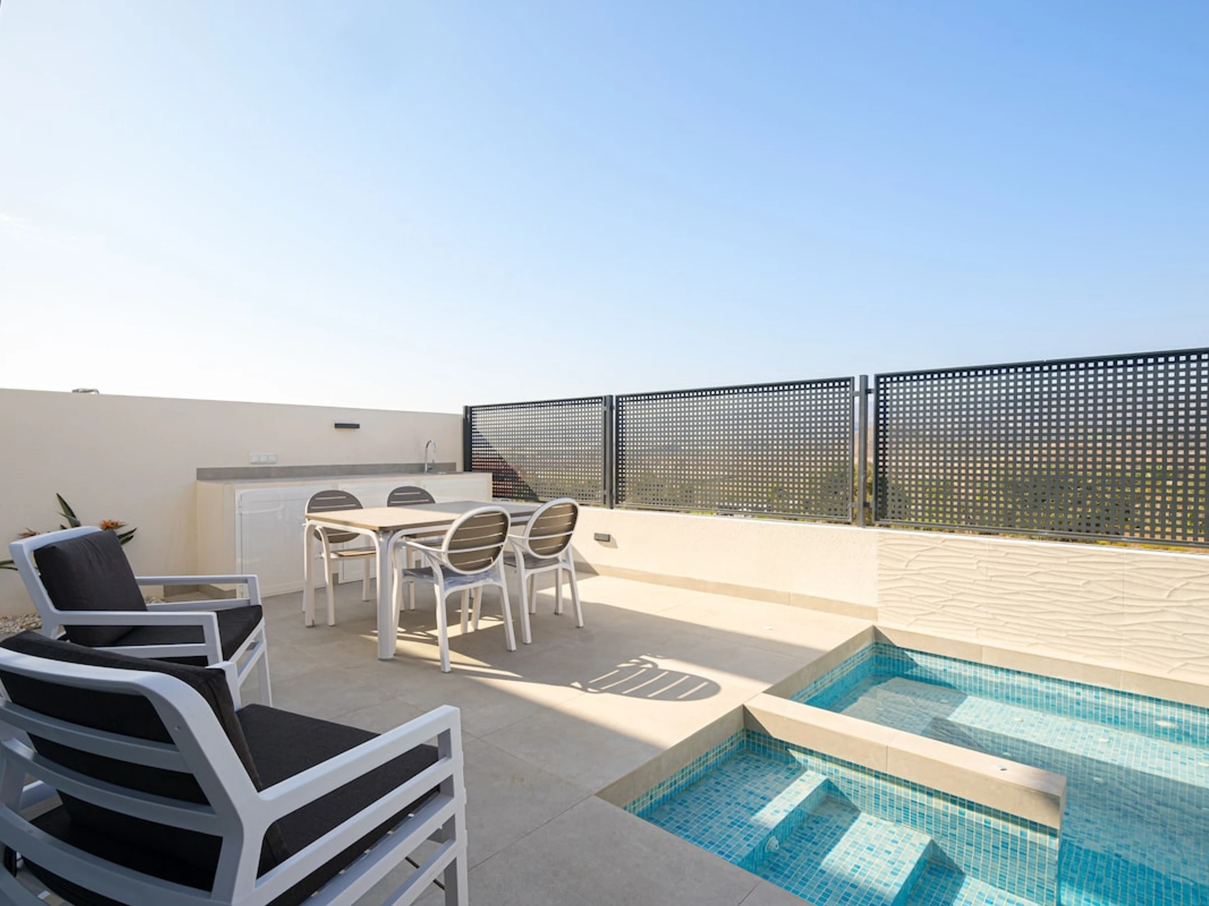 Die Unterkunft verfügt über garten, gartenmöbel, umzäuntes grundstück, 70 m² terrasse, waschmaschine, trockner, bügeleisen/-brett, internet (WLAN), haartrockner, elektroheizung, klimaanlage, swimming-pool privater pool, 1 Fernseher, sat-tv (Sprachen: Spanisch).