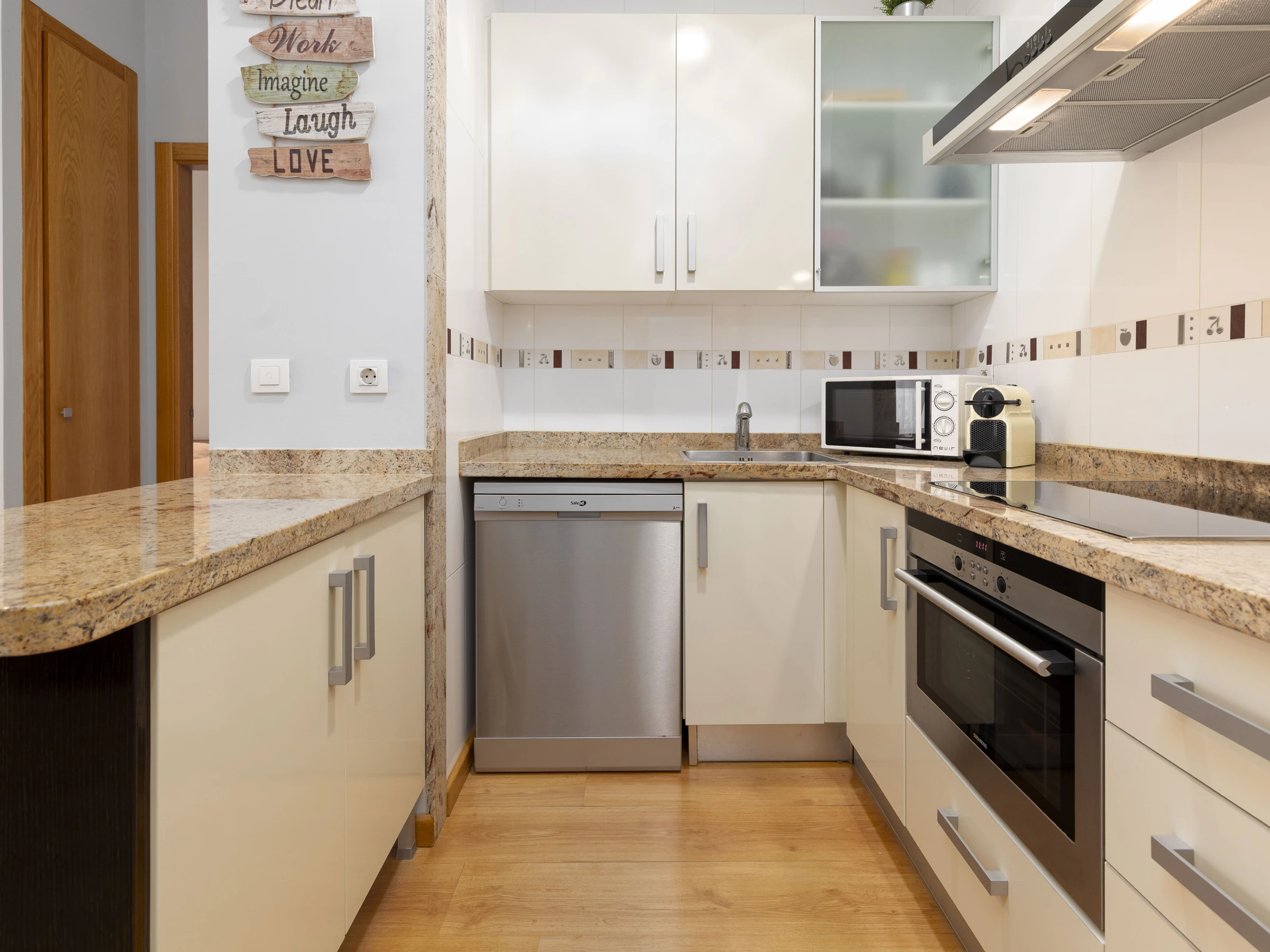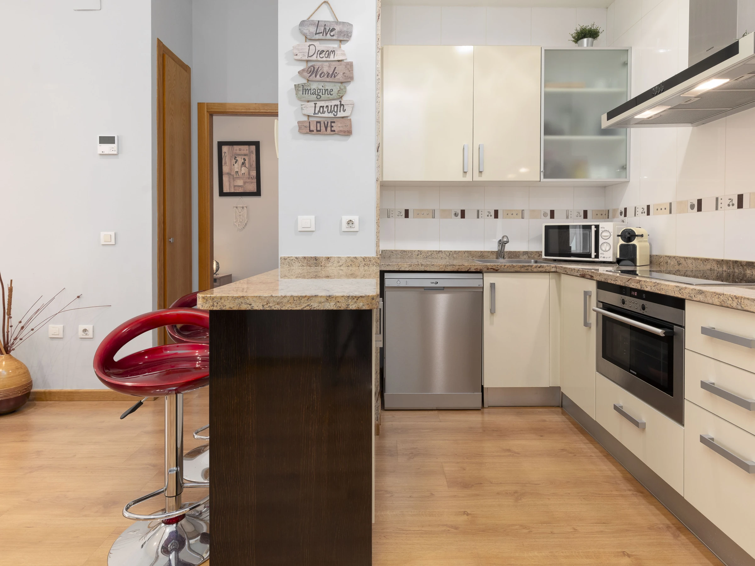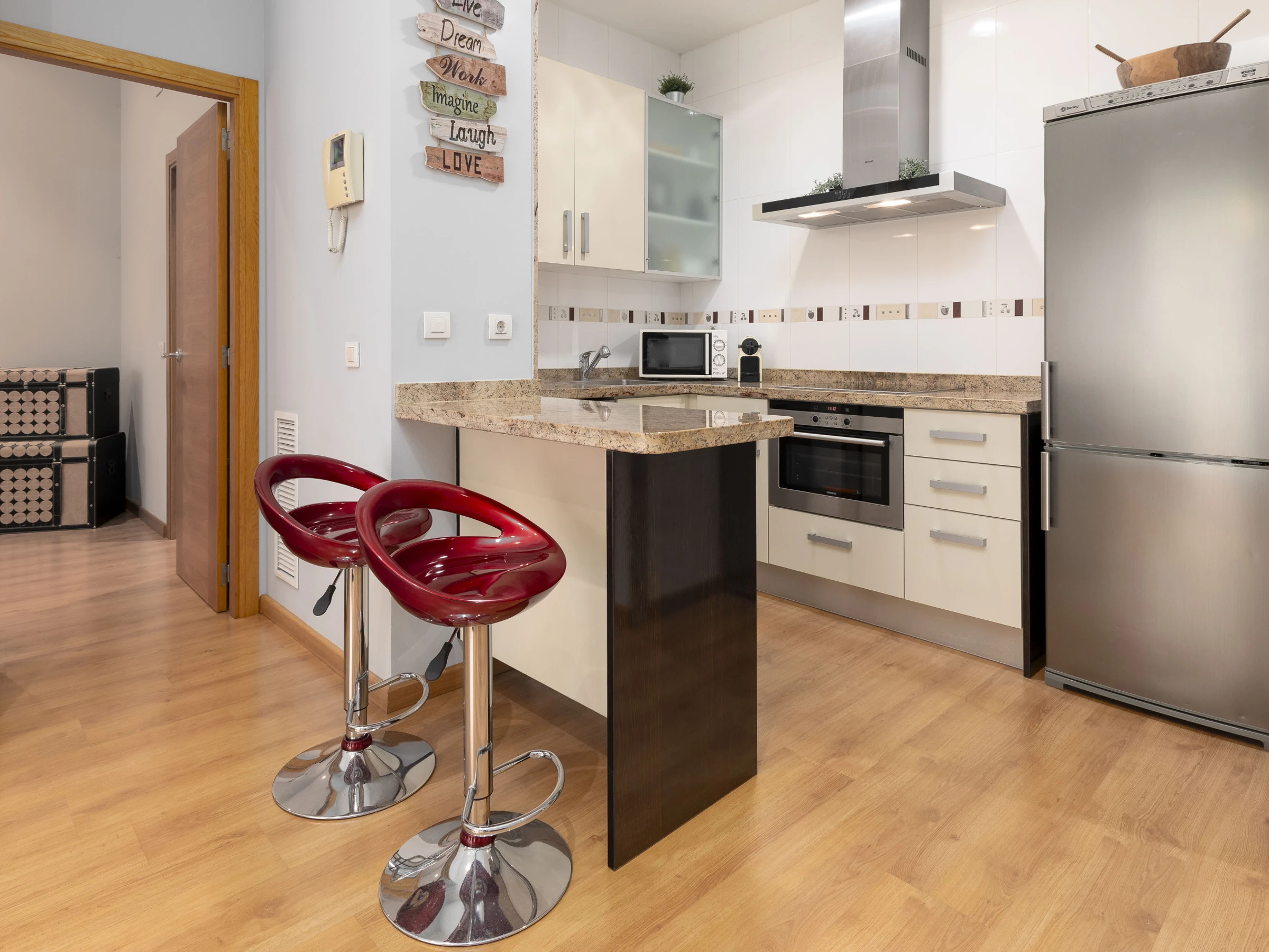 Dieses offene küche, mit ceranfeld, ist ausgestattet in kühlschrank, mikrowelle, backofen, gefrierschrank, spülmaschine, geschirr/besteck, kochutensilien, kaffeemaschine, toaster, wasserkocher und saftpresse.