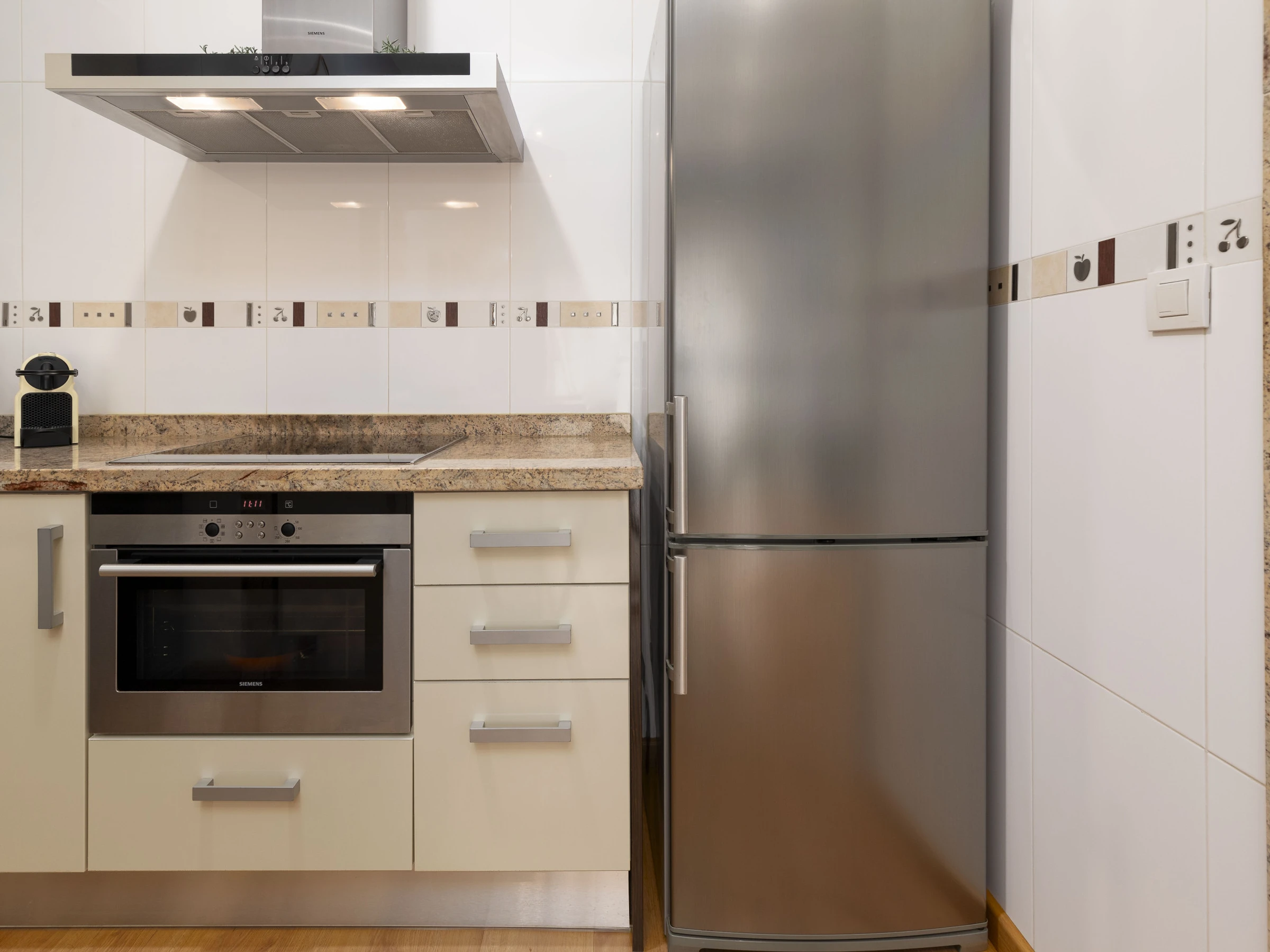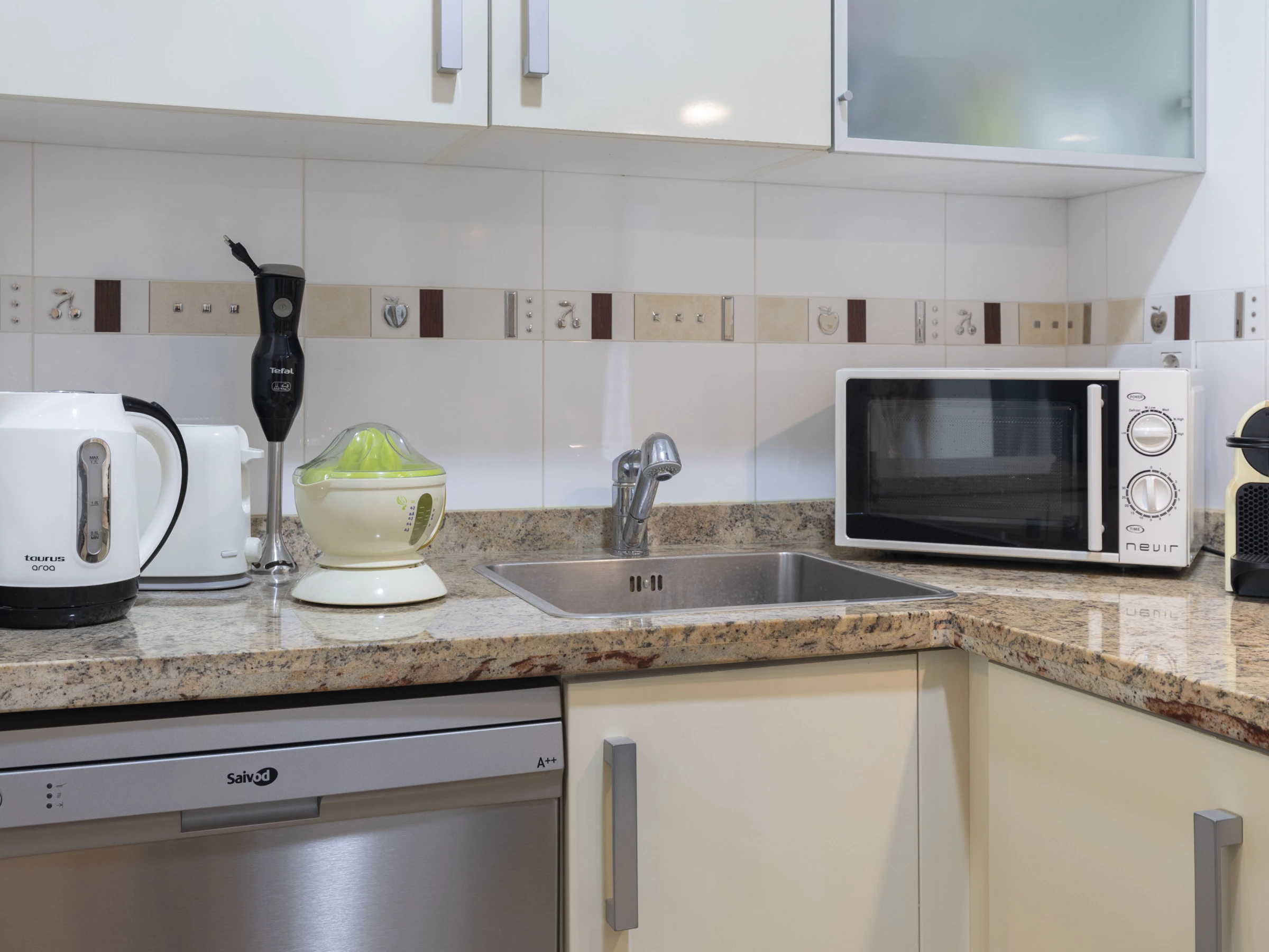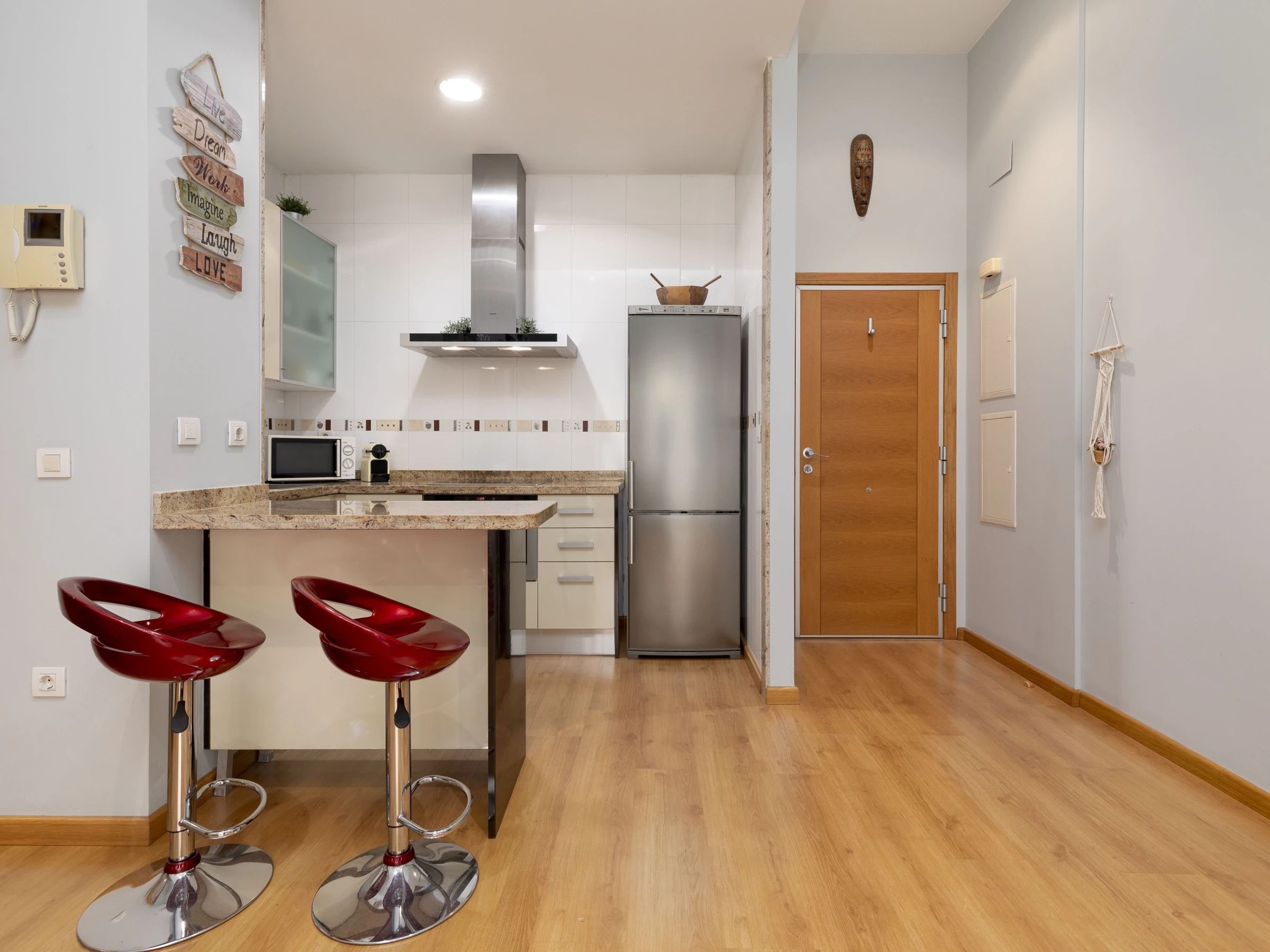 Dieses offene küche, mit ceranfeld, ist ausgestattet in kühlschrank, mikrowelle, backofen, gefrierschrank, spülmaschine, geschirr/besteck, kochutensilien, kaffeemaschine, toaster, wasserkocher und saftpresse.