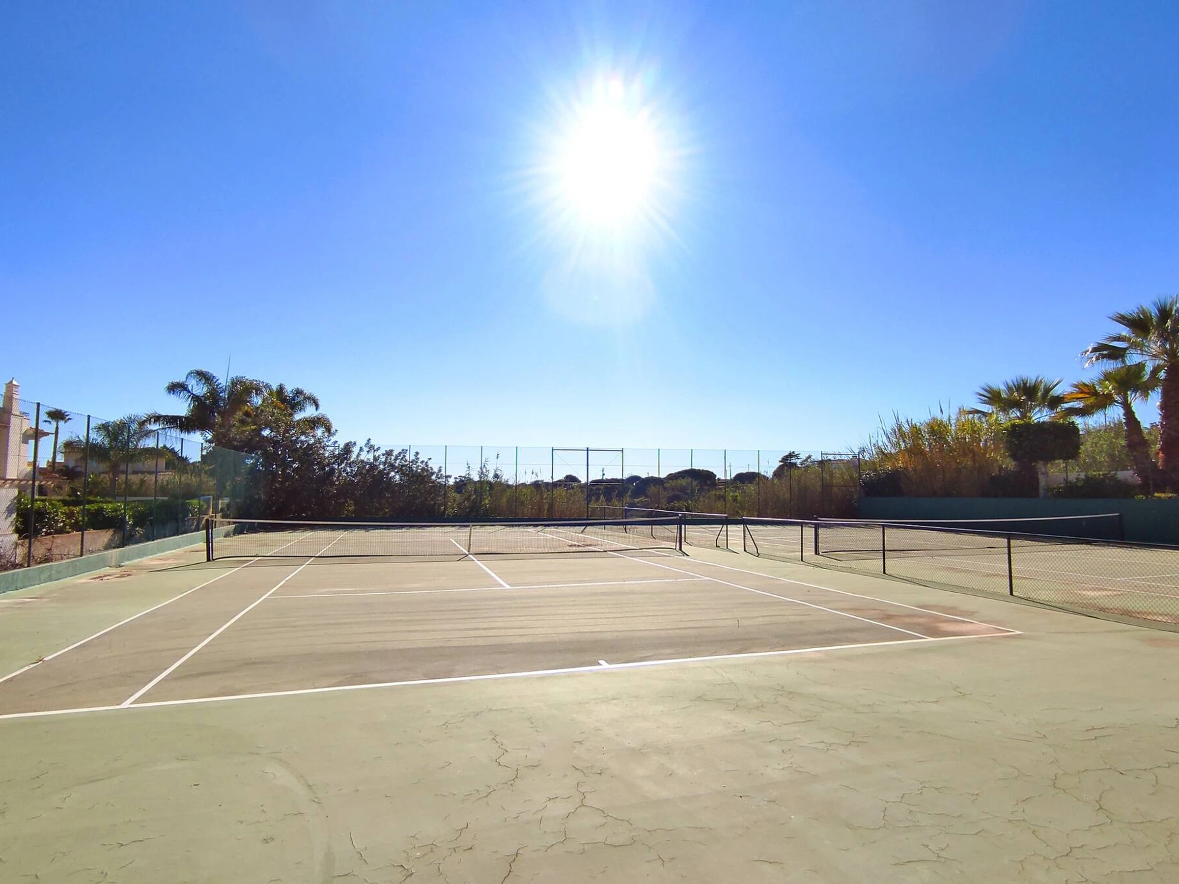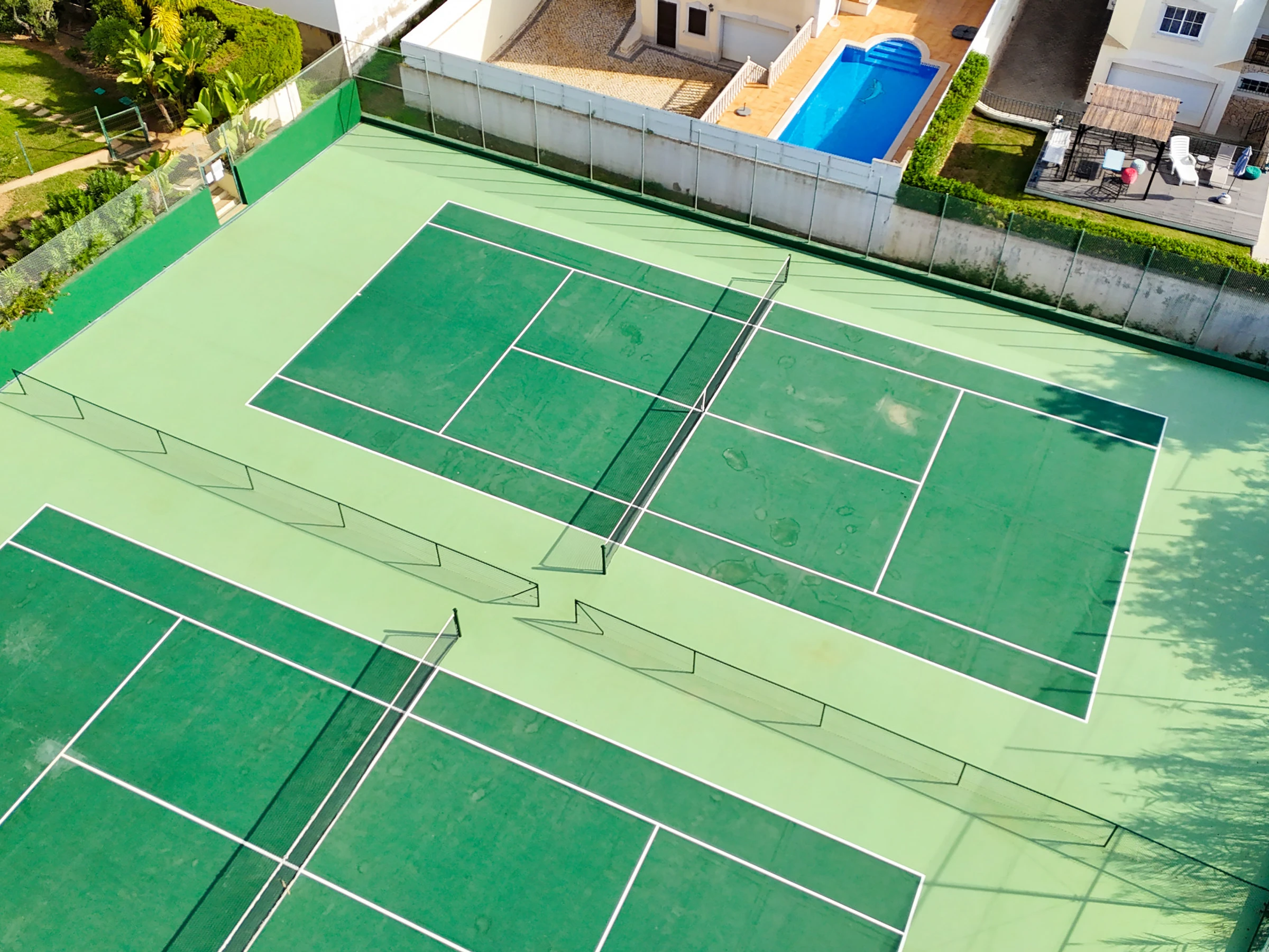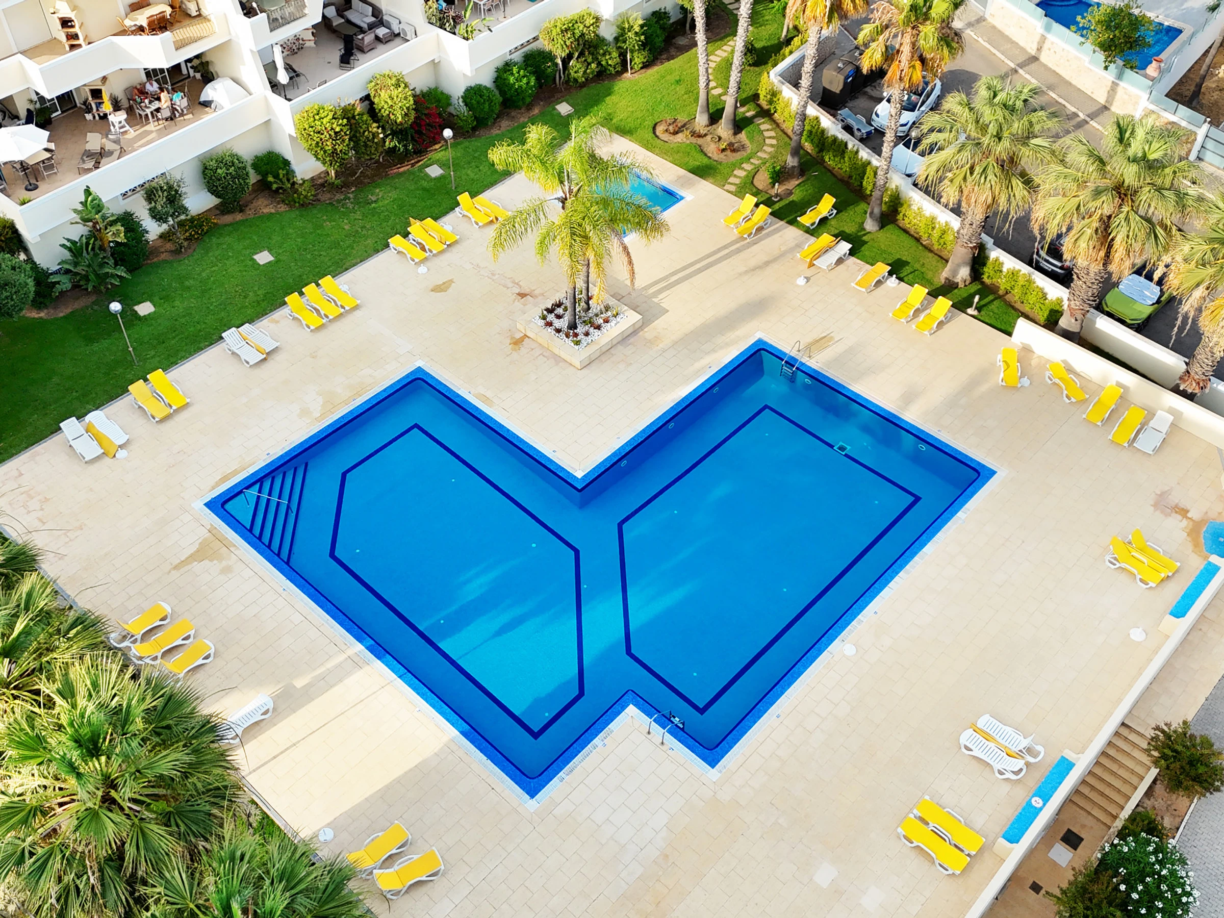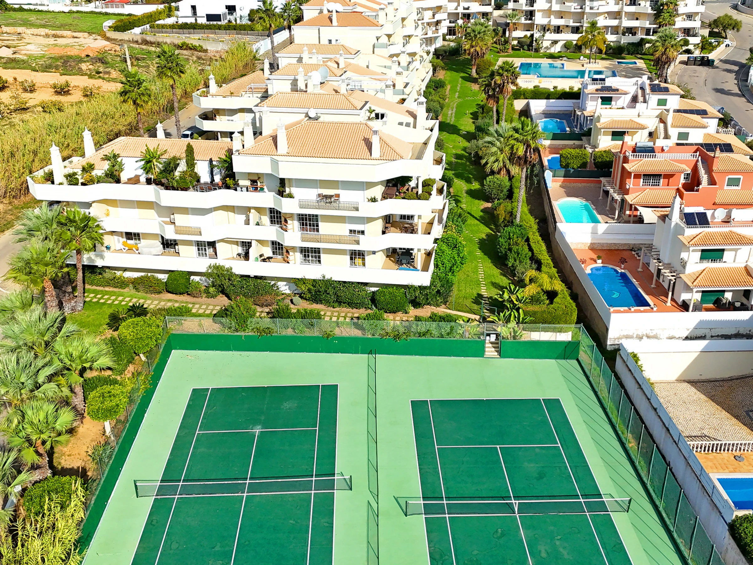 Großer L-förmiger Outdoor-Infinity-Swimmingpool, Kinderbecken, zwei Tennisplätze und ein sehr gut gepflegter Gemeinschaftsgarten mit zahlreichen Sonnenliegen.