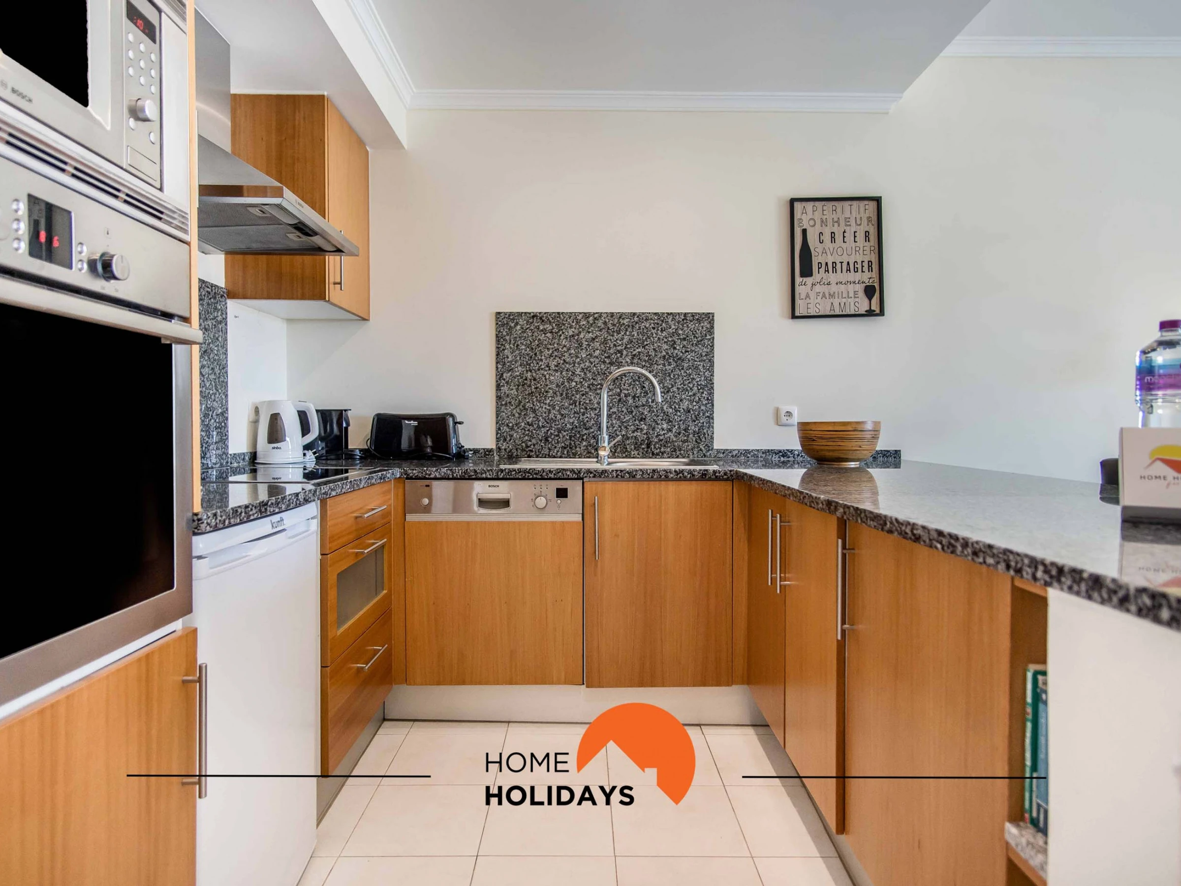 Dieses offene küche, mit gemixt: gas und elektrisch, ist ausgestattet in kühlschrank, mikrowelle, backofen, gefrierschrank, spülmaschine, geschirr/besteck, kochutensilien, kaffeemaschine, toaster, wasserkocher und herdplatte.