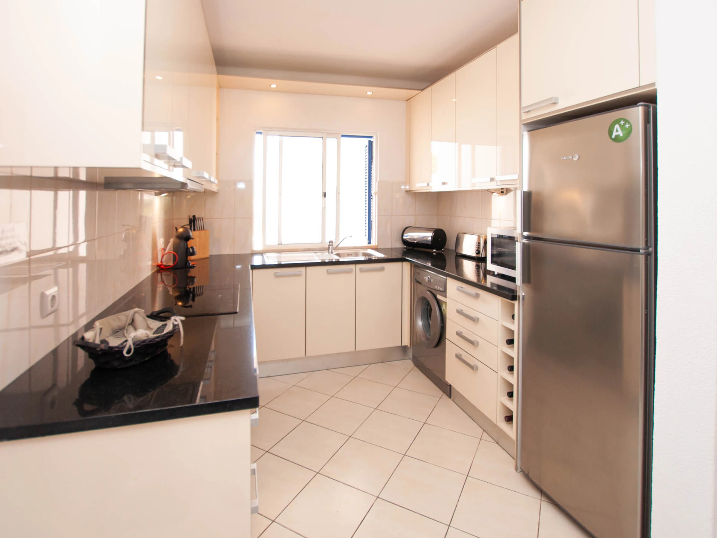 Dieses offene küche, mit ceranfeld, ist ausgestattet in kühlschrank, mikrowelle, backofen, gefrierschrank, spülmaschine, geschirr/besteck, kochutensilien, kaffeemaschine, toaster, wasserkocher und saftpresse.