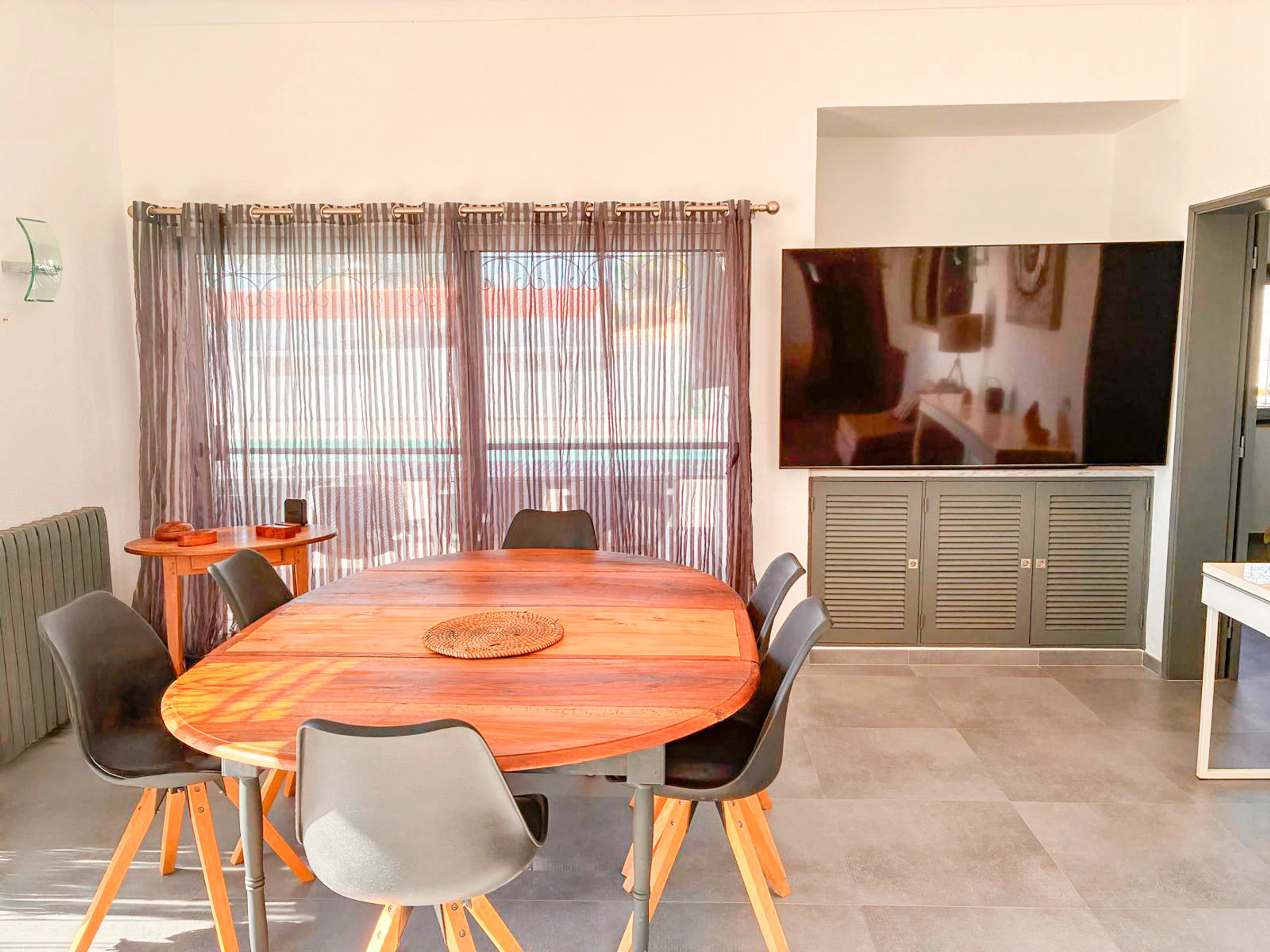 Das Wohn- und Esszimmer präsentiert eine gemütliche und gut verteilte Umgebung, ideal für Momente des Zusammenlebens im Laufe des Tages, mit harmonischer Verbindung zu den übrigen Bereichen des Hauses und den Außenzonen.
