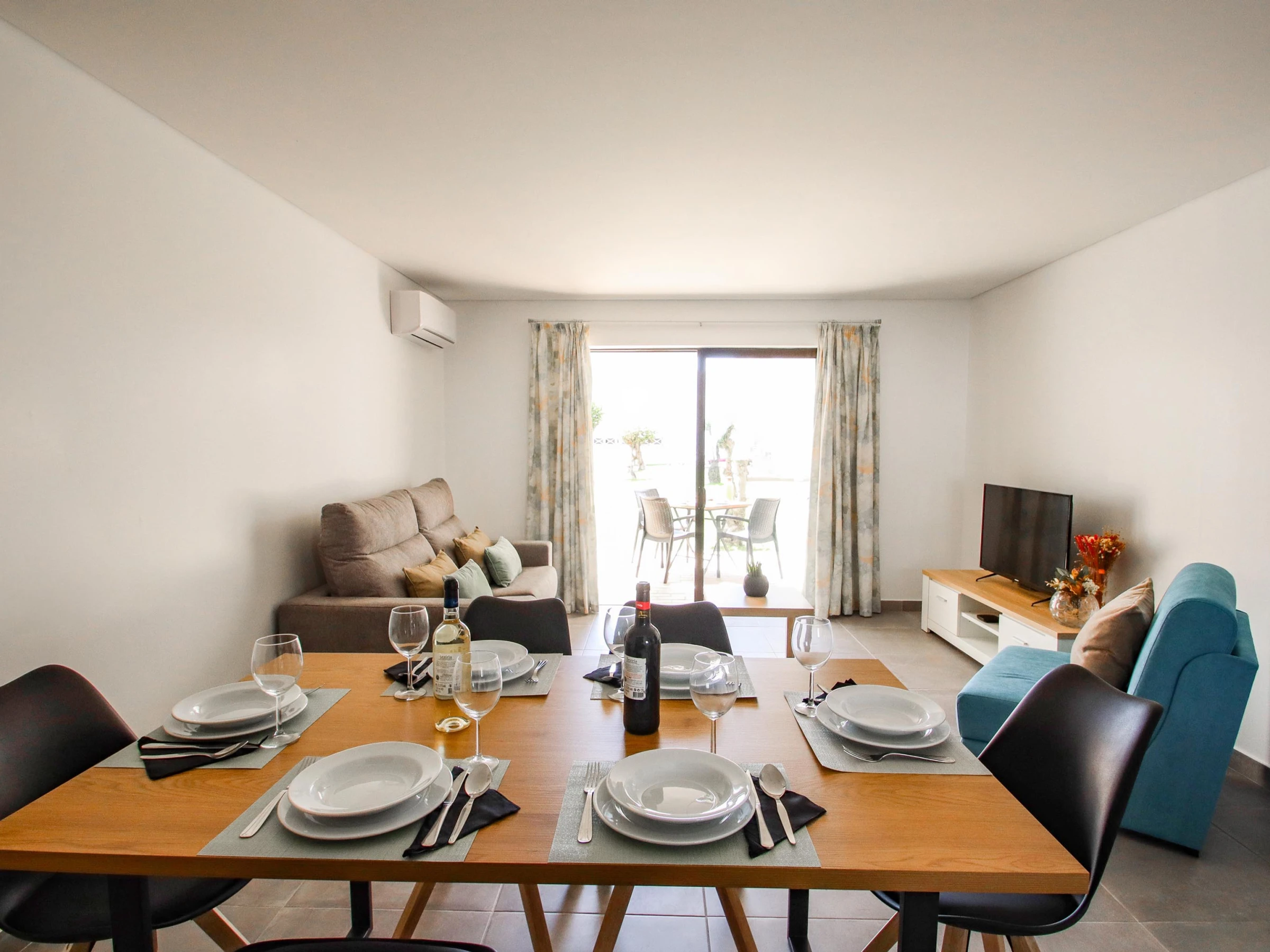 Das Wohnzimmer, geräumig und hell, lädt zur Erholung ein und integriert harmonisch den Essbereich und schafft eine perfekte Umgebung für Momente des Zusammenseins. Der direkte Zugang zur Terrasse bietet den idealen Raum, um Mahlzeiten im Freien zu genießen oder einfach unter der Algarve-Sonne zu entspannen.
