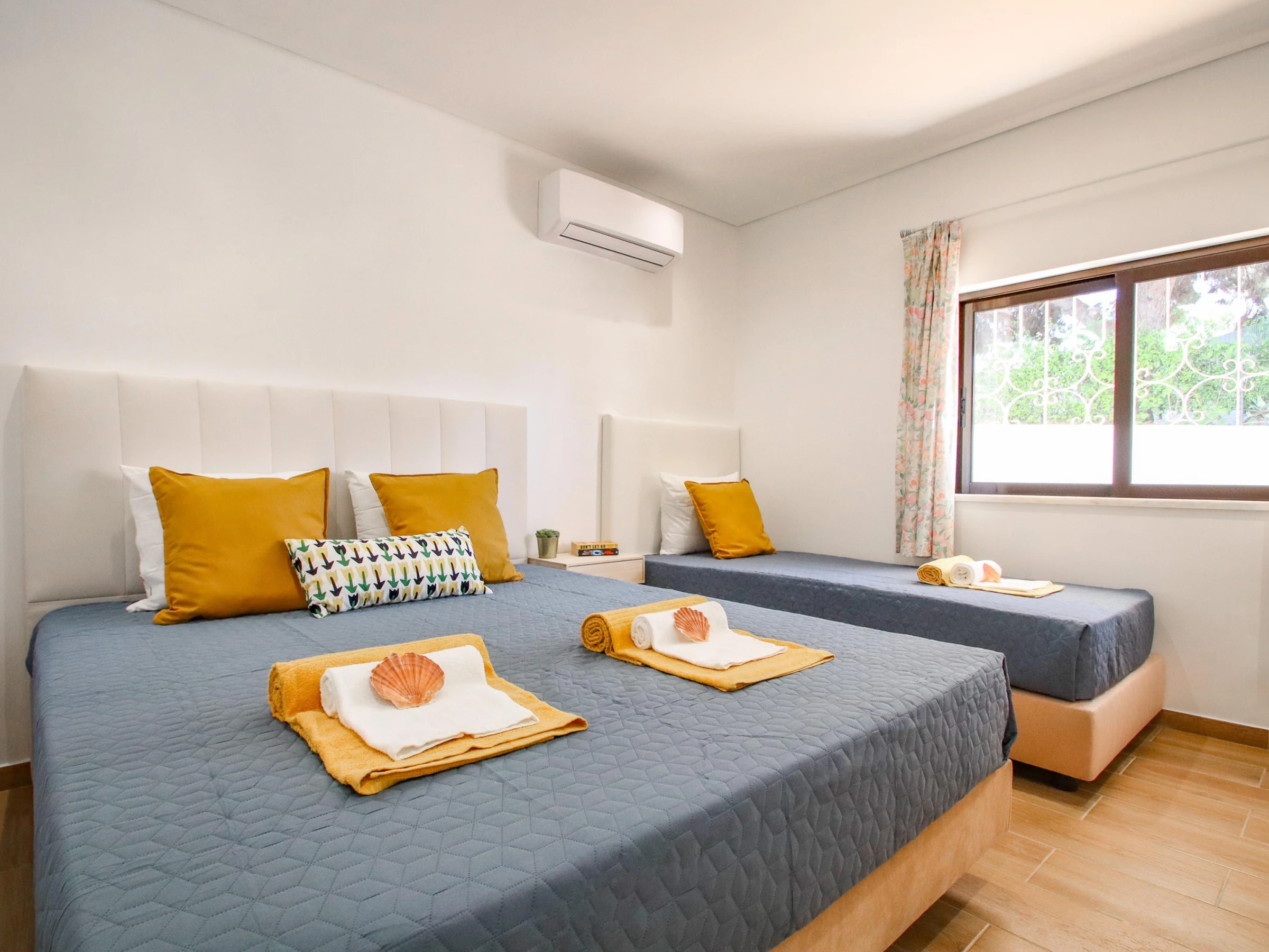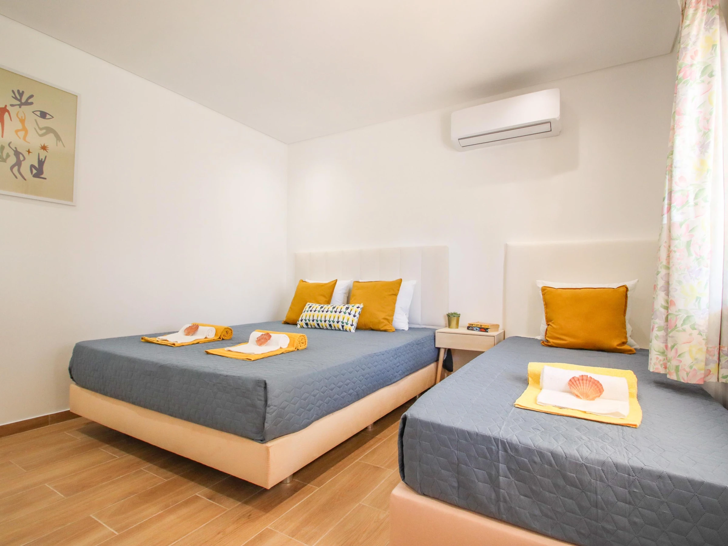Die Wohnung verfügt über ein komfortables Schlafzimmer, möbliert mit einem Doppelbett und einem Einzelbett, ergänzt durch ein privates Badezimmer. Es gibt zudem ein zweites Badezimmer mit Dusche, was während des Aufenthalts mehr Komfort gewährleistet.
