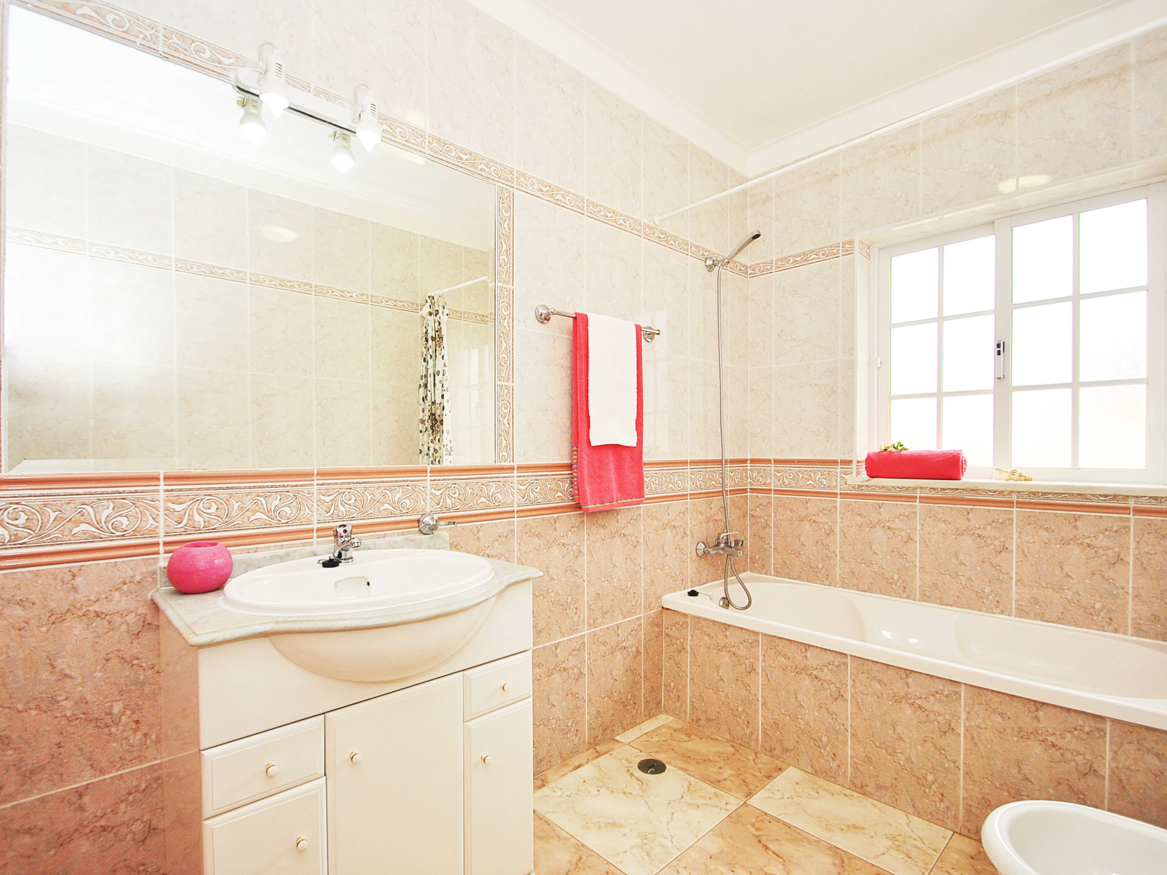 Im Erdgeschoss befindet sich ein Badezimmer mit Badewanne, praktisch zur Unterstützung der gemeinsamen Bereiche des Hauses.