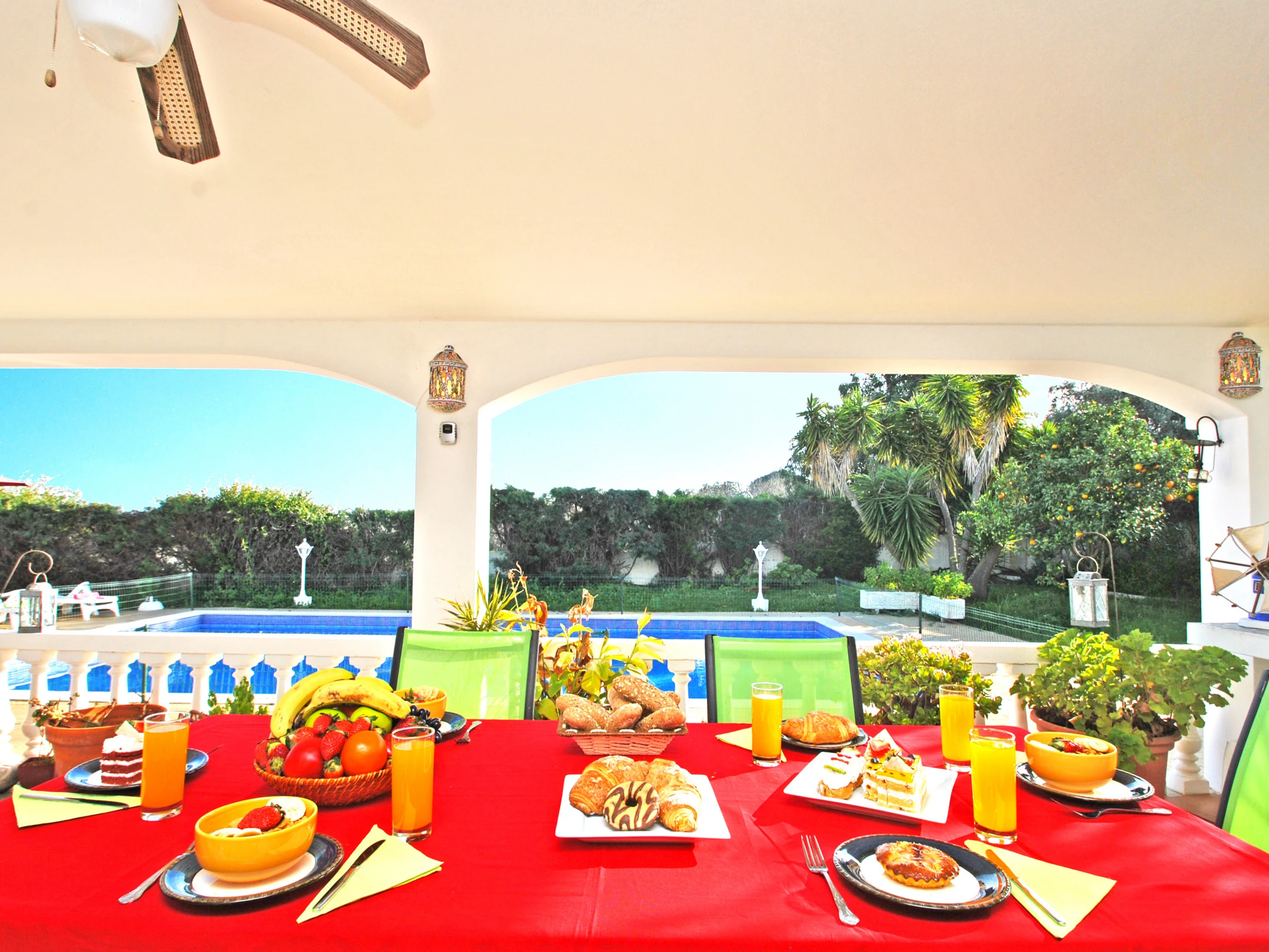 Eine Villa verfügt über 4 Zimmer (2 Doppelzimmer und 2 Zweibettzimmer), 3 Badezimmer (eines davon barrierefrei für Menschen mit eingeschränkter Mobilität) und eine Waschküche. Die Küche ist vollständig ausgestattet mit Kühlschrank, Spülmaschine, Mikrowelle, Backofen, Herd, Küchenutensilien, Wasserkocher und Toaster. Der geräumige Wohn-/Essbereich bietet einen gemütlichen Raum mit direktem Zugang zur Terrasse, Grillbereich und Essbereich im Freien mit Blick auf den Pool.