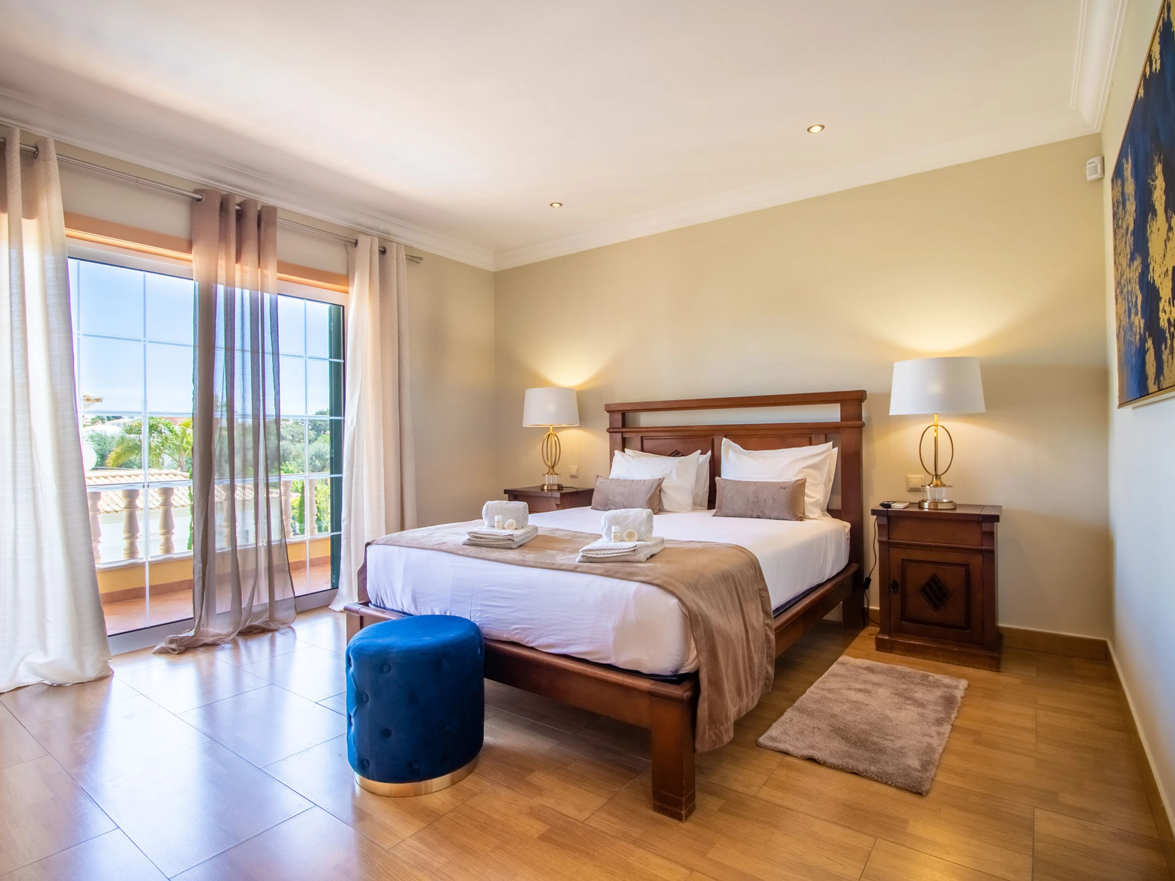 Die Unterkunft verfügt über garten, gartenmöbel, umzäuntes grundstück, 100 m² terrasse, waschmaschine, grill, kamin, bügeleisen/-brett, safe, internet (WLAN), haartrockner, balkon, heizung, klimaanlage, swimming-pool privater pool, parkplatz im freien in auf dem grundstück, 6 Fernsehgeräte, sat-tv (Sprachen: Englisch).