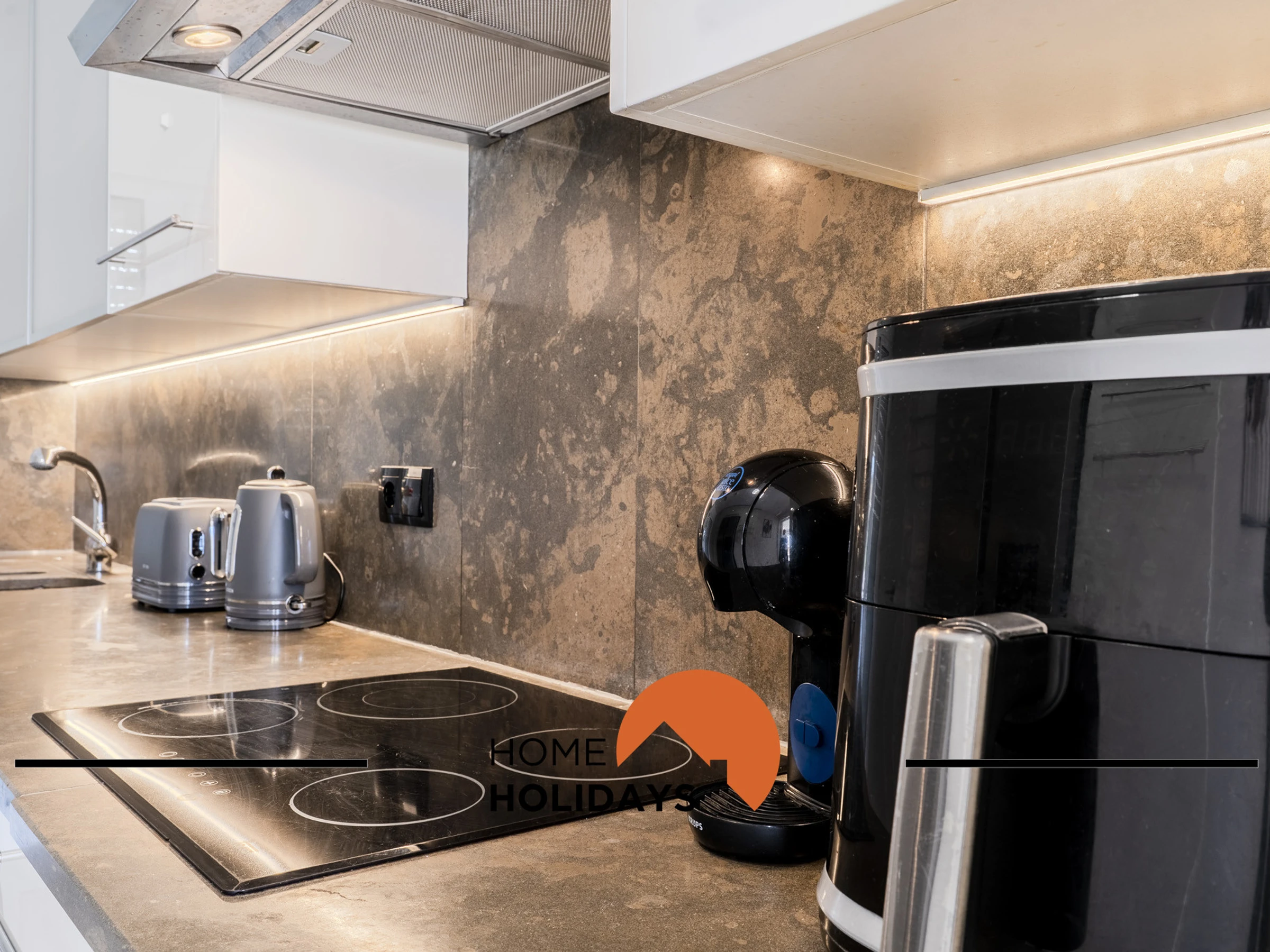 Dieses separate küche, elektrisches kochfeld, ist ausgestattet in kühlschrank, mikrowelle, backofen, gefrierschrank, spülmaschine, geschirr/besteck, kochutensilien, kaffeemaschine, friteuse, toaster, wasserkocher, teller und schüsseln, herdplatte.