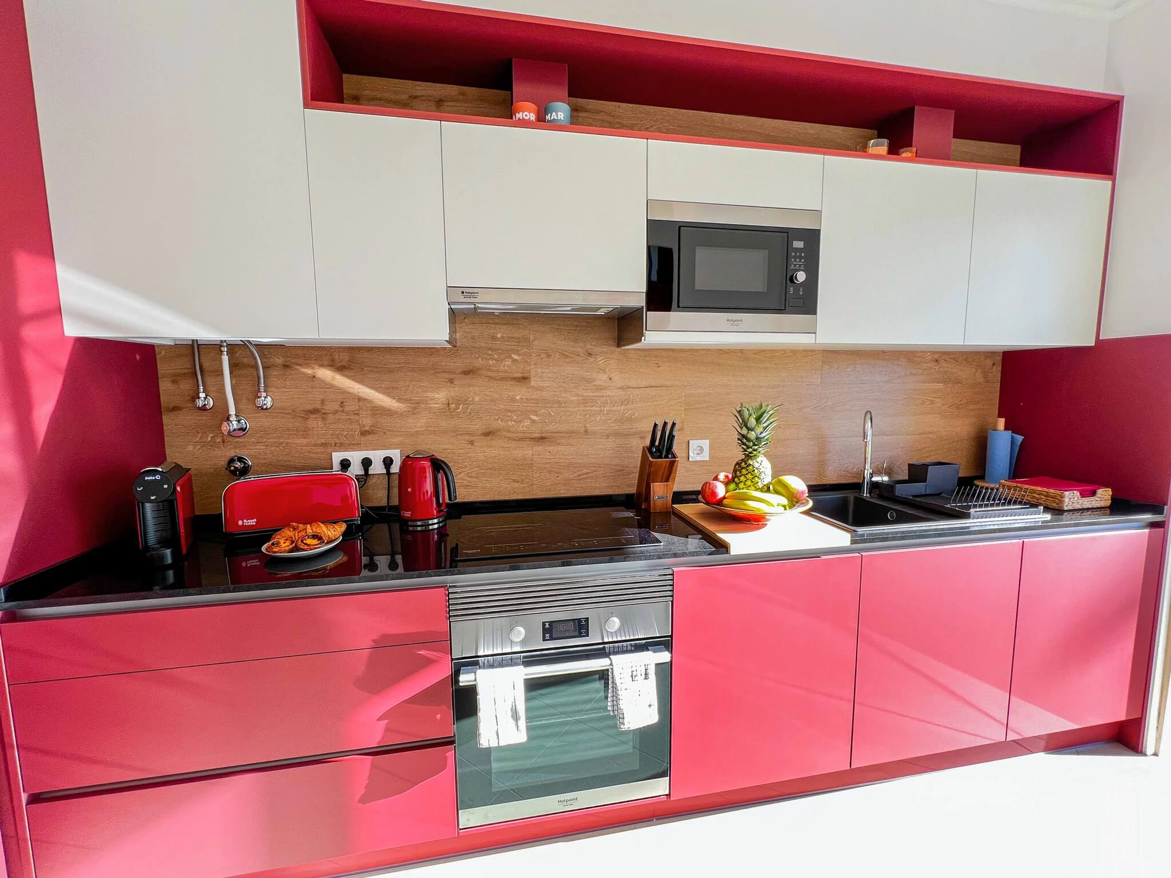 Die voll ausgestattete Küche, einschließlich integriertem Geschirrspüler und Waschmaschine, Frühstückstheke/Arbeitsstation und Terrassentüren, die zur Terrasse führen.