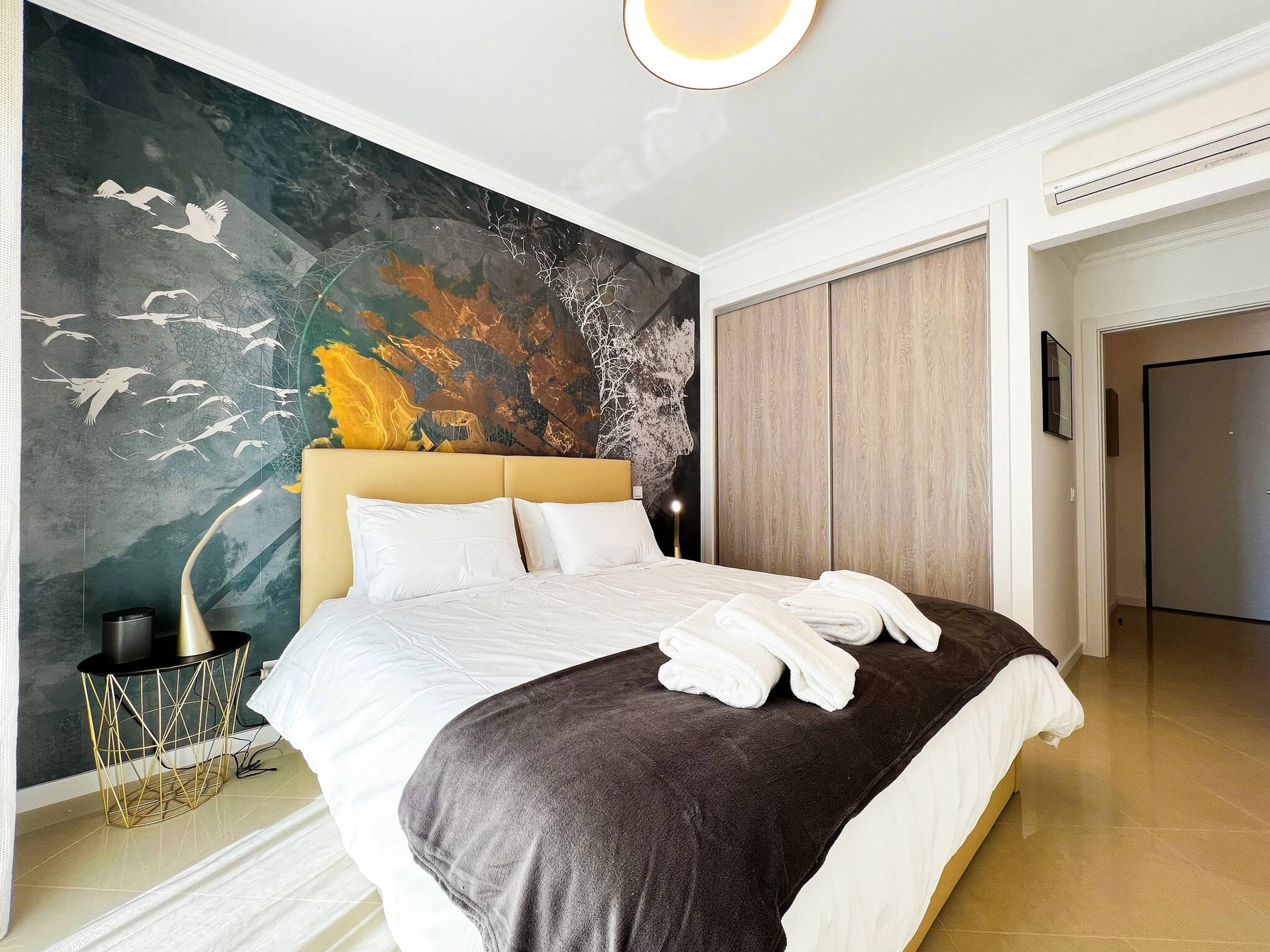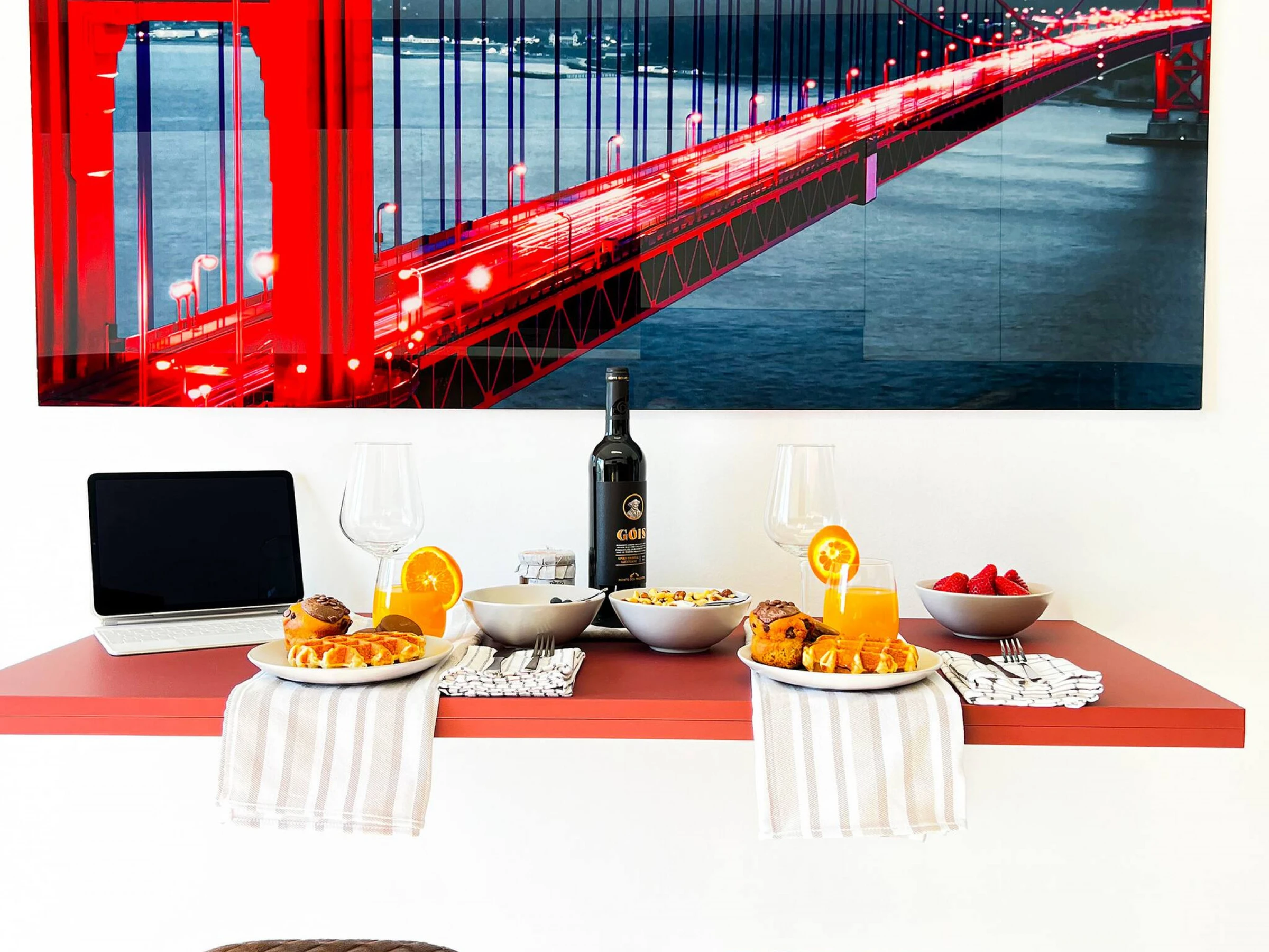 Die Wohnung bietet einen großen und geschmackvoll eingerichteten offenen Wohn- und Essbereich, einschließlich 55" 8K-Smart-TV, Soundbar und Terrassentüren, die zur geräumigen, vollständig möblierten Terrasse führen.