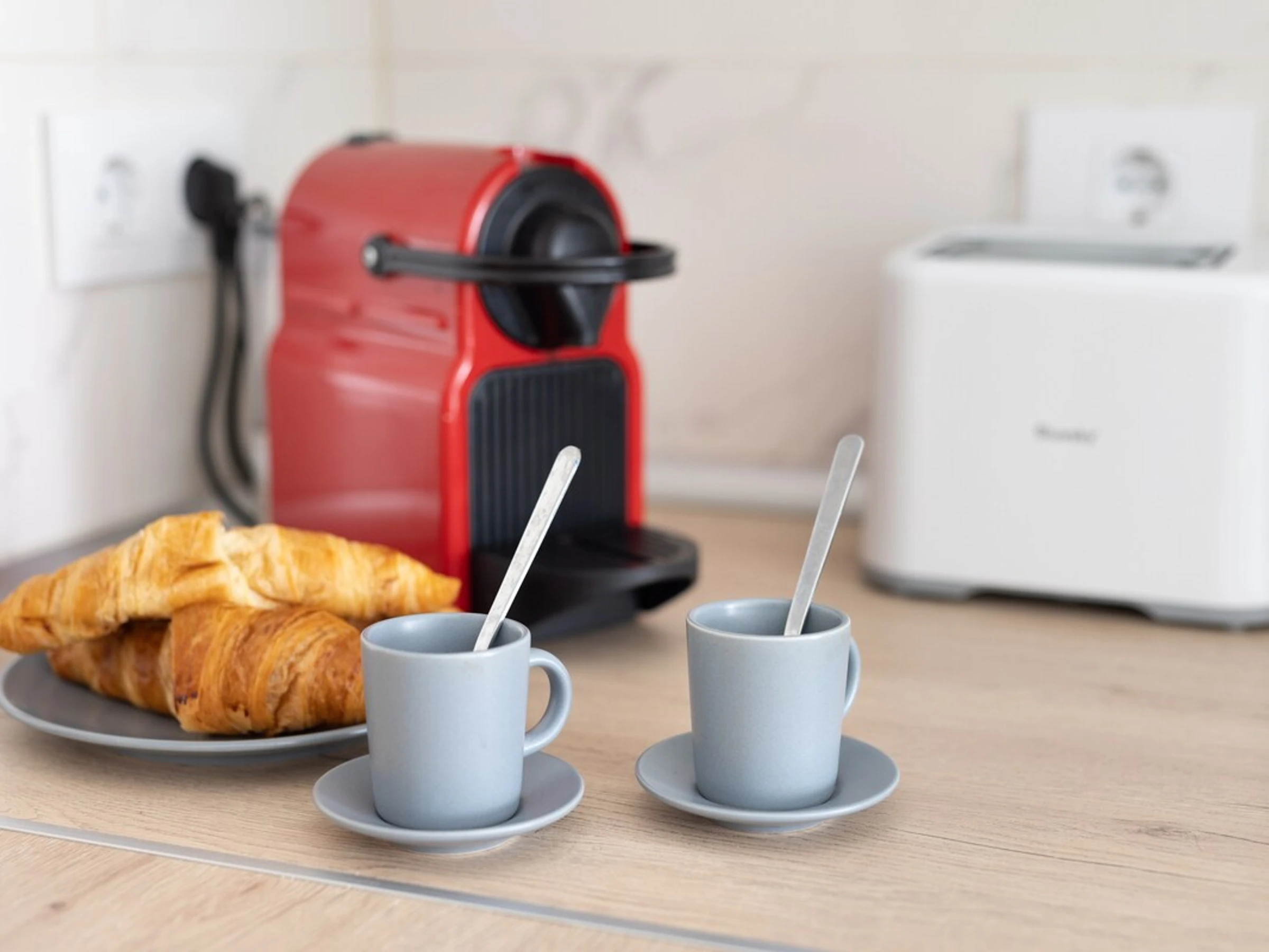 Dieses küche, ist ausgestattet in mikrowelle, backofen, kochutensilien und kaffeemaschine.