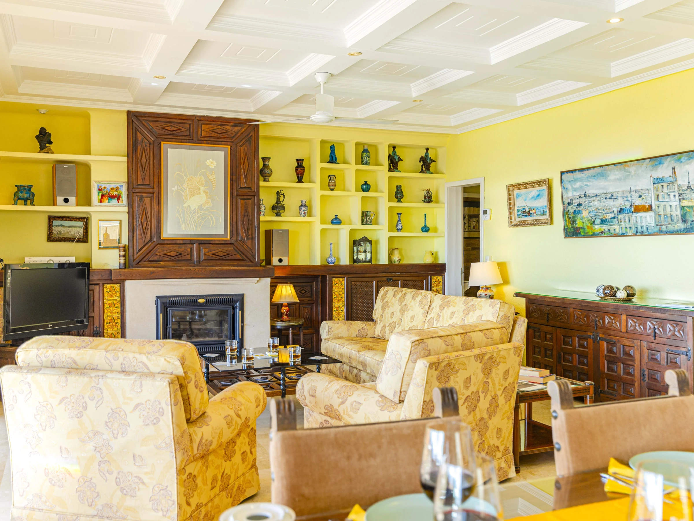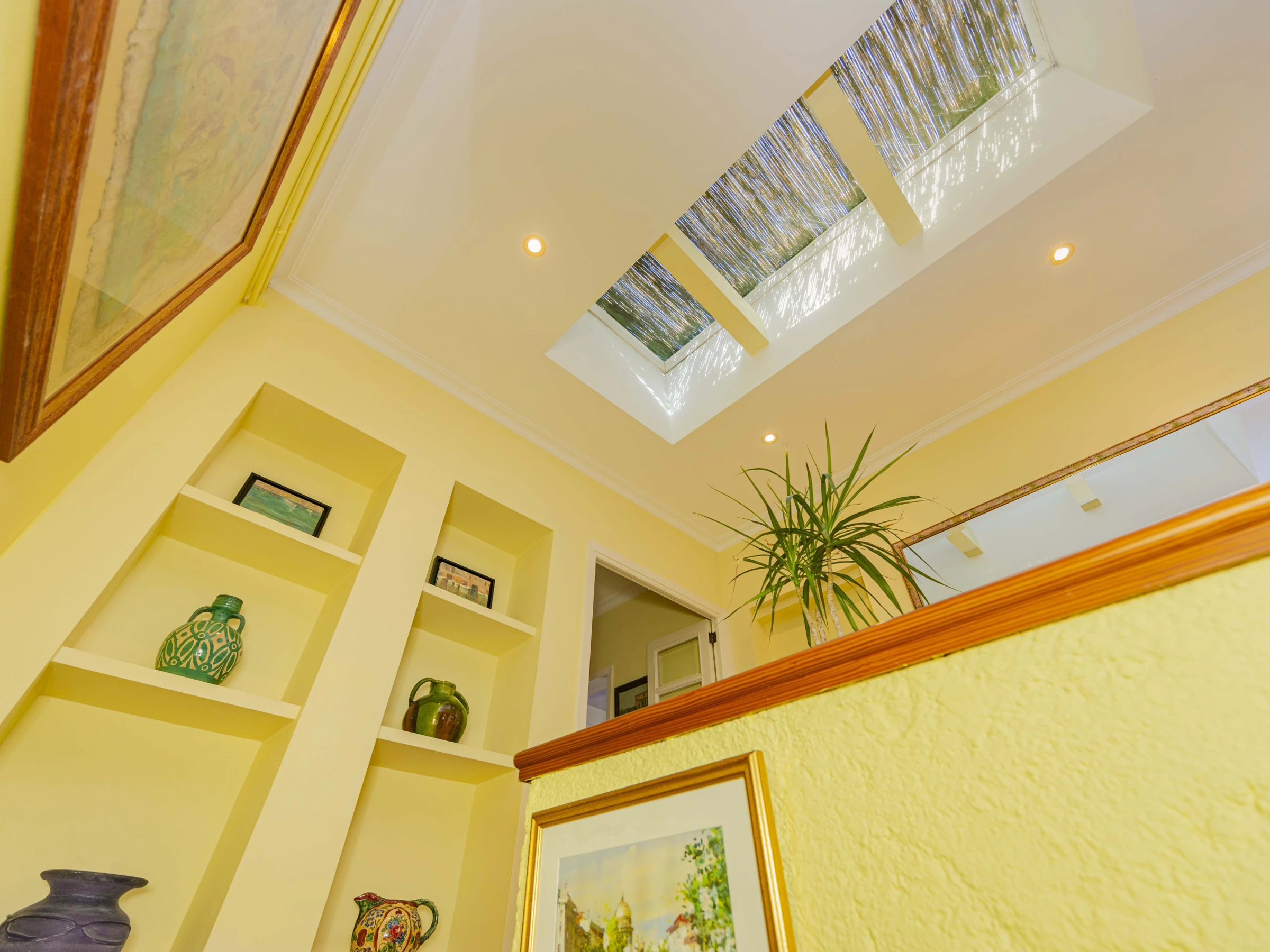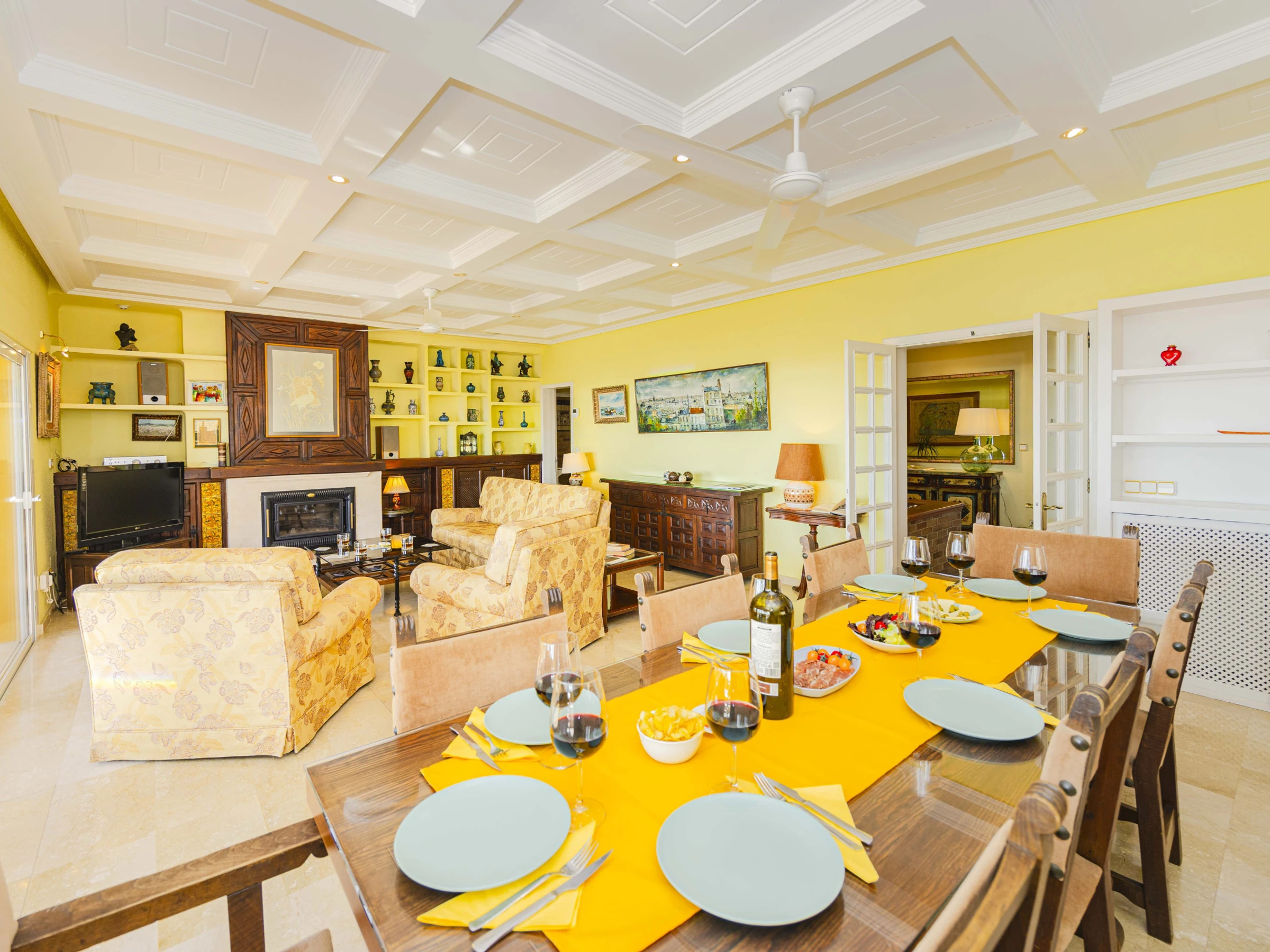 Im oberen Stockwerk befinden sich das Wohnzimmer und der Essbereich mit Zugang zu einer großen Terrasse sowie die voll ausgestattete Küche. Drei Schlafzimmer mit zwei Badezimmern ergänzen diese Ebene. Im Erdgeschoss liegt ein weiteres Schlafzimmer mit direktem Zugang zum Garten, ein weiterer Wohn- und Essbereich sowie eine zusätzliche Küche. Von hier gelangt man unmittelbar zur Poolzone und den Außenbereichen.
