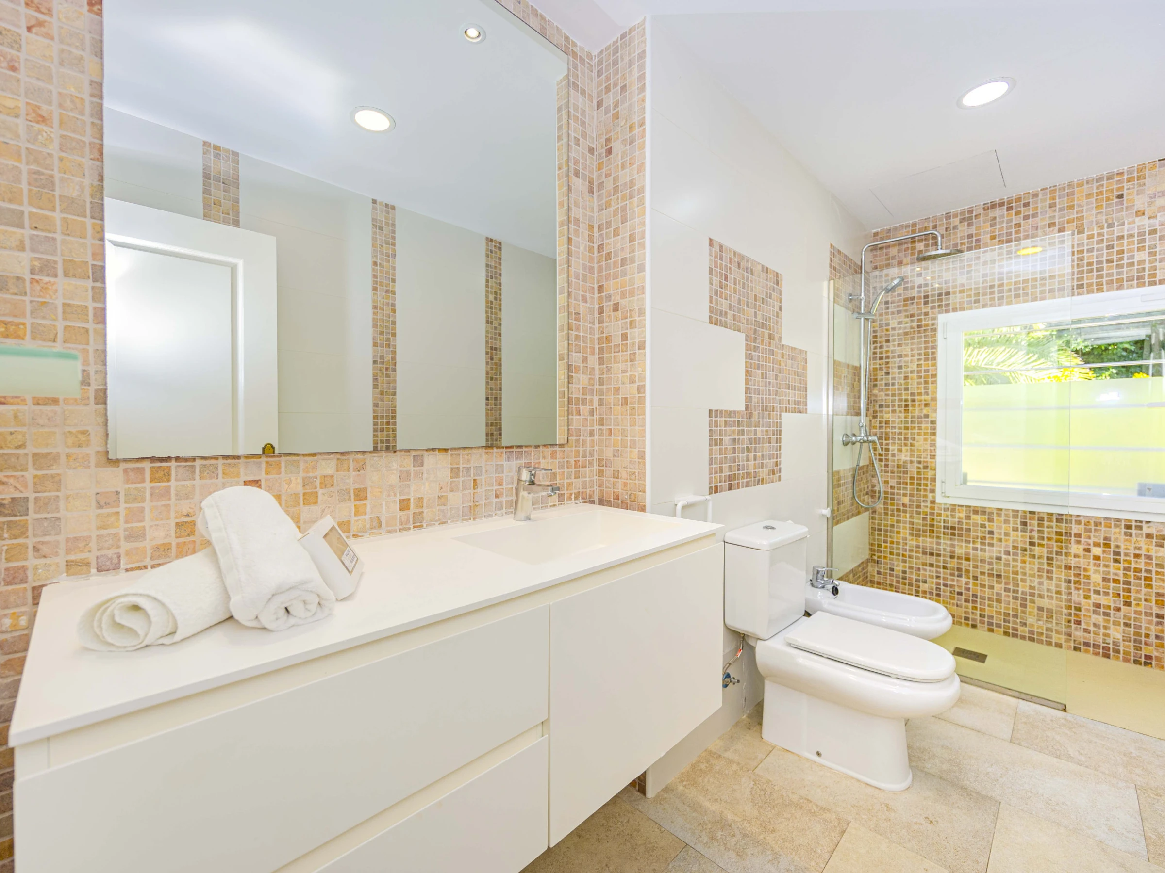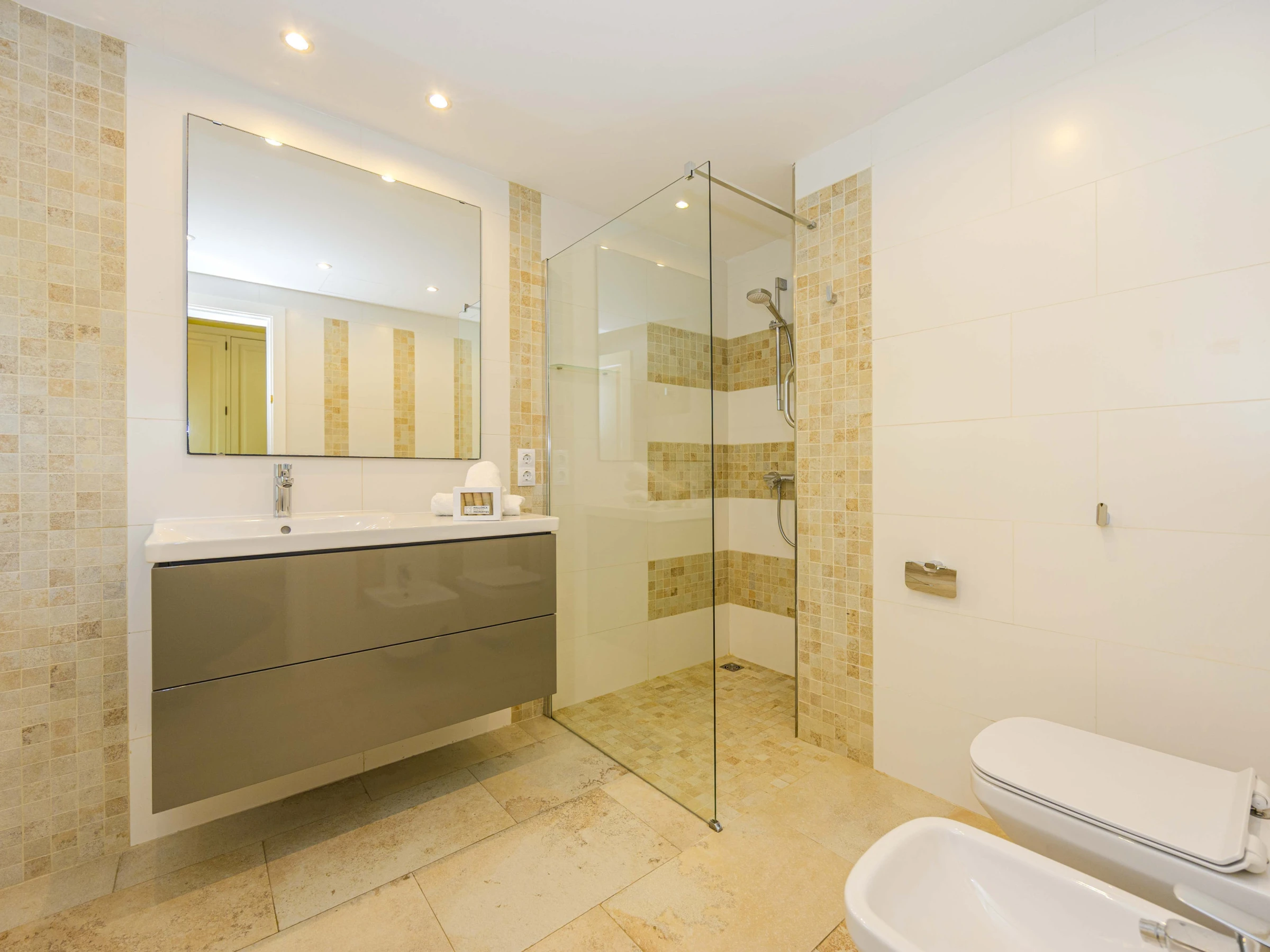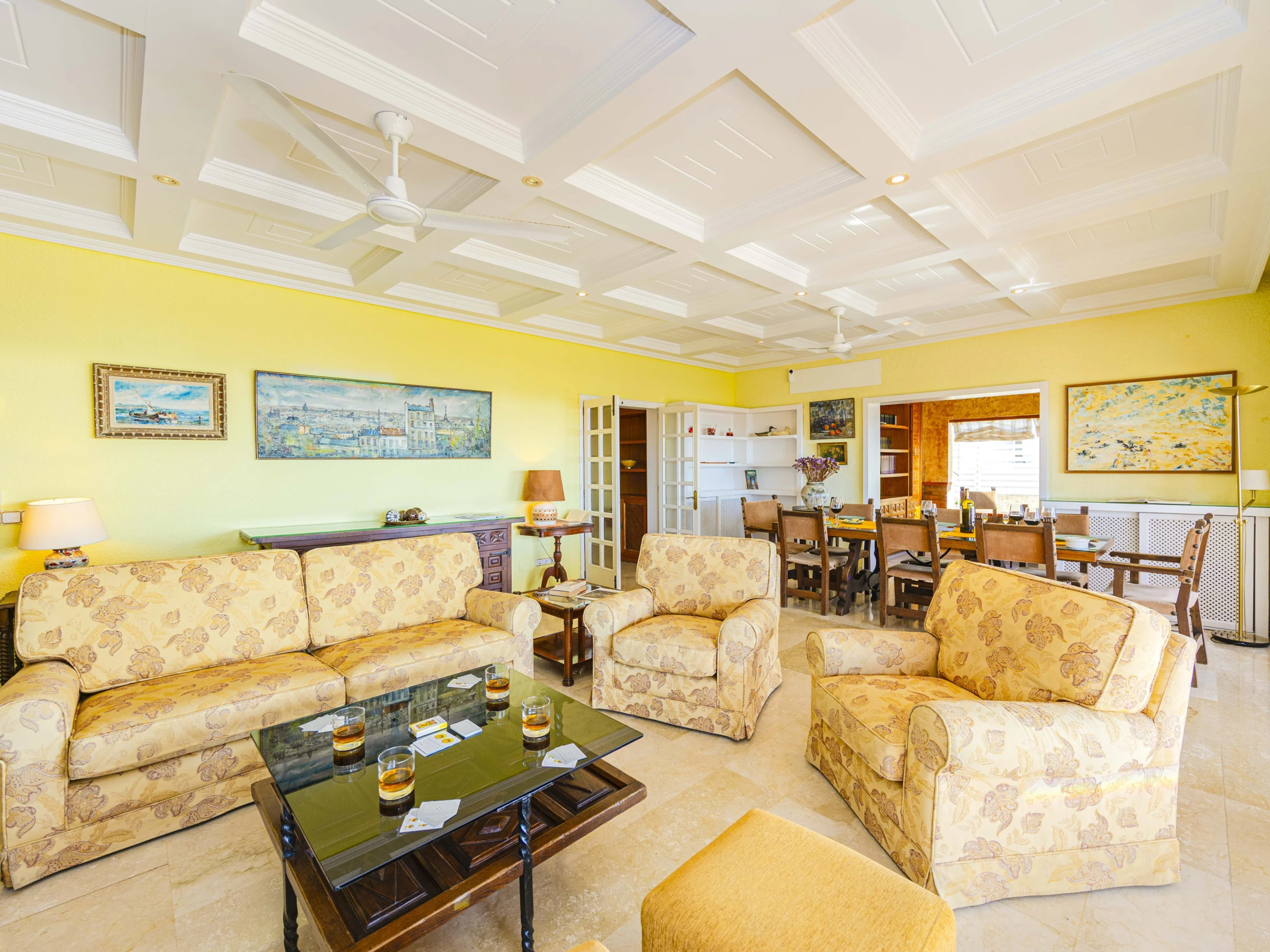 Im oberen Stockwerk befinden sich das Wohnzimmer und der Essbereich mit Zugang zu einer großen Terrasse sowie die voll ausgestattete Küche. Drei Schlafzimmer mit zwei Badezimmern ergänzen diese Ebene. Im Erdgeschoss liegt ein weiteres Schlafzimmer mit direktem Zugang zum Garten, ein weiterer Wohn- und Essbereich sowie eine zusätzliche Küche. Von hier gelangt man unmittelbar zur Poolzone und den Außenbereichen.