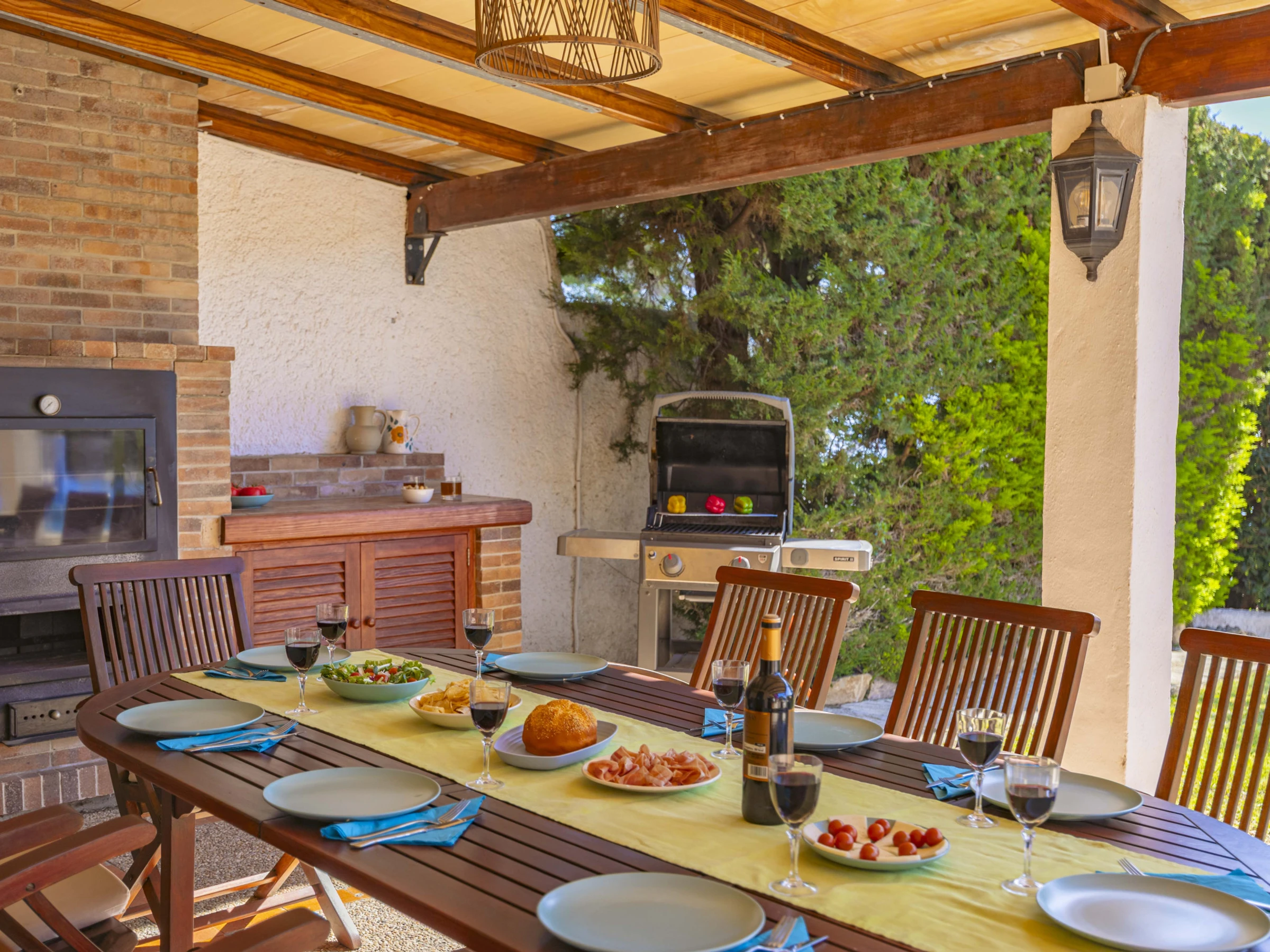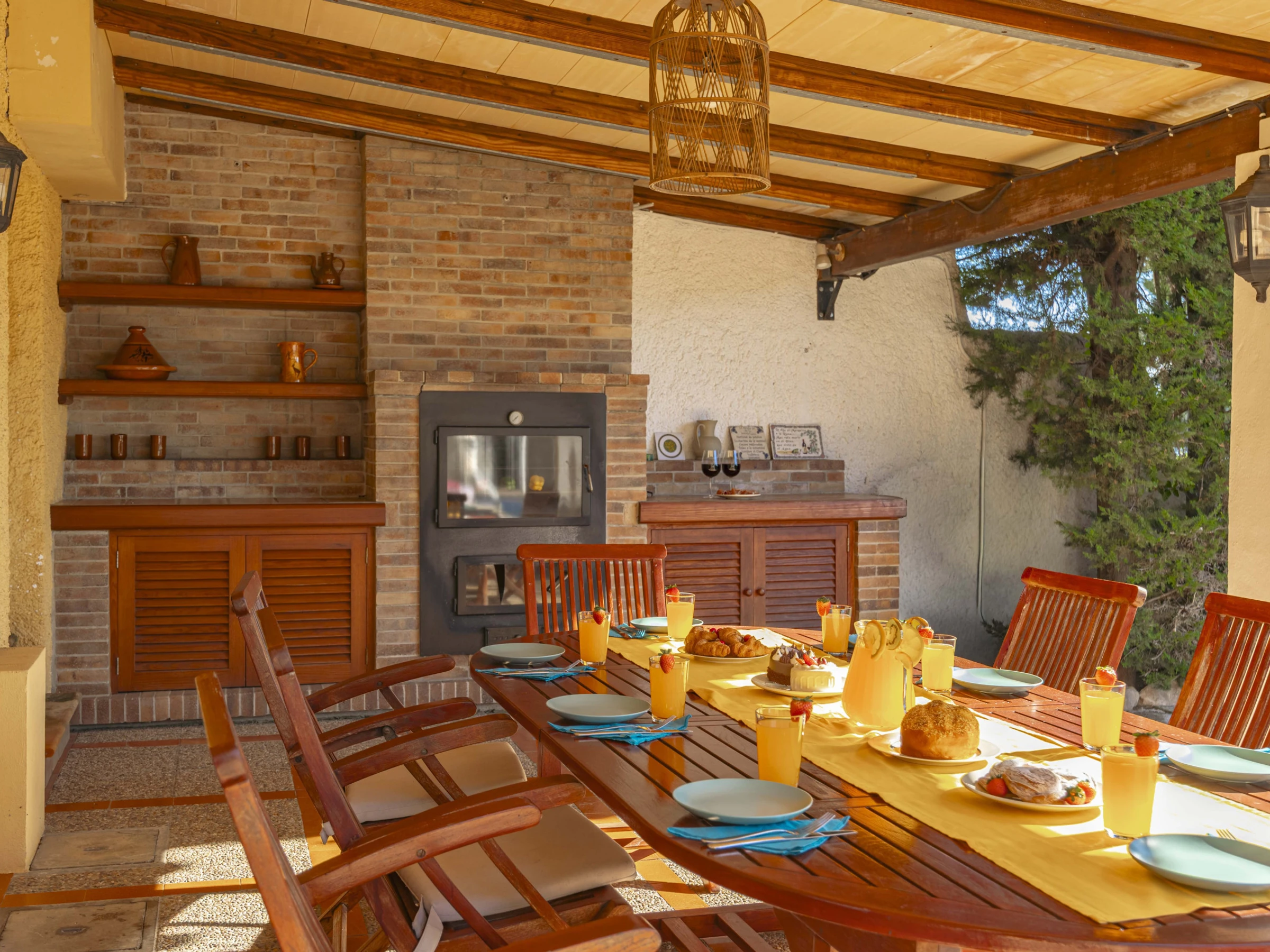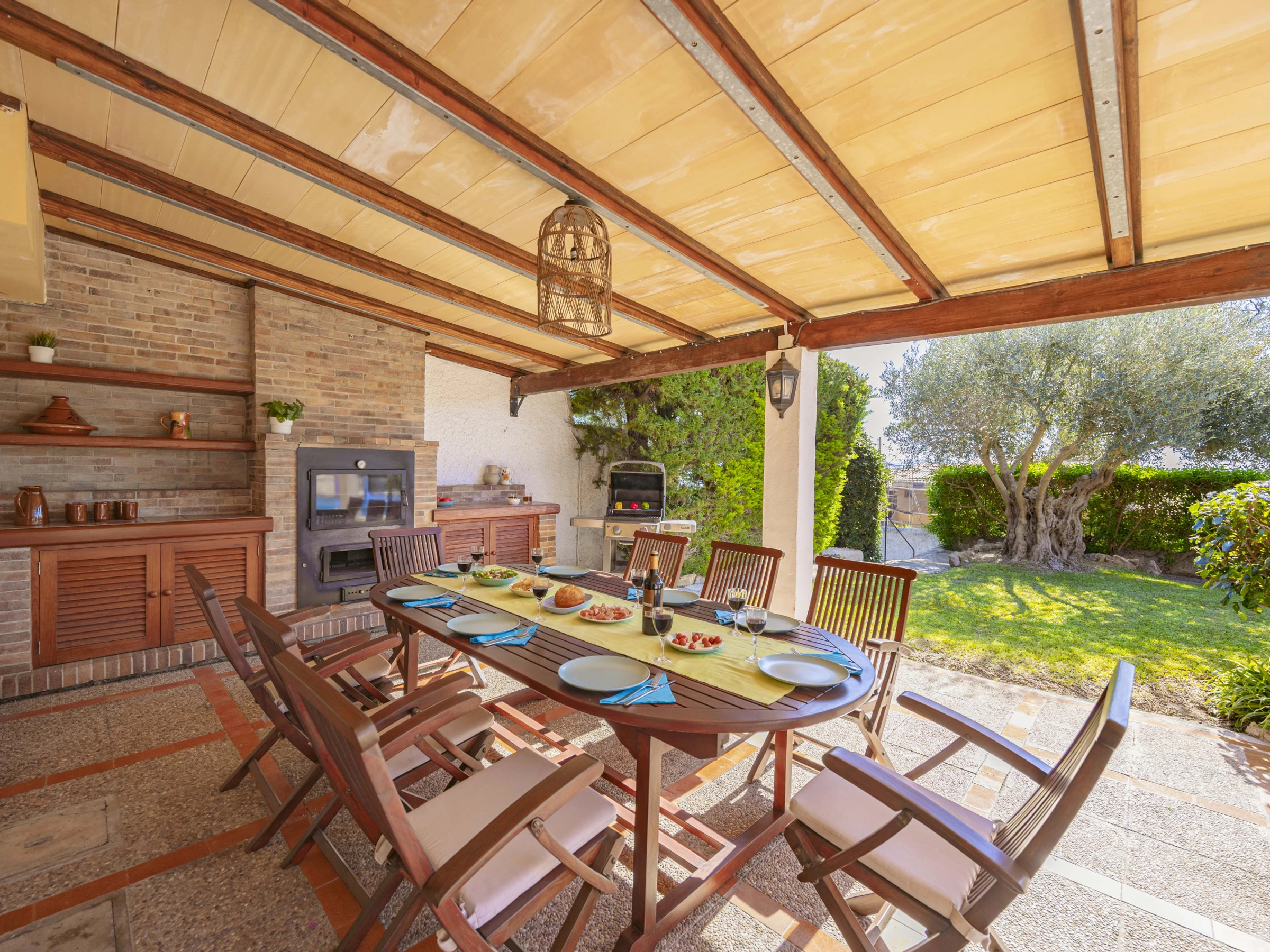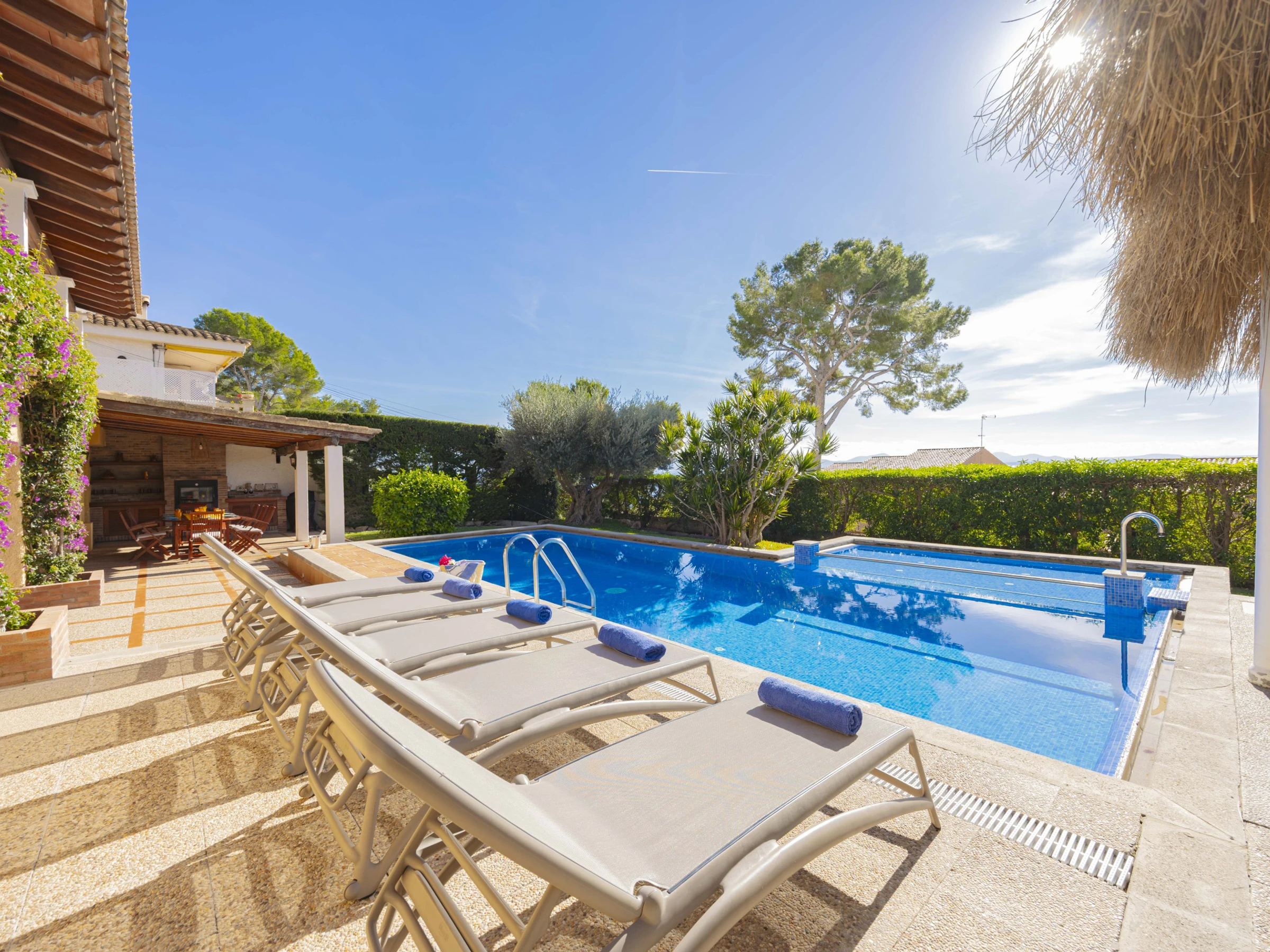 Der Garten bietet einen privaten Pool mit Liegebereich, einen überdachten Essplatz, eine Grillmöglichkeit und eine Außendusche.