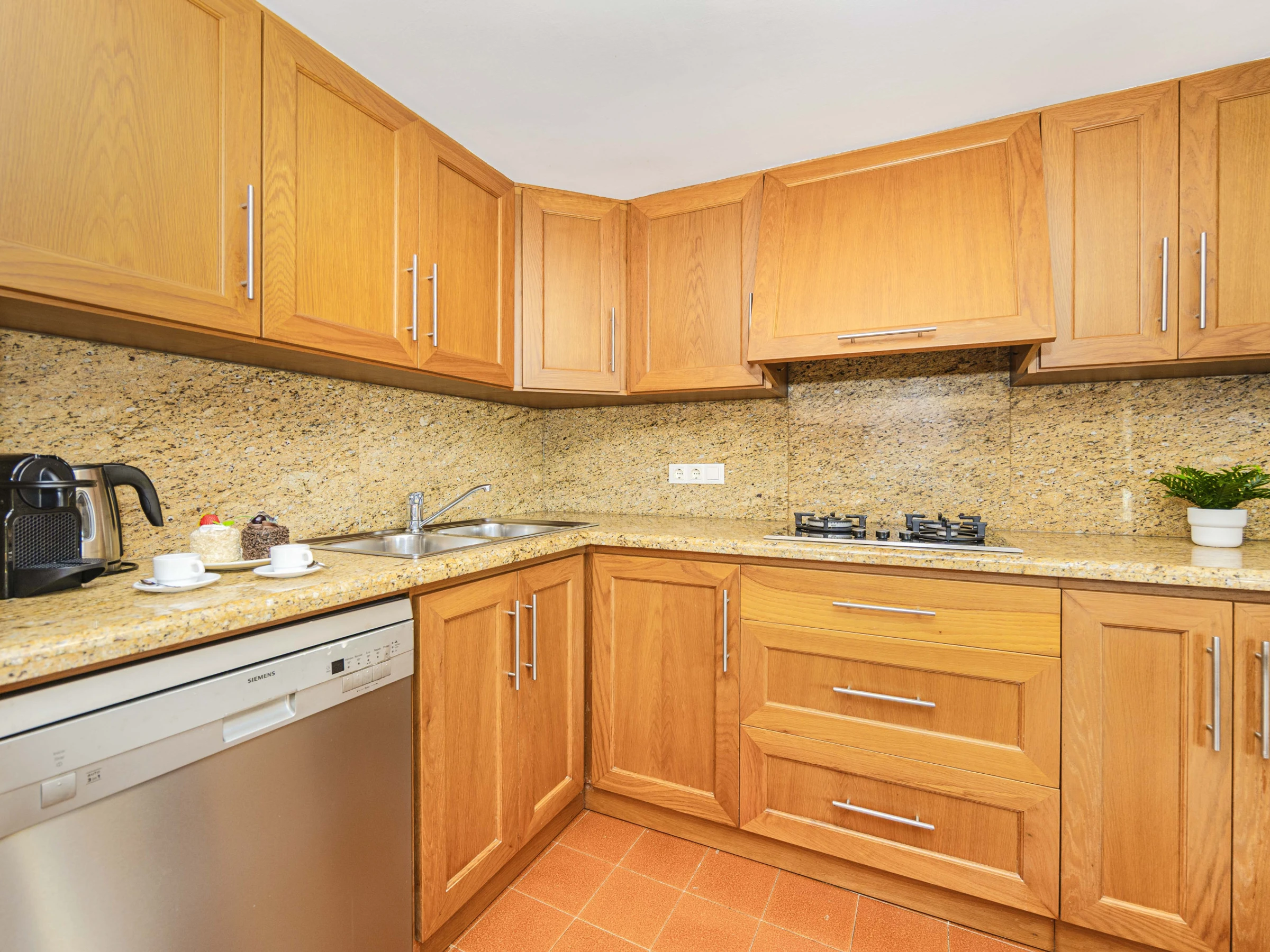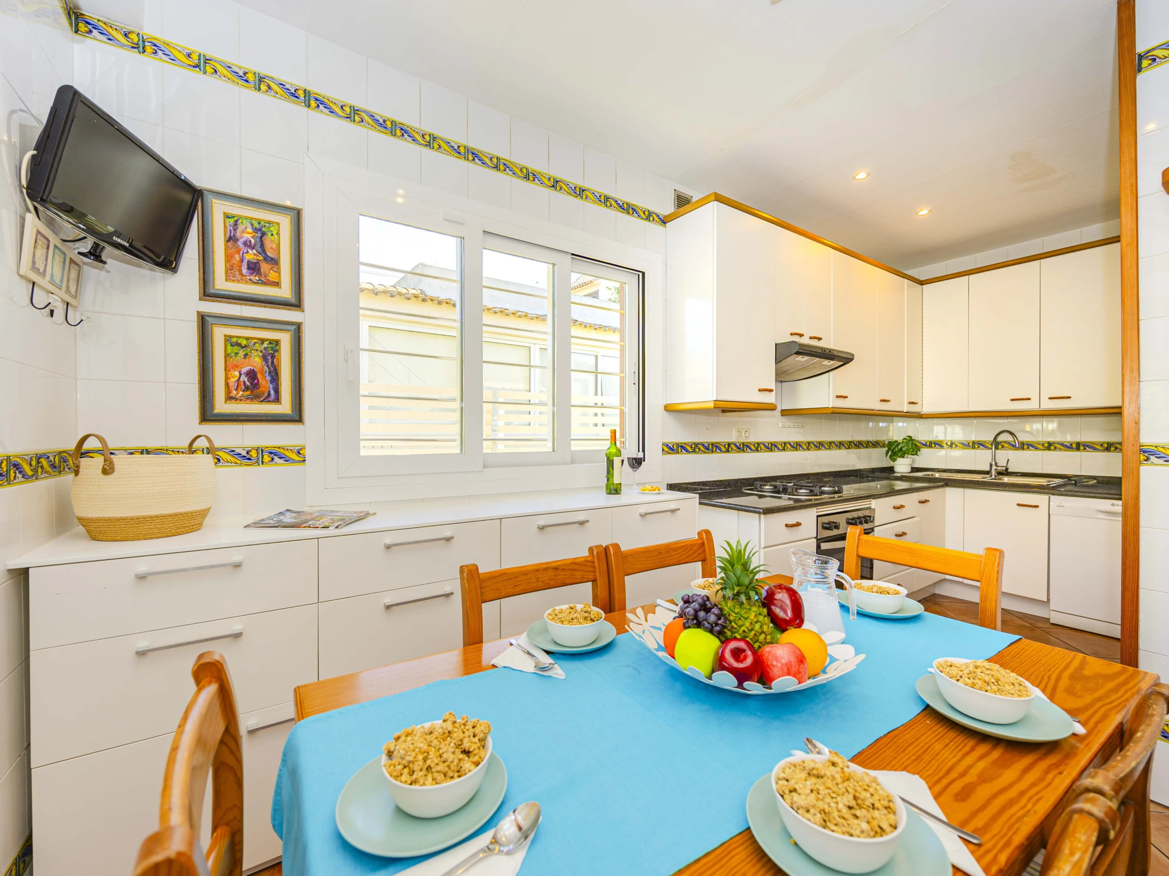 Zur Ausstattung gehören Klimaanlage, WLAN, Sat-TV, Waschmaschine, Geschirrspüler und Küchengeräte für den täglichen Bedarf. Bettwäsche und Handtücher stehen ebenfalls zur Verfügung.