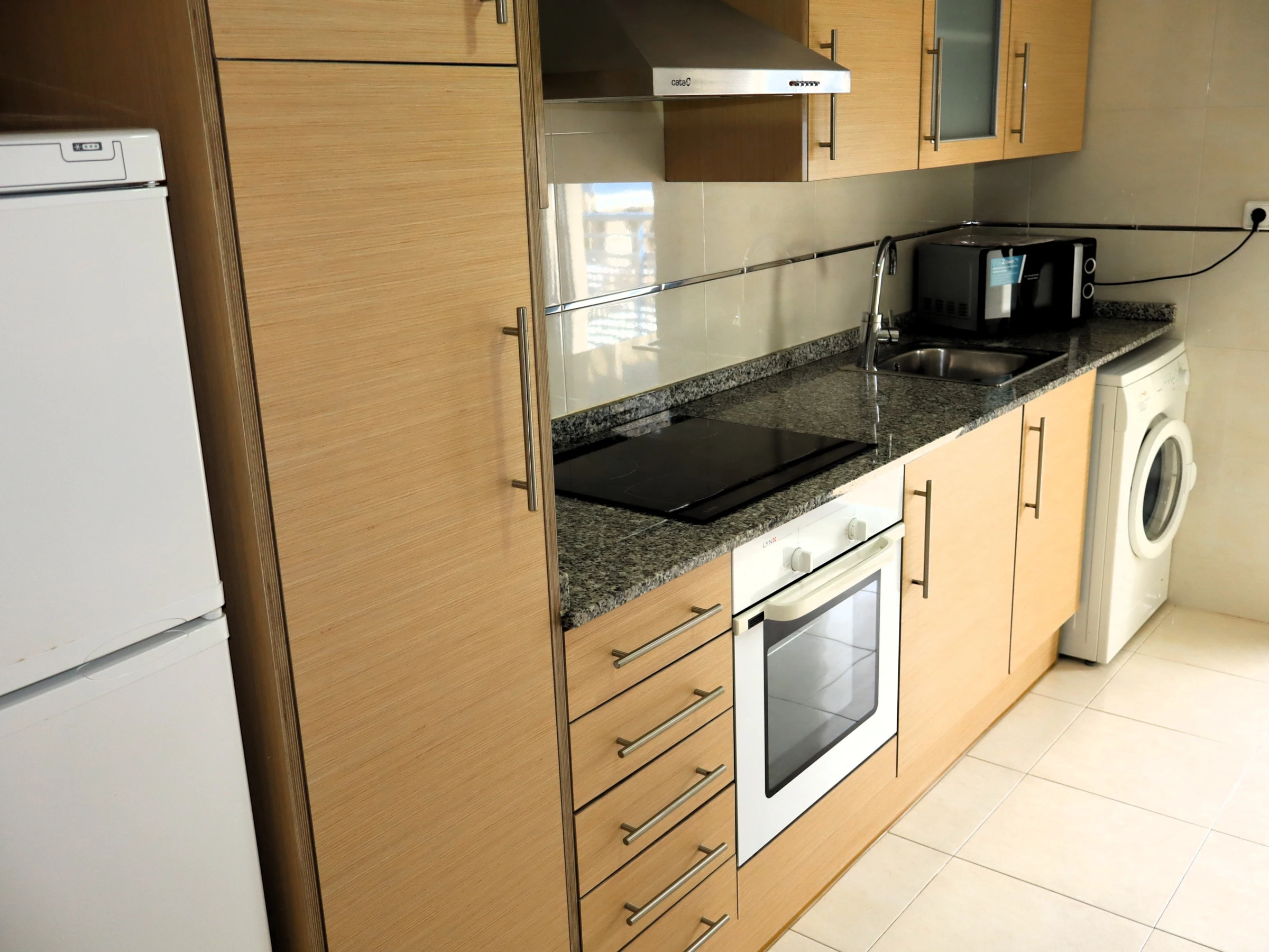 Die separate Induktionsküche ist ausgestattet mit Kühlschrank, Mikrowelle, Ofen, Gefrierschrank, Geschirr, Besteck, Küchenutensilien, Kaffeemaschine.