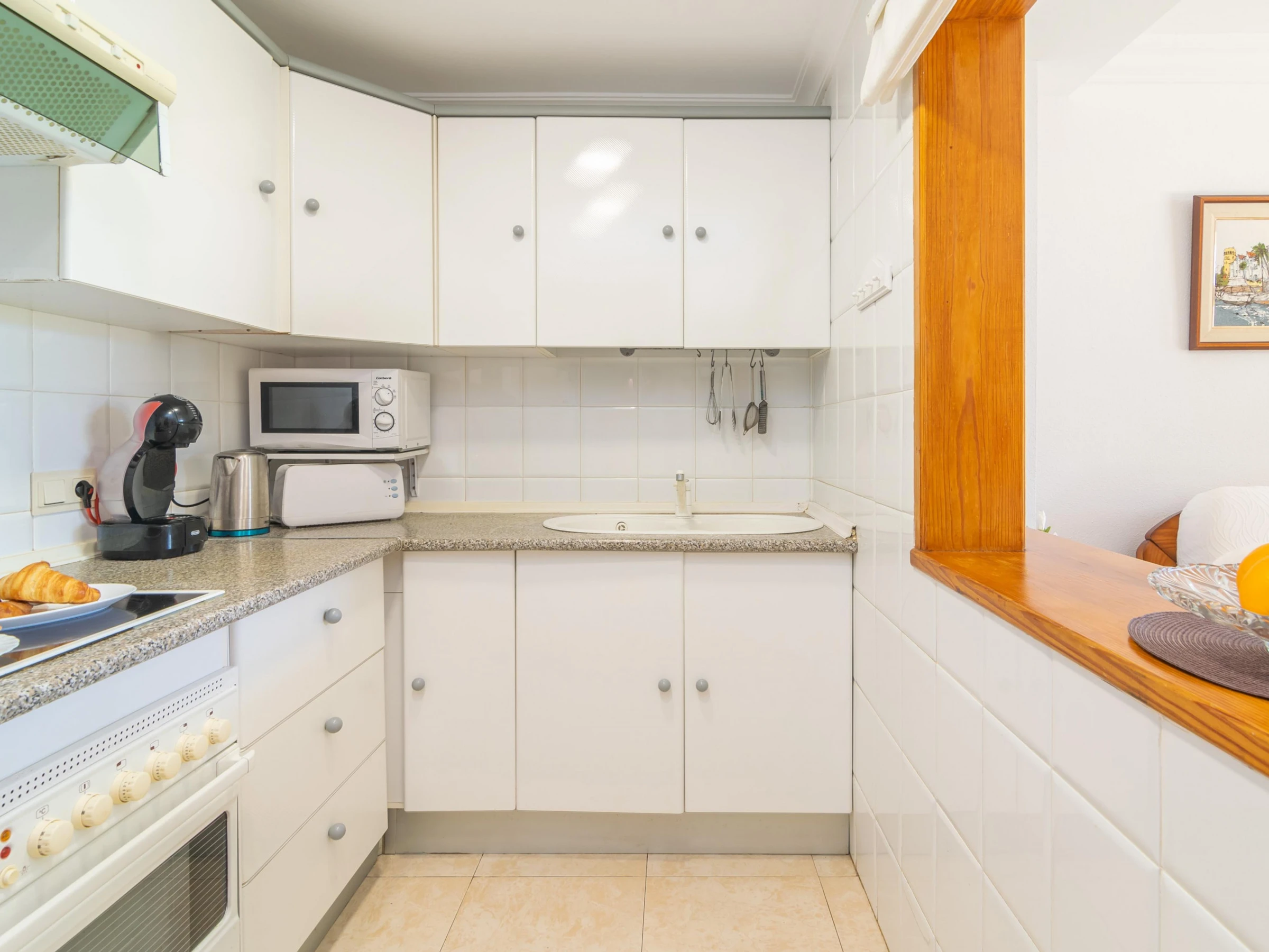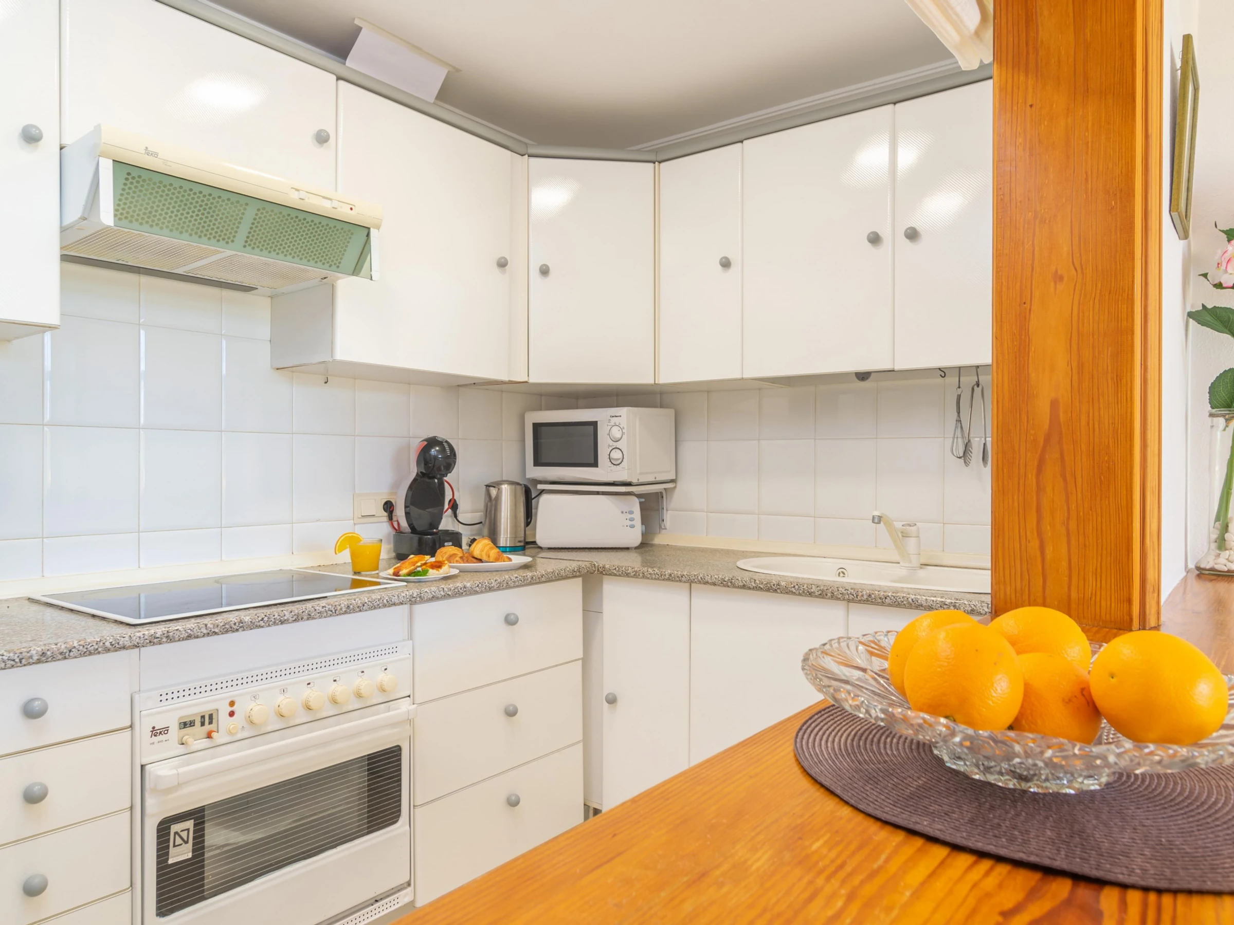 Dieses küche, ist ausgestattet in kühlschrank, mikrowelle, backofen, gefrierschrank, kaffeemaschine und toaster.