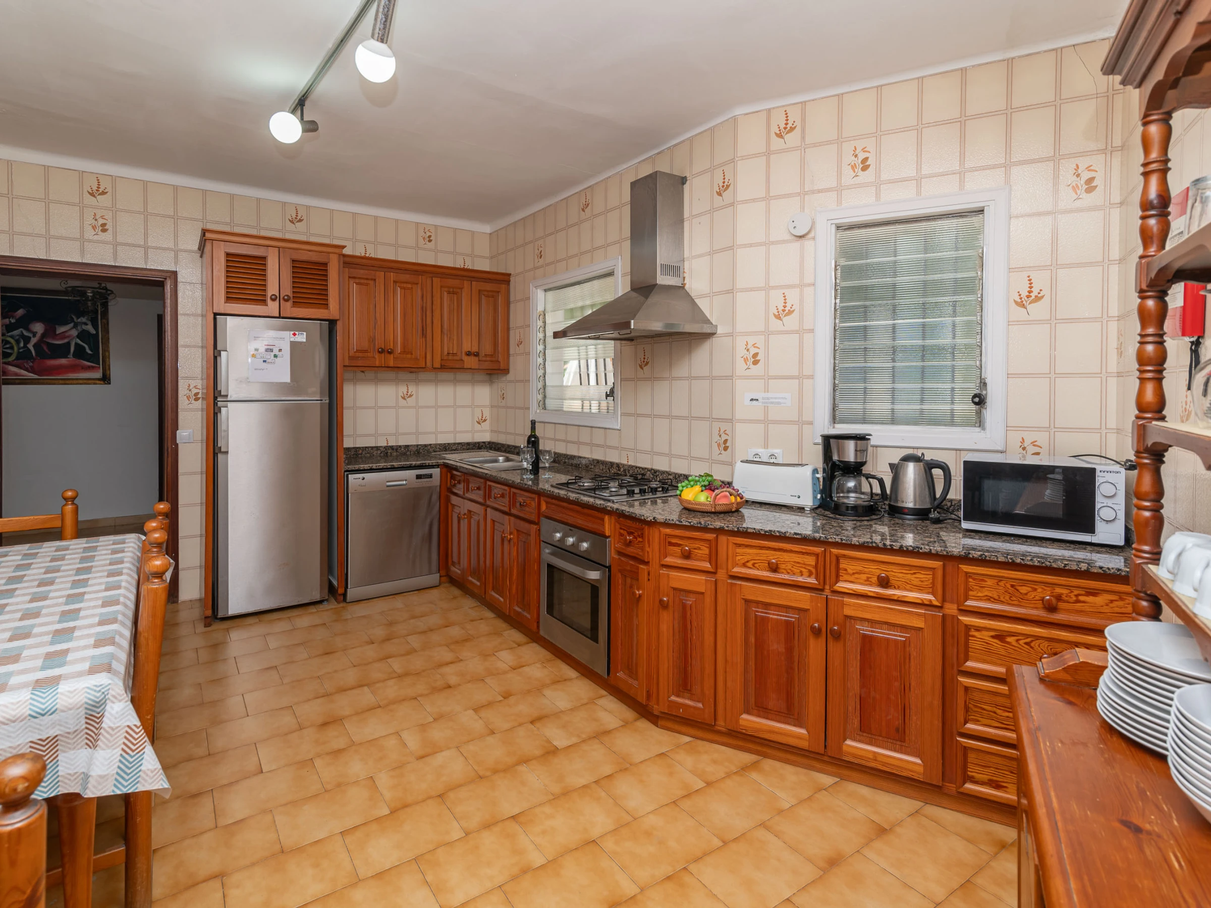 Die Küche ist komplett ausgestattet mit allem Notwendigen, damit Sie während Ihres Aufenthalts bequem kochen können, und der Wohnbereich bietet eine gemütliche Atmosphäre, um sich nach einem Tag voller Erkundungen zu entspannen.