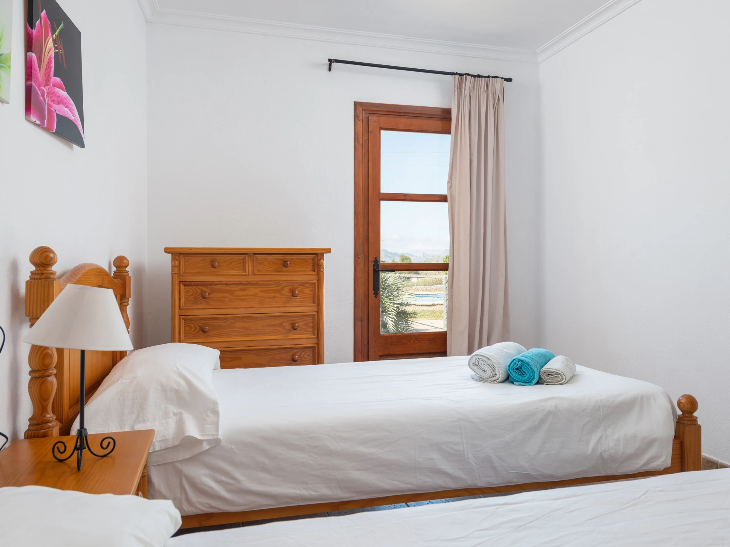 Ein Flur führt vom Wohnzimmer zu den drei Schlafzimmern. Es gibt ein Schlafzimmer mit einem Doppelbett und ein eigenes Badezimmer mit Dusche sowie zwei Schlafzimmer mit Einzelbetten, die sich ein Badezimmer mit ebenerdiger Dusche teilen. Alle Schlafzimmer sind klimatisiert und bieten Blick auf den Garten und den Pool.