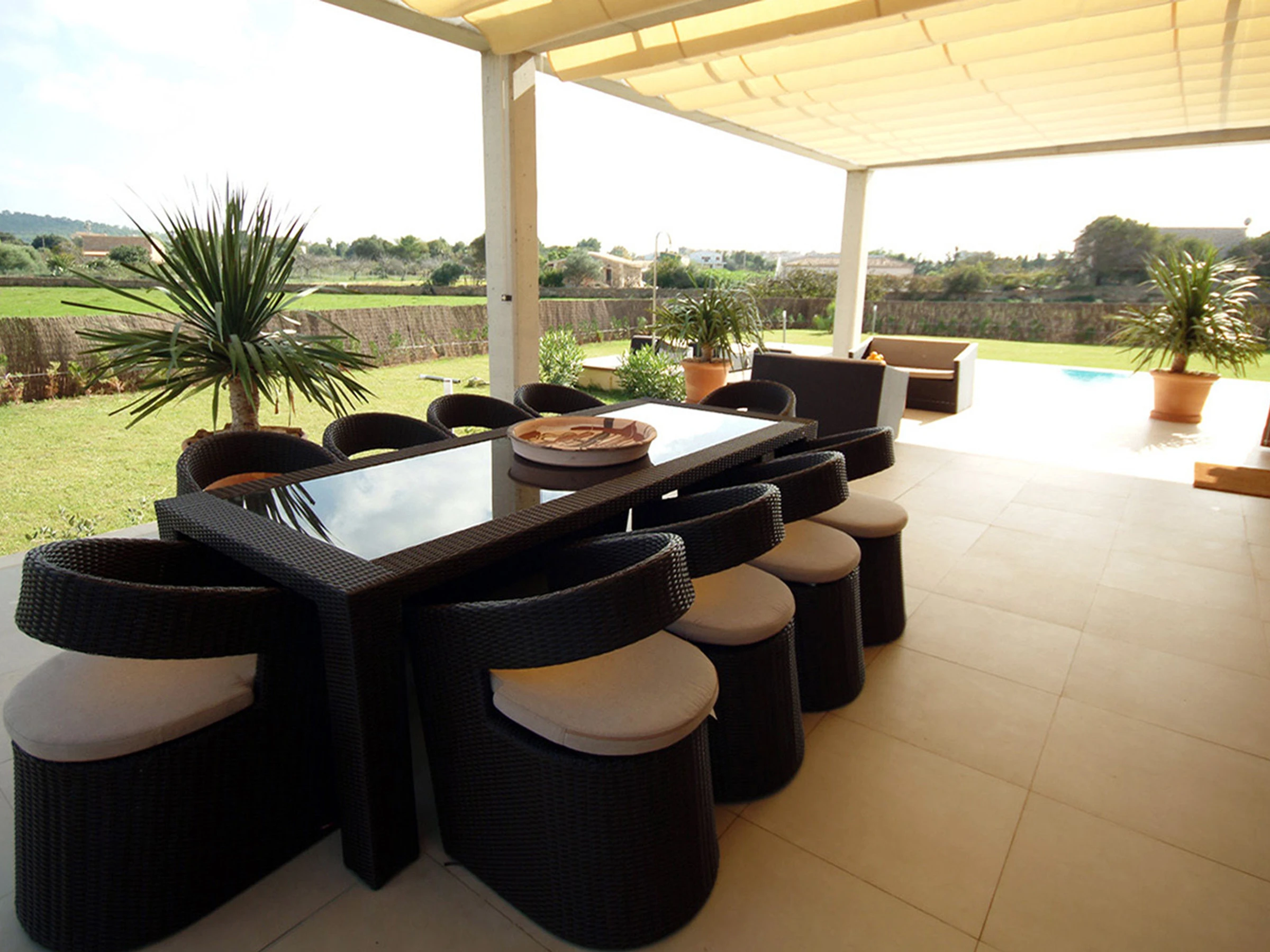 Die überdachte Terrasse ist ein fabelhafter Platz mit Rohr Sofas und Stühlen um einen langen Tisch im Schatten einer Markise. Die Gärten sind sehr einladend für Familien und der Poolbereich ist sehr privat mit Blick über Felder und Bäume auf den Berg von La Victoria.