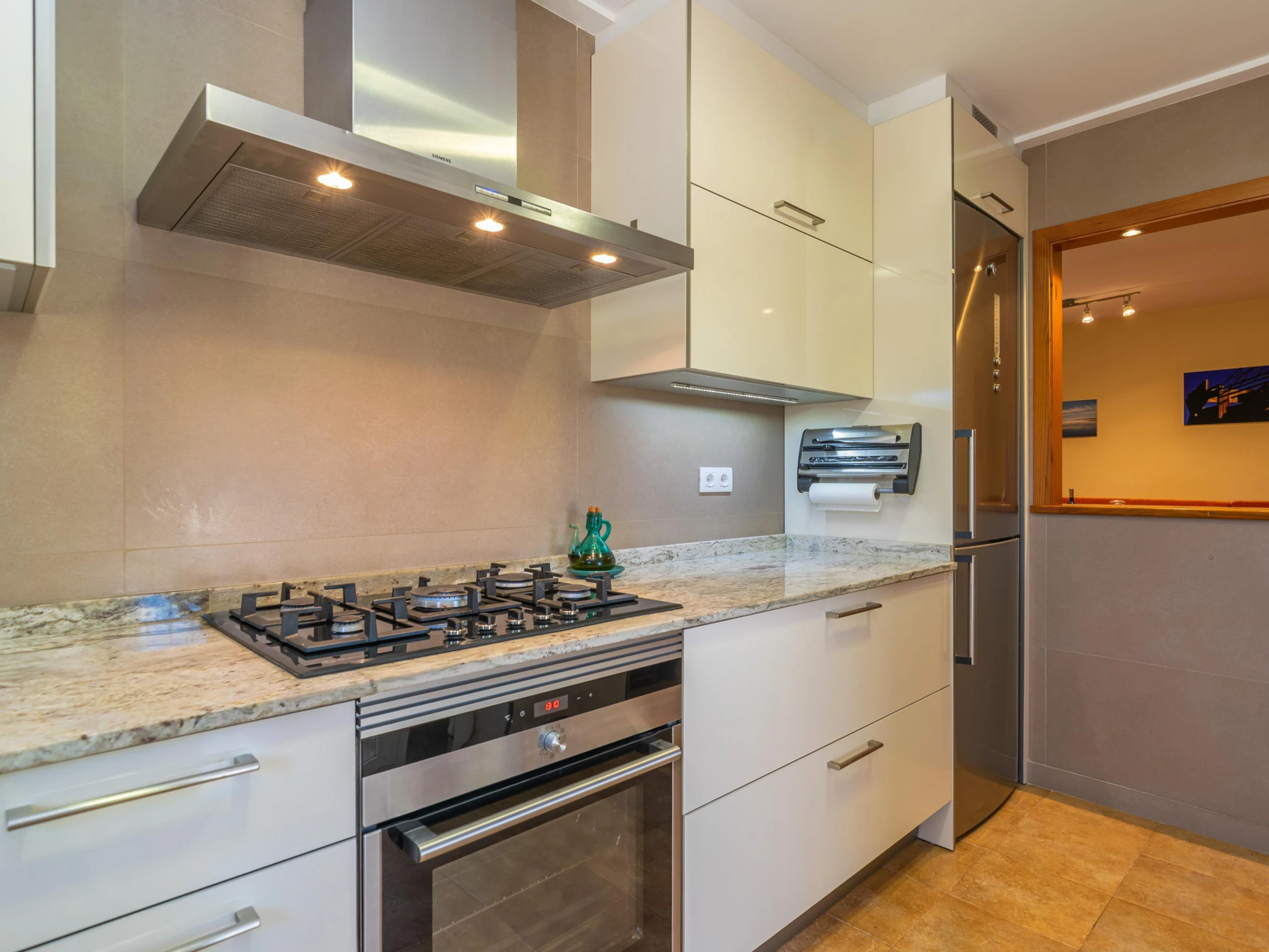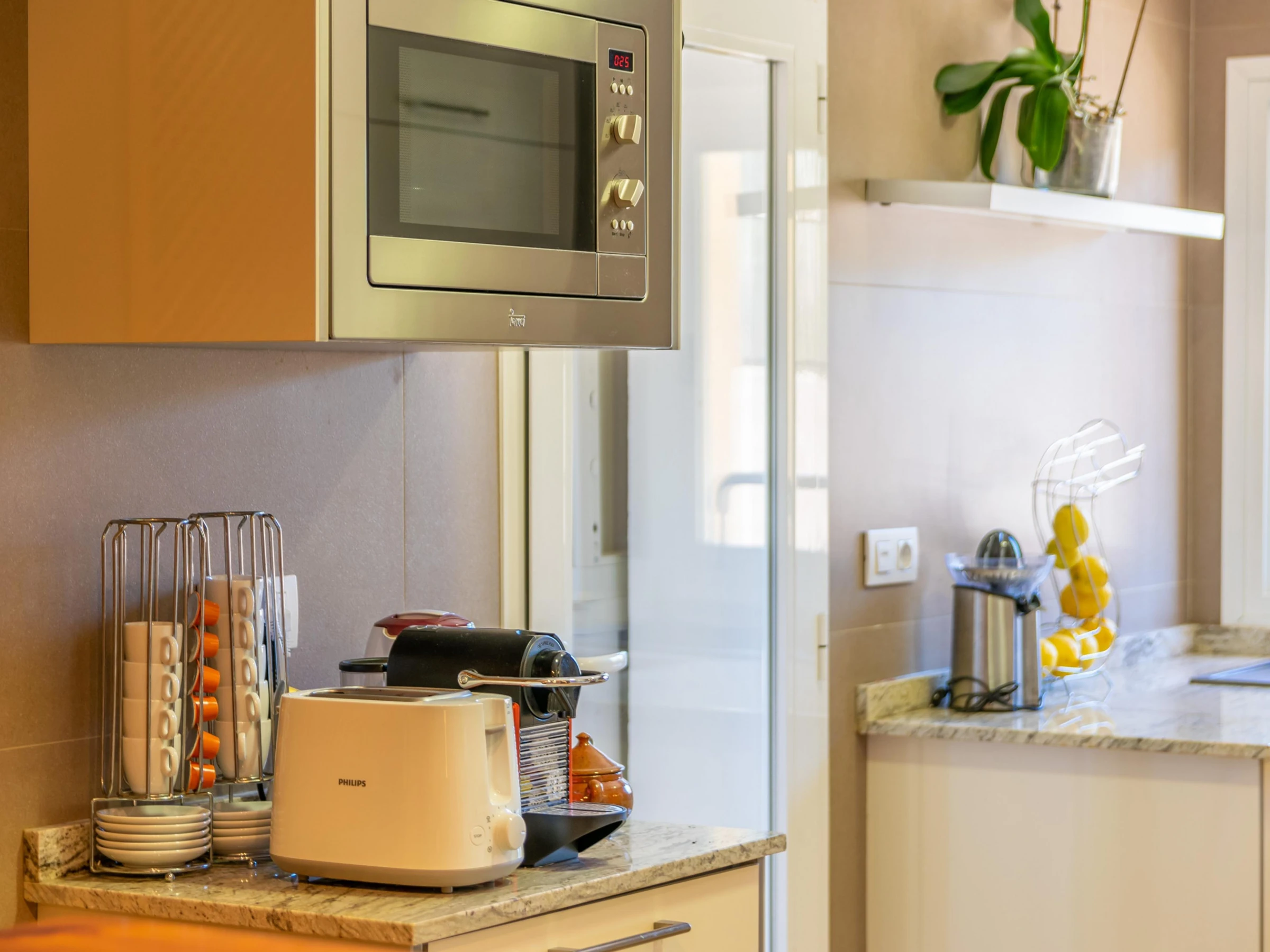 Dieses küche, ist ausgestattet in kühlschrank, mikrowelle, backofen, gefrierschrank, spülmaschine, kaffeemaschine und toaster.