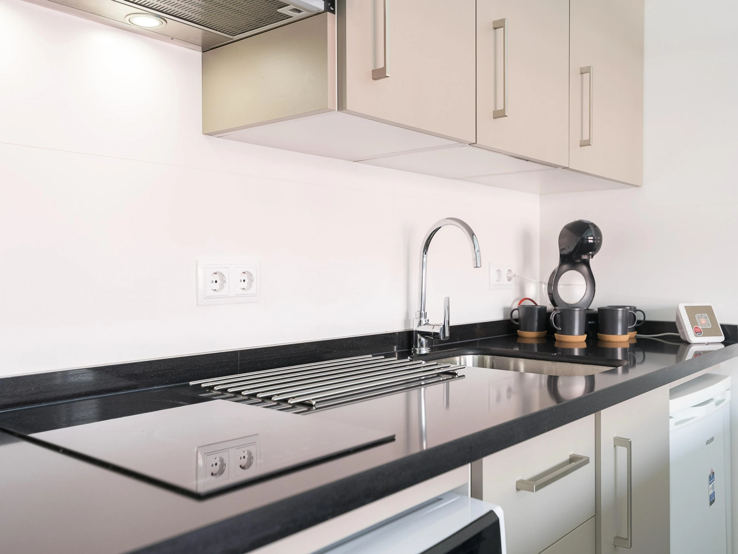 Dieses küche, ist ausgestattet in kühlschrank, mikrowelle, gefrierschrank, spülmaschine, kaffeemaschine und toaster.