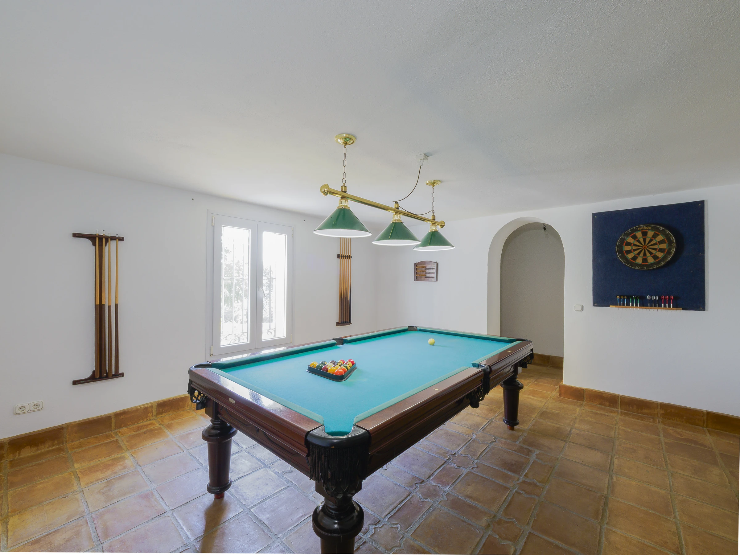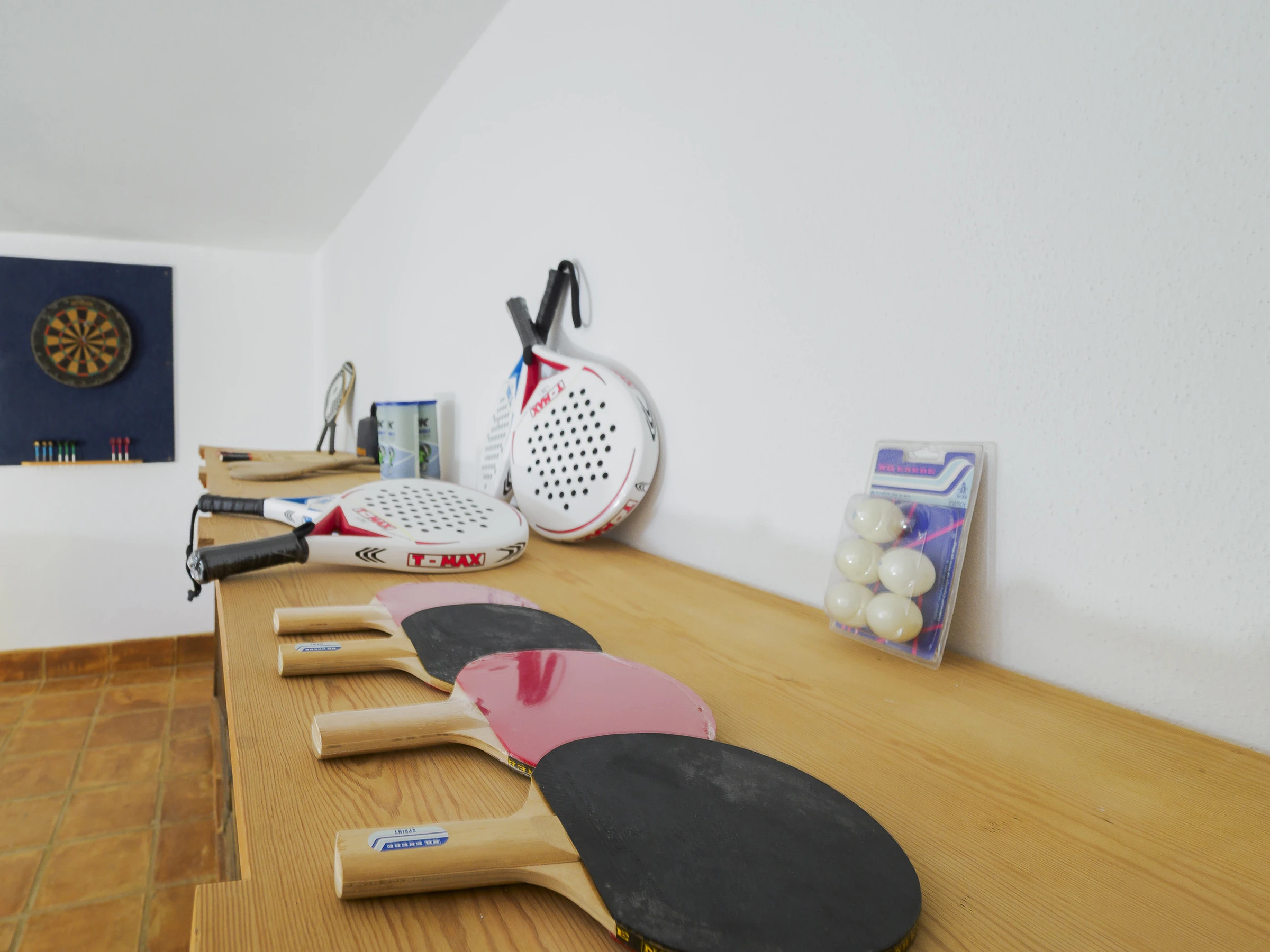 * Billardraum, Dartscheibe, Tischtennisplatte und Brettspiele