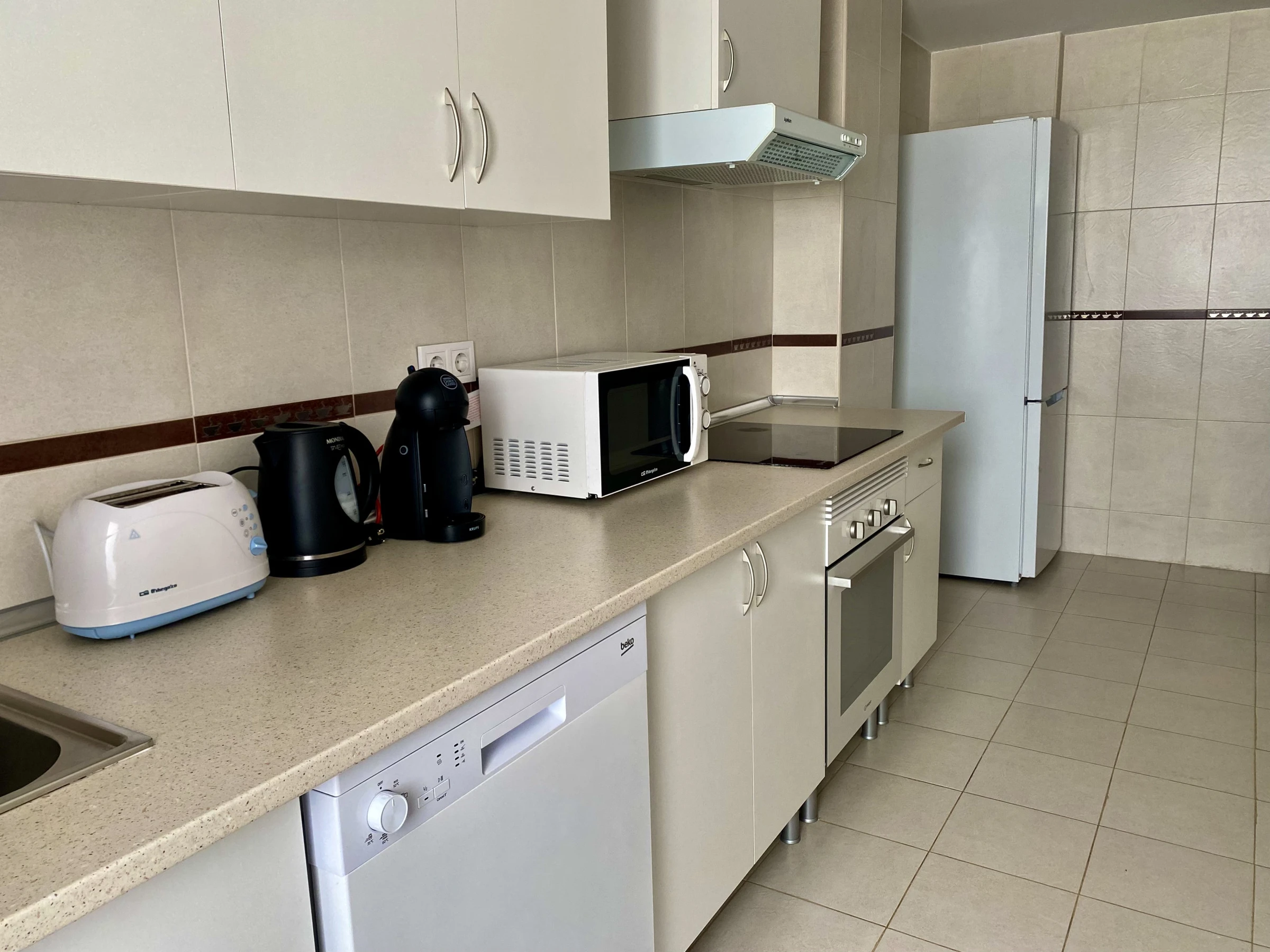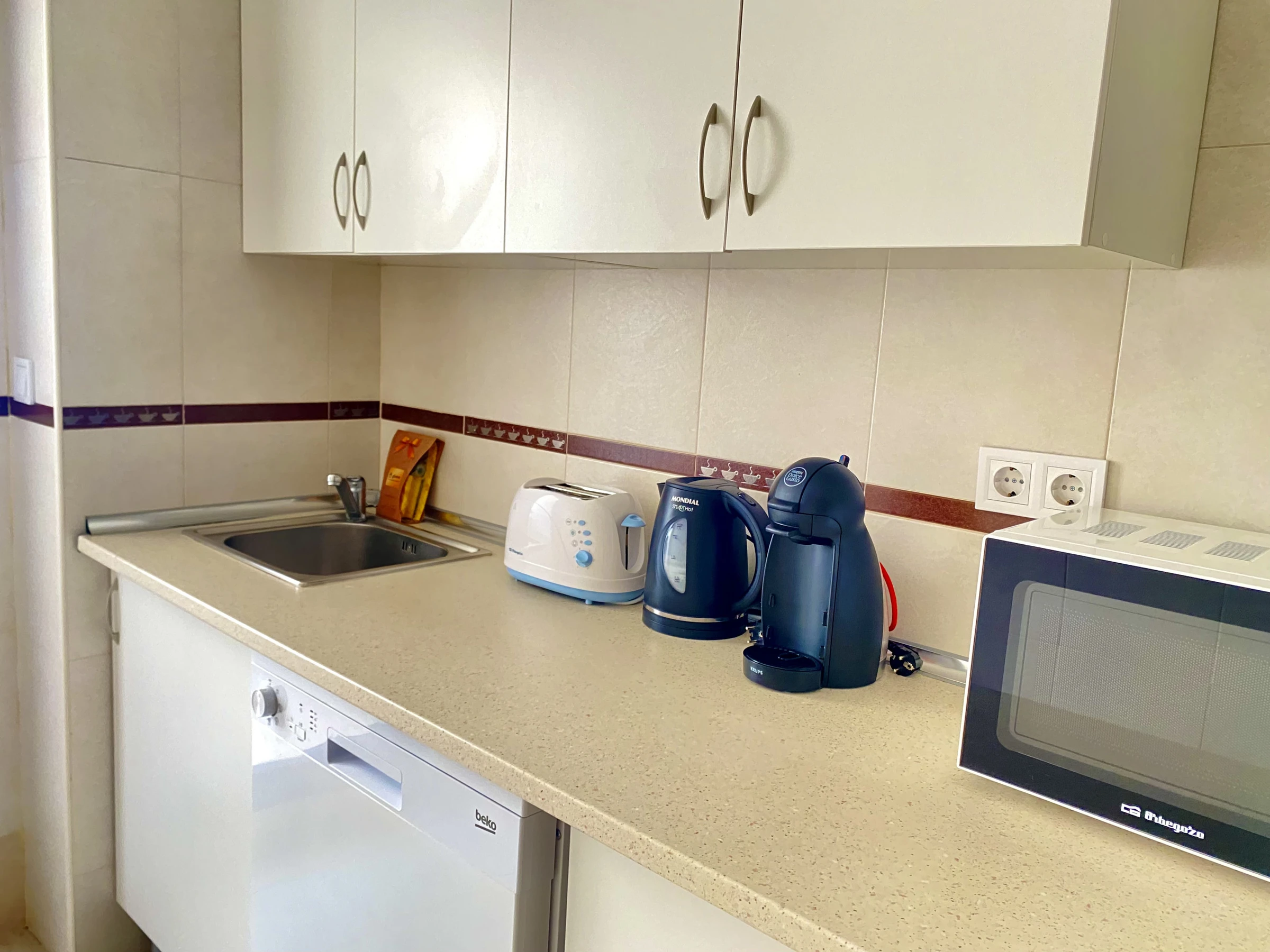 Die Küche ist komplett ausgestattet mit modernen Geräten wie Kühlschrank, Gefrierschrank, Geschirrspüler, Mikrowelle und Kaffeemaschine, was die Zubereitung von Mahlzeiten erleichtert. Außerdem gibt es einen separaten Essbereich.