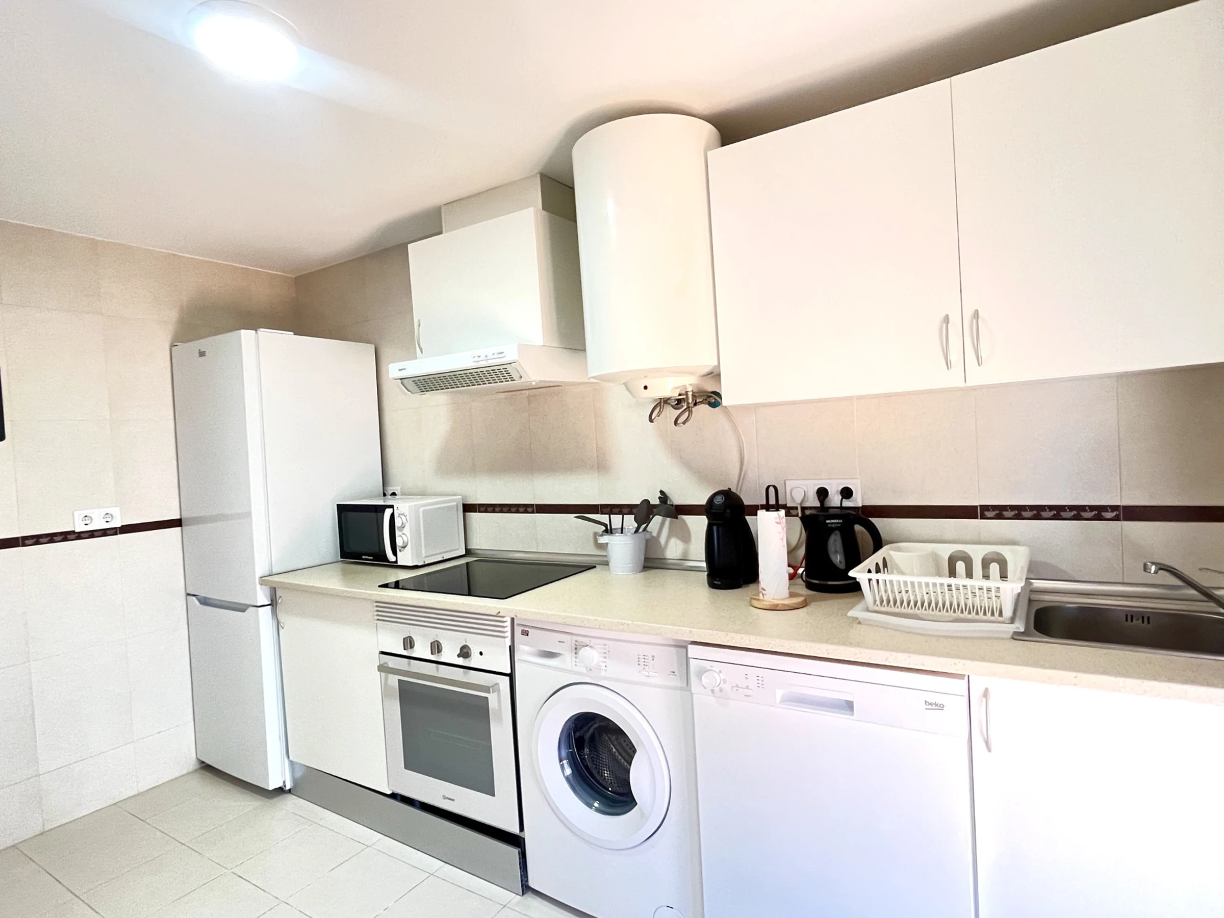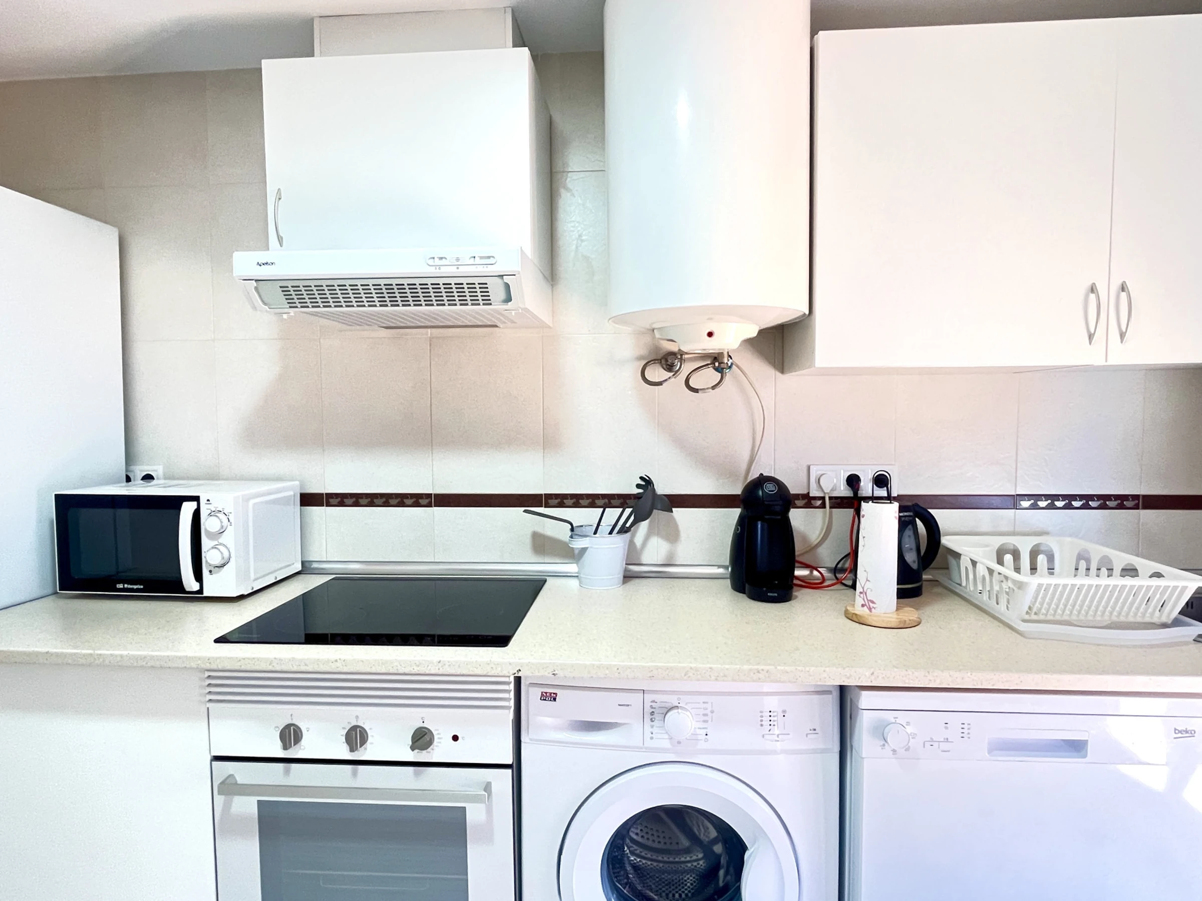 Die Küche ist vollständig ausgestattet mit einer Vielzahl von Elektrogeräten, einschließlich Kühlschrank, Gefrierschrank, Waschmaschine, Kaffeemaschine, Ofen und Geschirrspüler, alles was Sie brauchen, um Ihre Mahlzeiten bequem zuzubereiten.