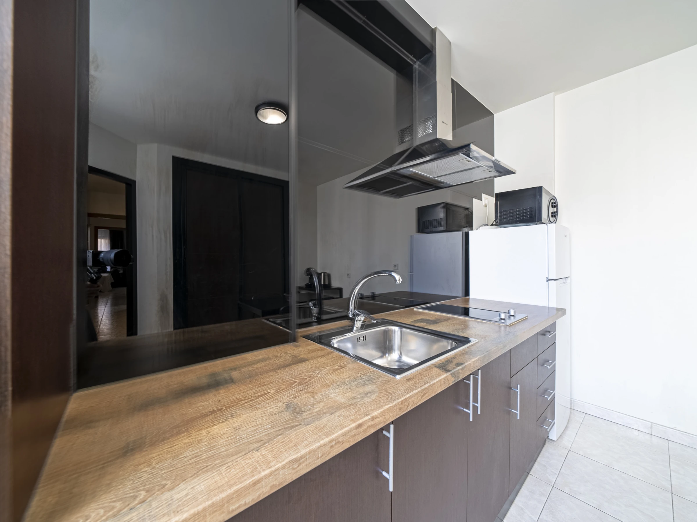 Dieses offene küche, mit ceranfeld, ist ausgestattet in kühlschrank, mikrowelle, gefrierschrank, spülmaschine, geschirr/besteck, kochutensilien, kaffeemaschine, toaster, wasserkocher und saftpresse.