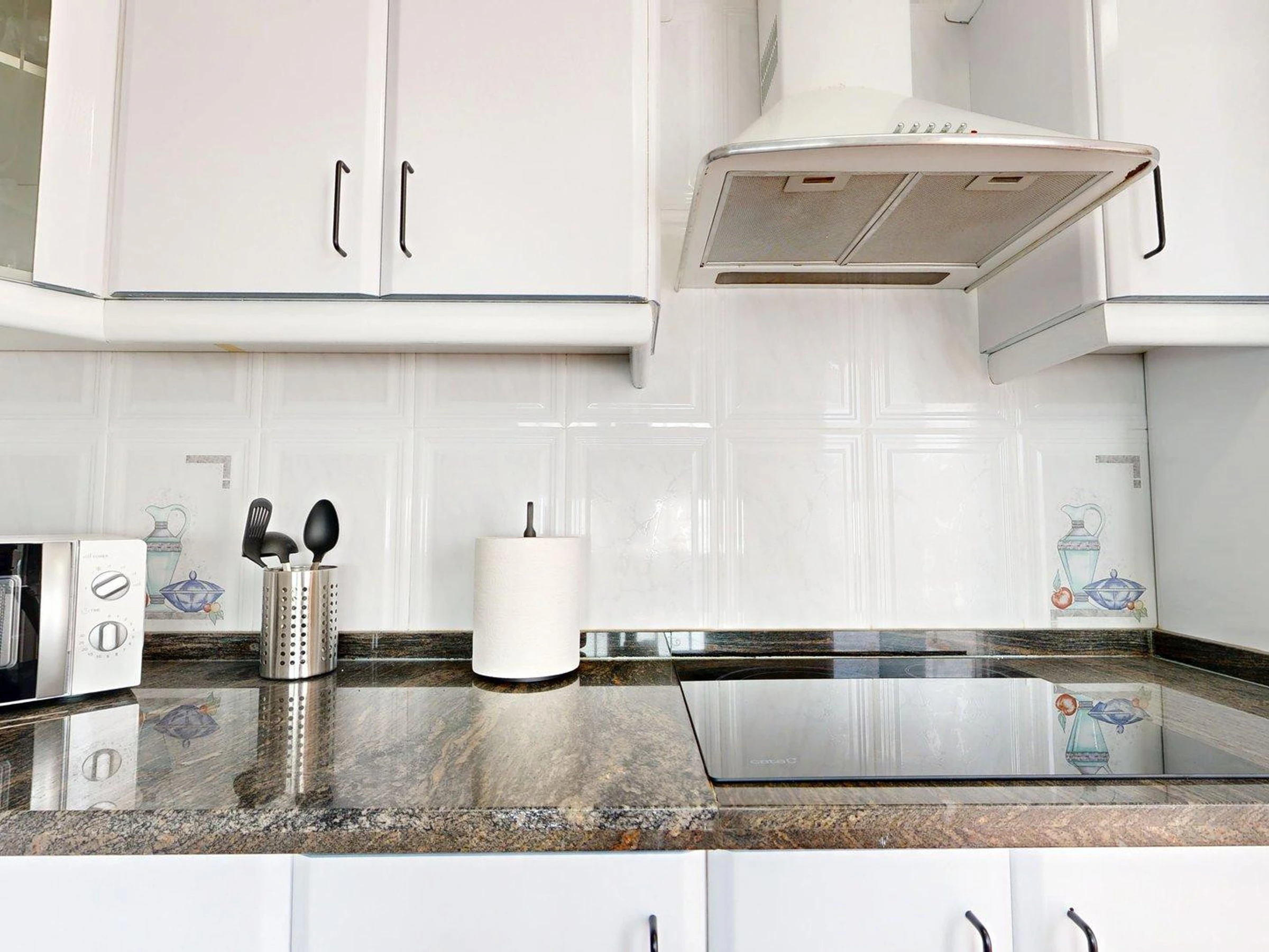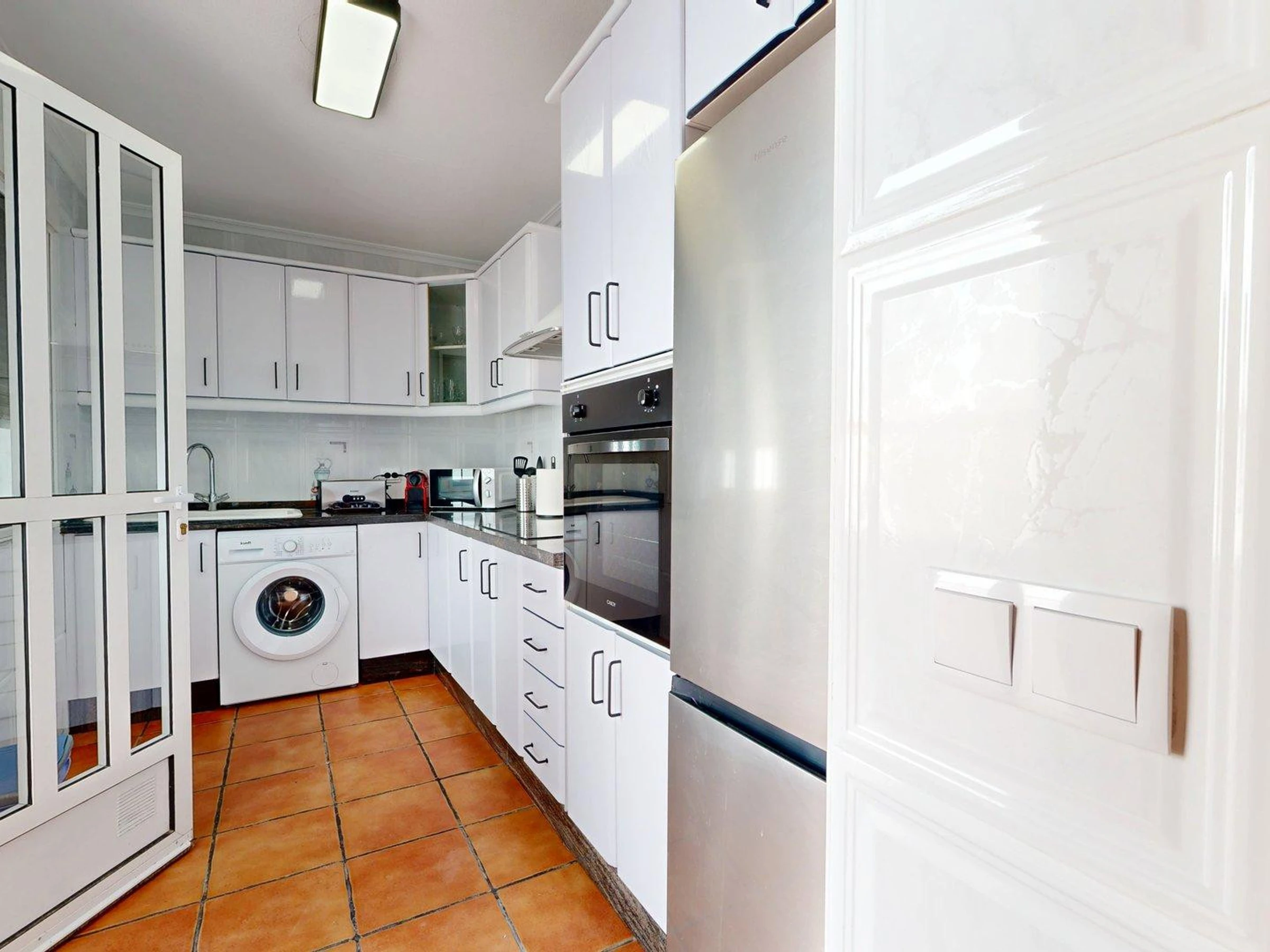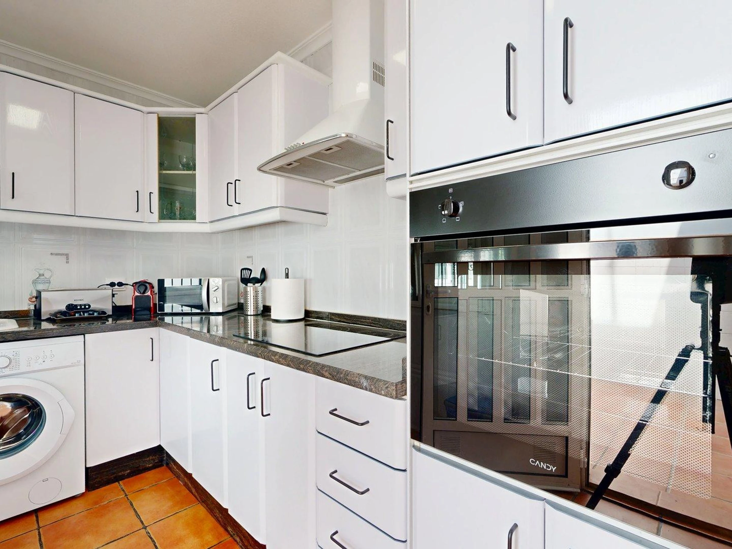 Dieses separate küche, mit ceranfeld, ist ausgestattet in kühlschrank, mikrowelle, backofen, gefrierschrank, geschirr/besteck, kochutensilien, kaffeemaschine, toaster und saftpresse.