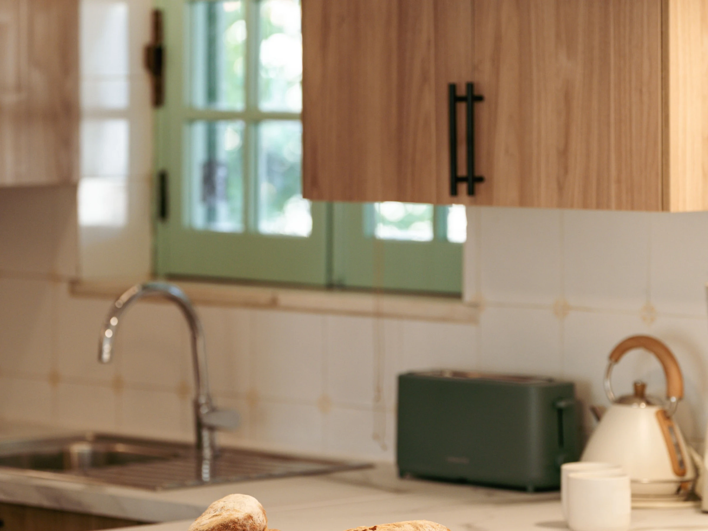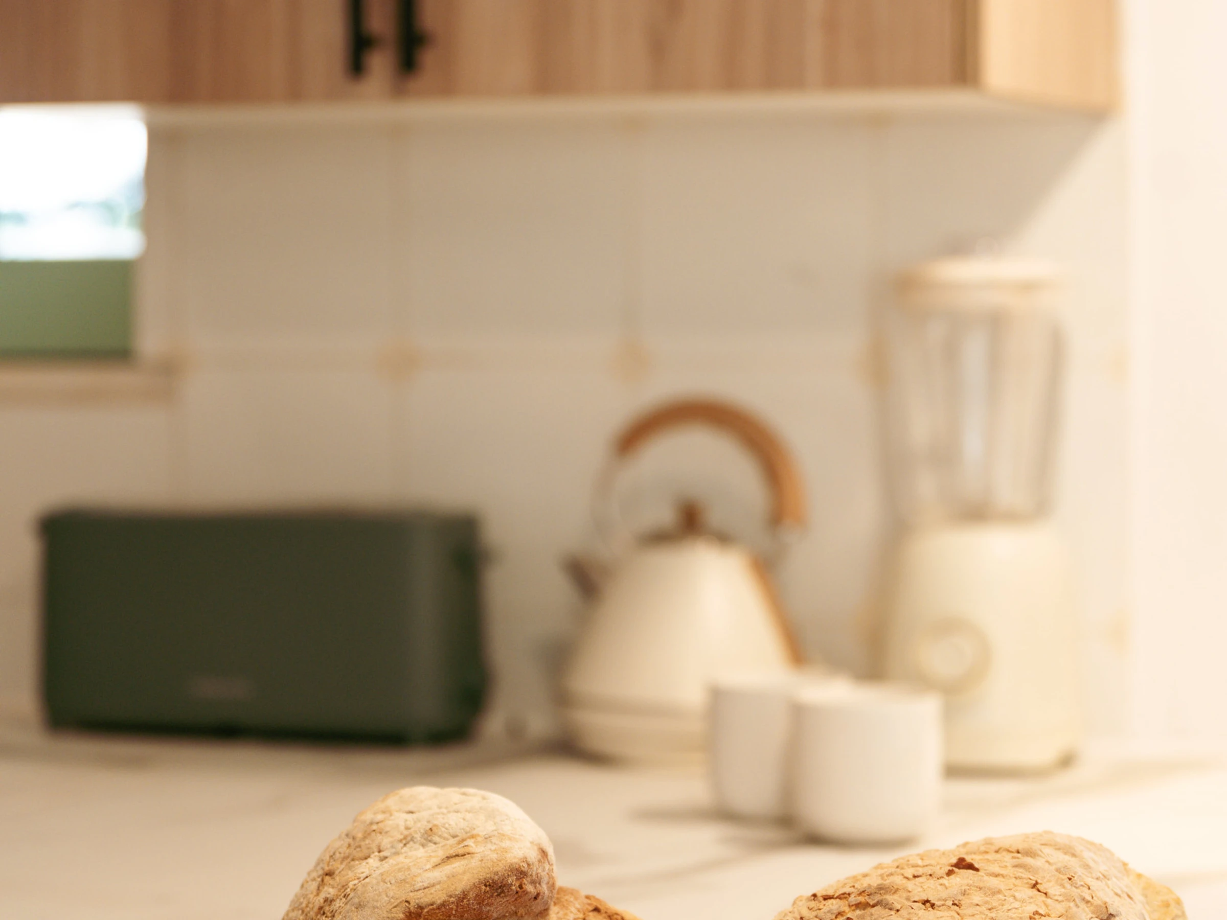 Dieses küche, mit gas-kochfeld, ist ausgestattet in kühlschrank, mikrowelle, backofen, gefrierschrank, spülmaschine, geschirr/besteck, kochutensilien, kaffeemaschine, toaster, wasserkocher und saftpresse.