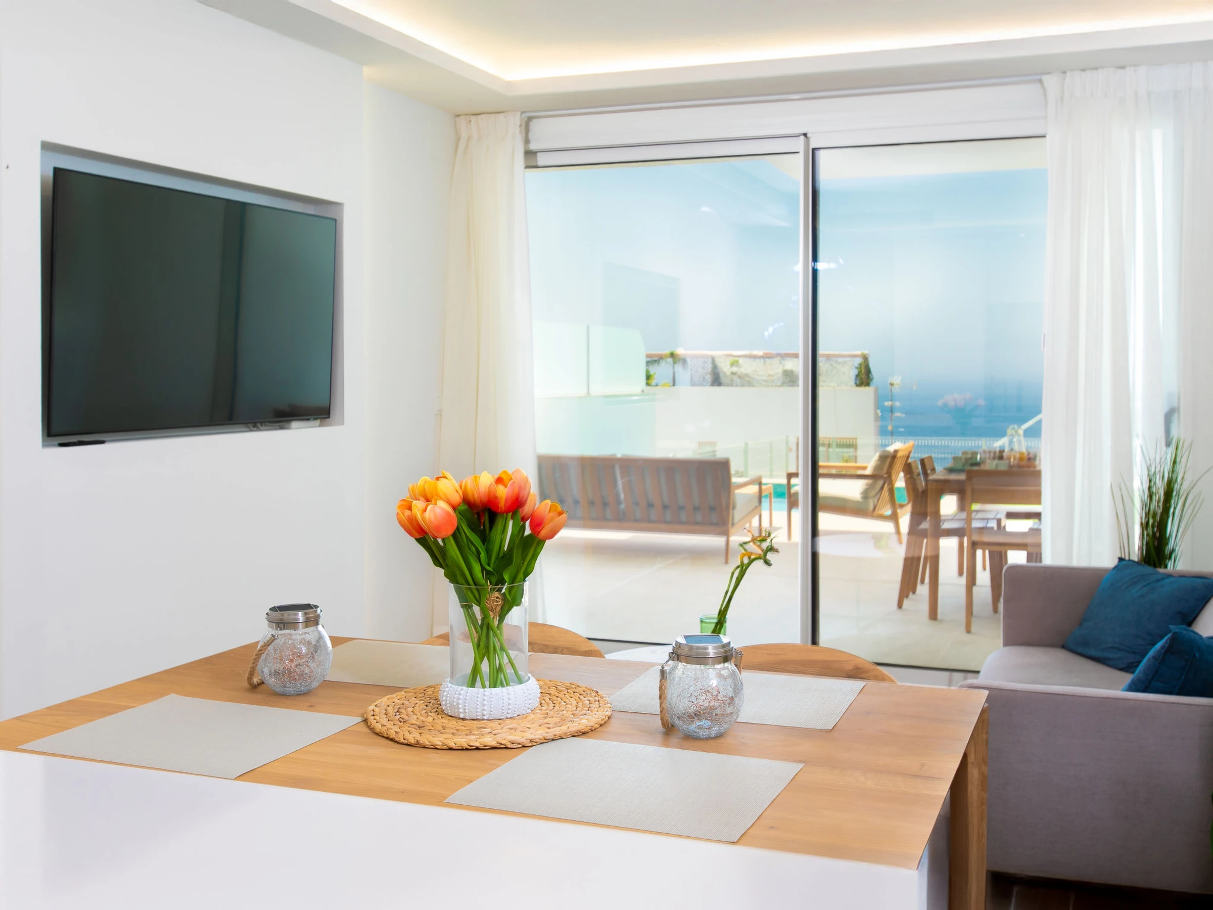 "D´Mediterranea private pool & sauna", 3-Zimmer-Wohnung 99 m2. Komfortabel und modern eingerichtet: Wohn-/Esszimmer mit Klimaanlage und Warmluftheizung. Ausgang zur Terrasse, zum Schwimmbad. 1 Zimmer mit 1 franz. Bett (180 cm, Länge 200 cm), Dusche/WC, Klimaanlage und Warmluftheizung. Ausgang zur Terrasse, zum Schwimmbad. 1 Zimmer mit 2 Betten (90 cm, Länge 200 cm), Klimaanlage und Warmluftheizung. Ausgang zur Terrasse. Offene Küche (Backofen, Geschirrspüler, 4 Glaskeramikplatten, Toaster, Wasserkocher, Mikrowelle, Tiefkühler). Dusche/WC. 2 grosse Terrassen 58 m2. Terrassenmöbel, Liegestühle. Panoramasicht auf das Meer. Zur Verfügung: Waschmaschine, Wäschetrockner, Safe, Bügeleisen, Haartrockner. Internet (WLAN, gratis). Bitte beachten: Rauchmelder, Feuerlöscher. [hidden] // Reg. Nr.: ESFCTU000029013001120221000000000000000000VUT/MA/9696