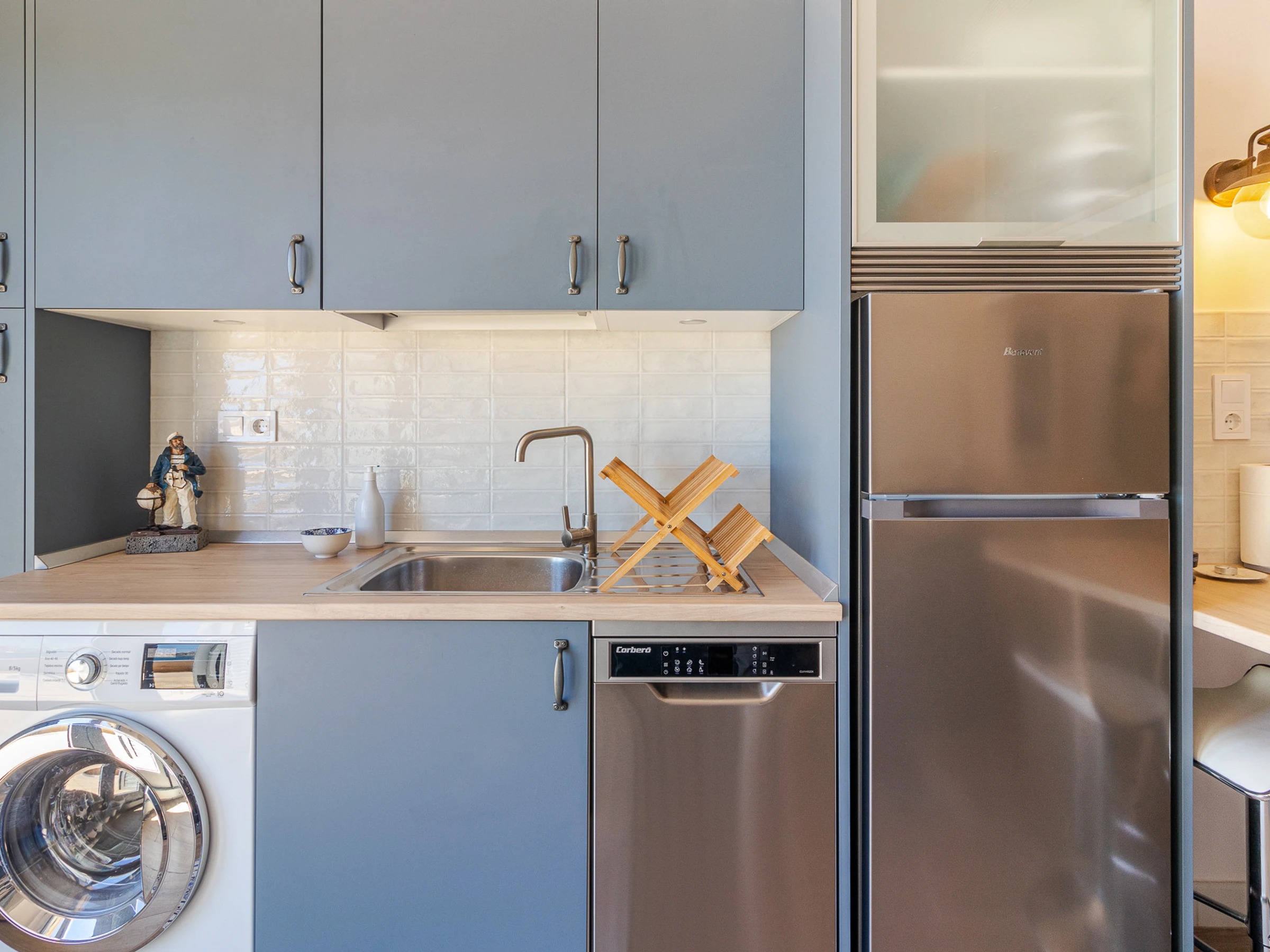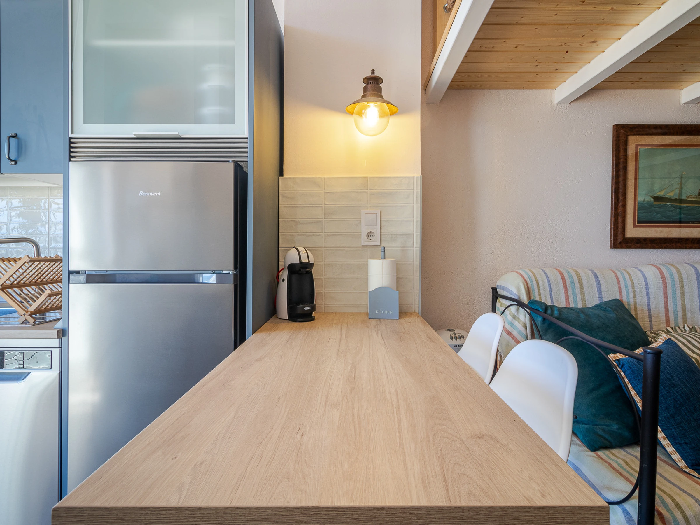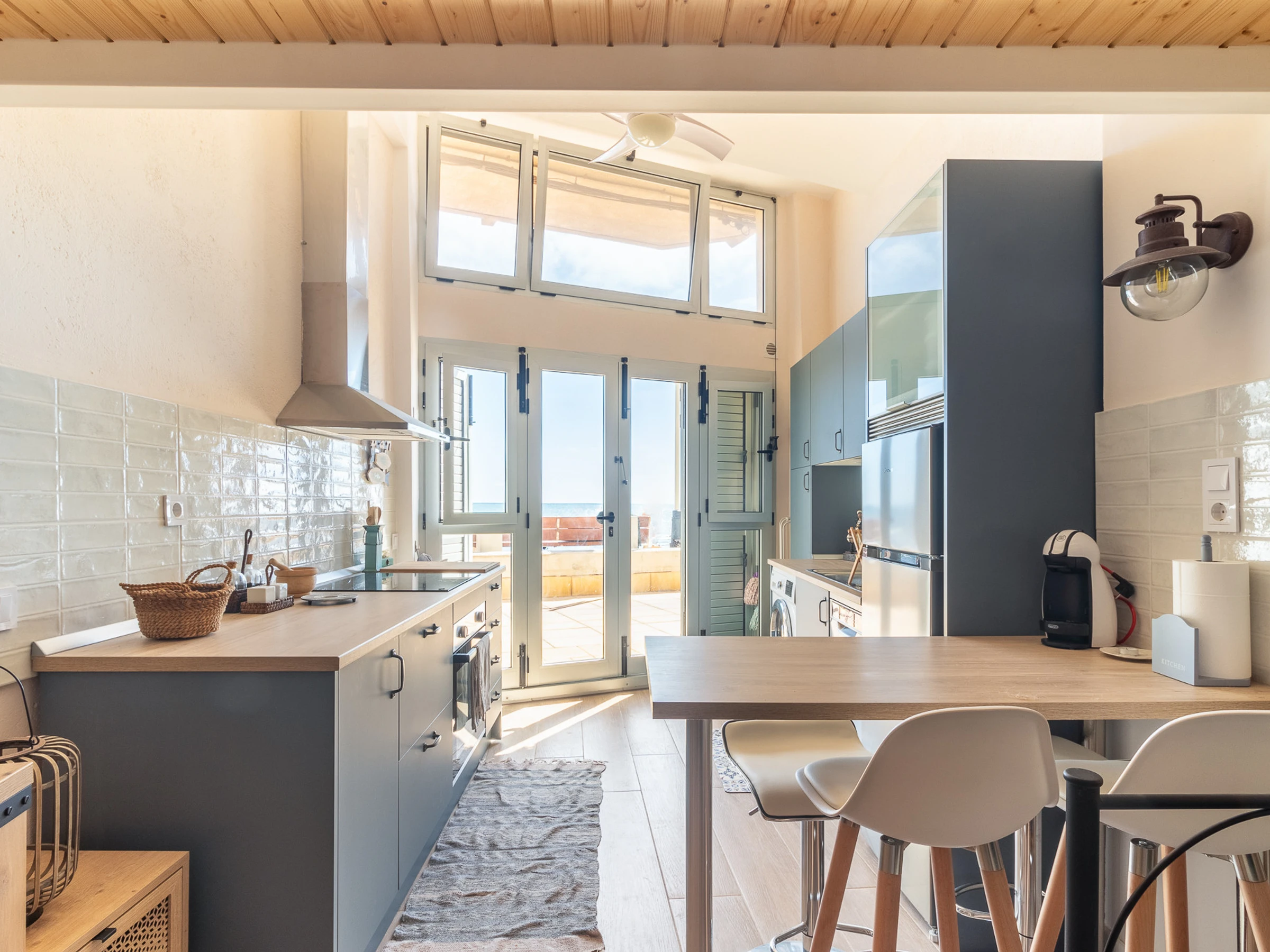 Dieses offene küche, mit ceranfeld, ist ausgestattet in kühlschrank, backofen, gefrierschrank, spülmaschine, geschirr/besteck, kochutensilien und kaffeemaschine.