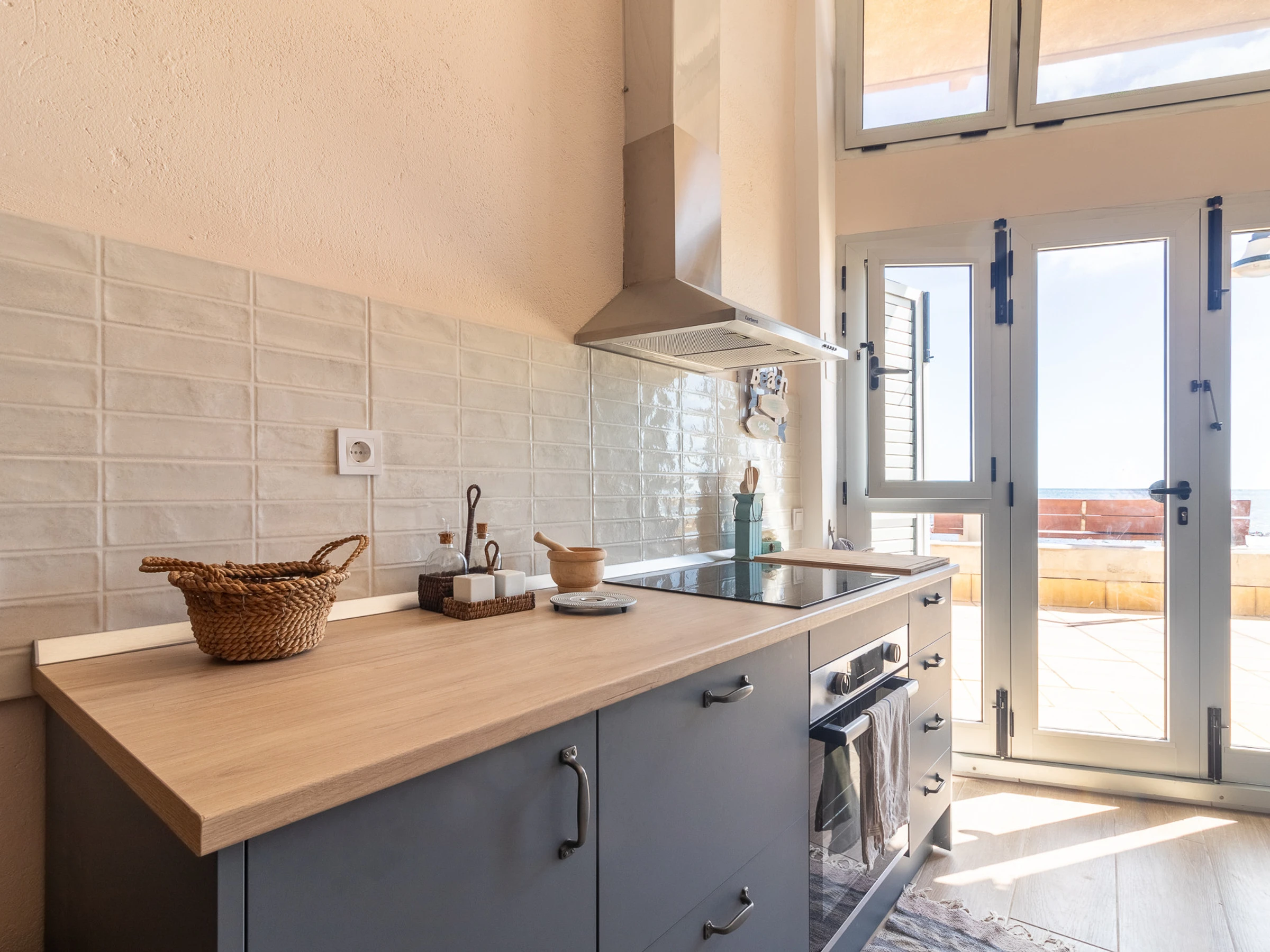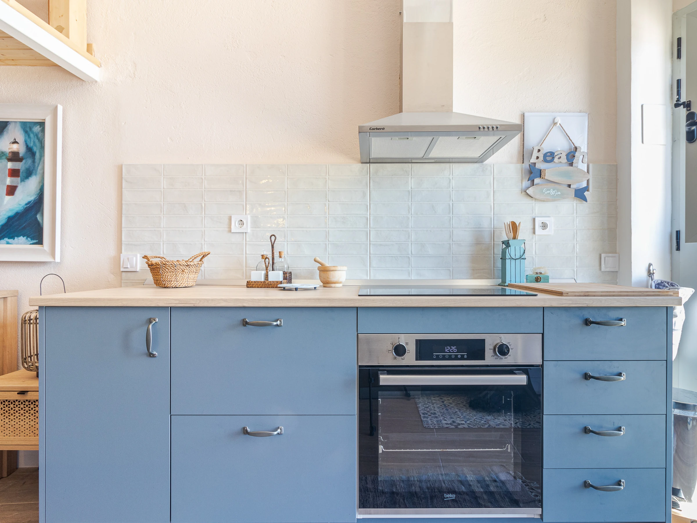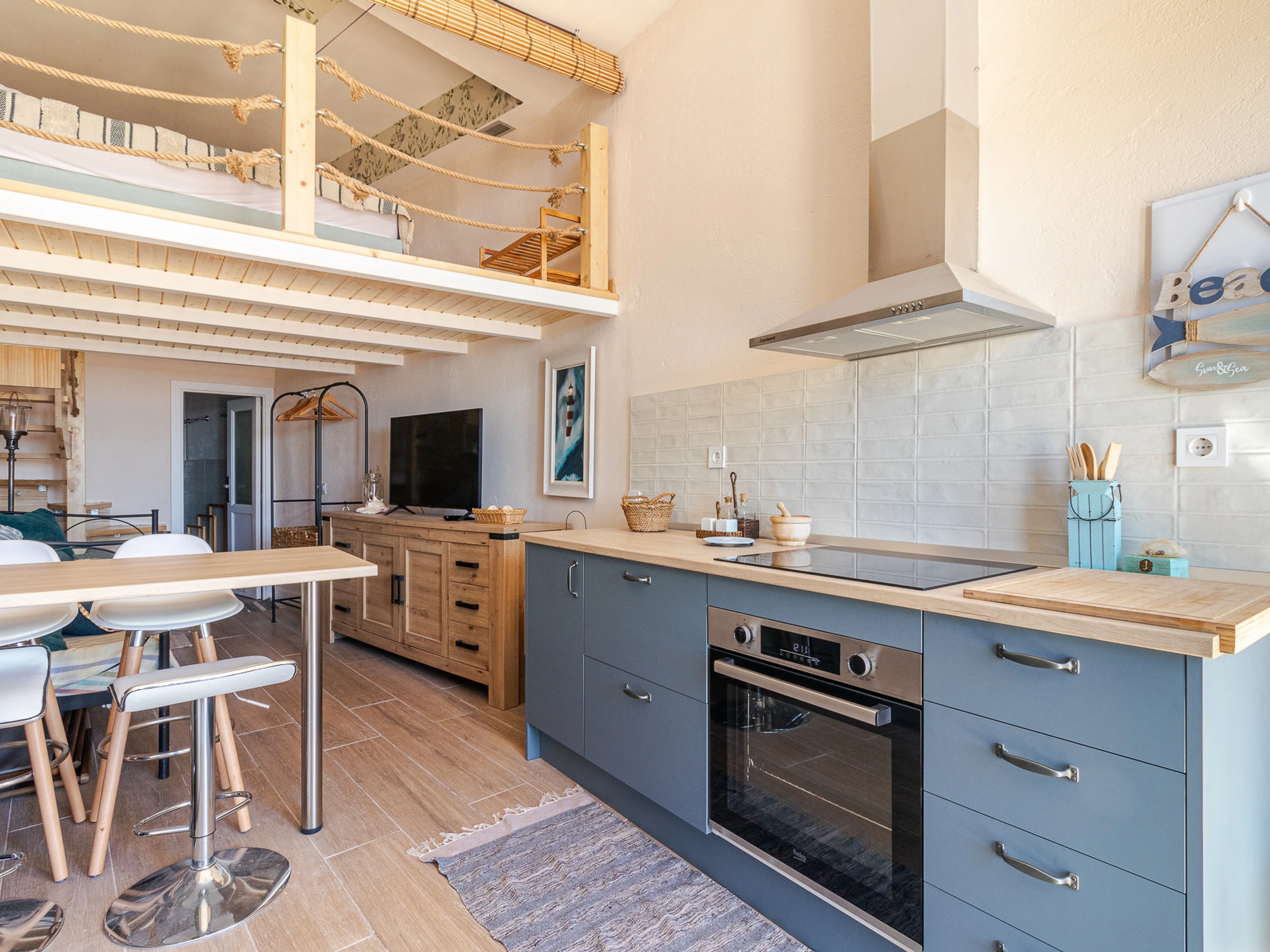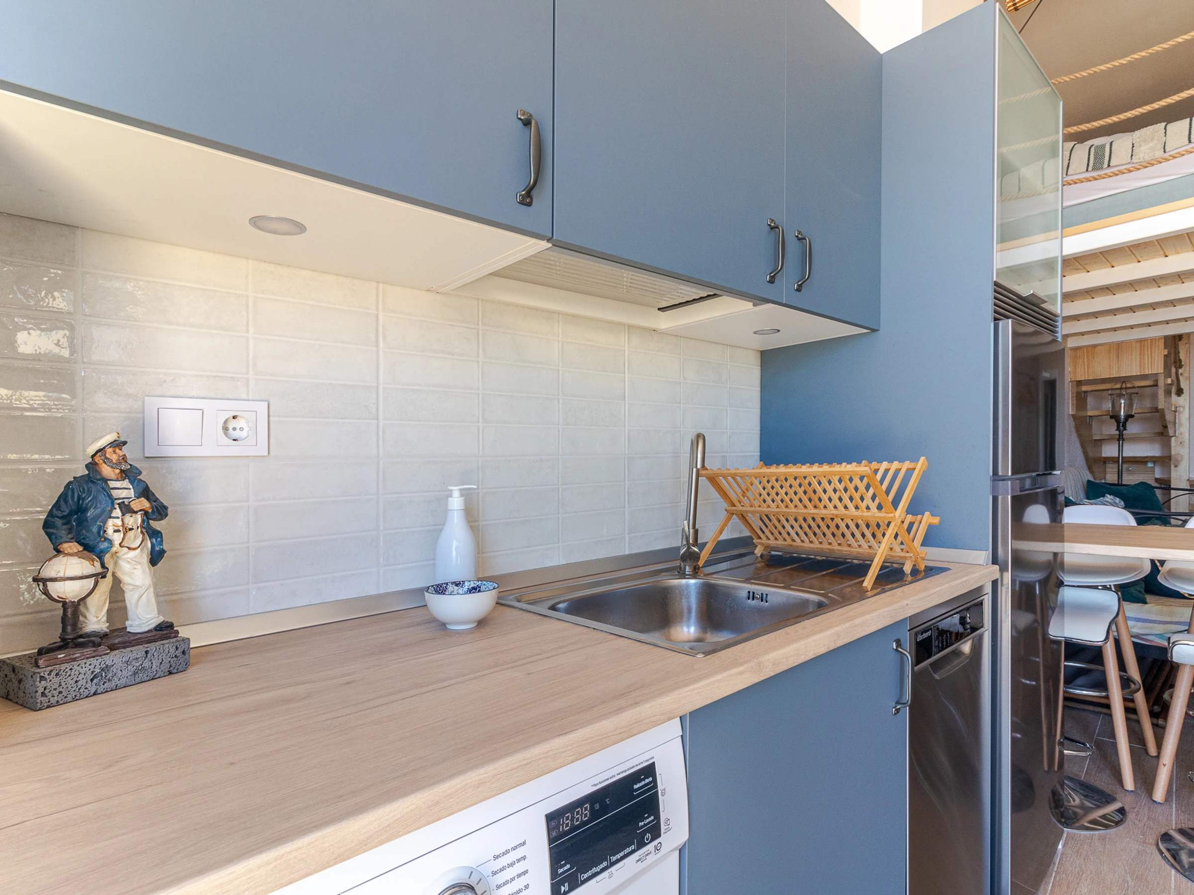 Dieses offene küche, mit ceranfeld, ist ausgestattet in kühlschrank, backofen, gefrierschrank, spülmaschine, geschirr/besteck, kochutensilien und kaffeemaschine.