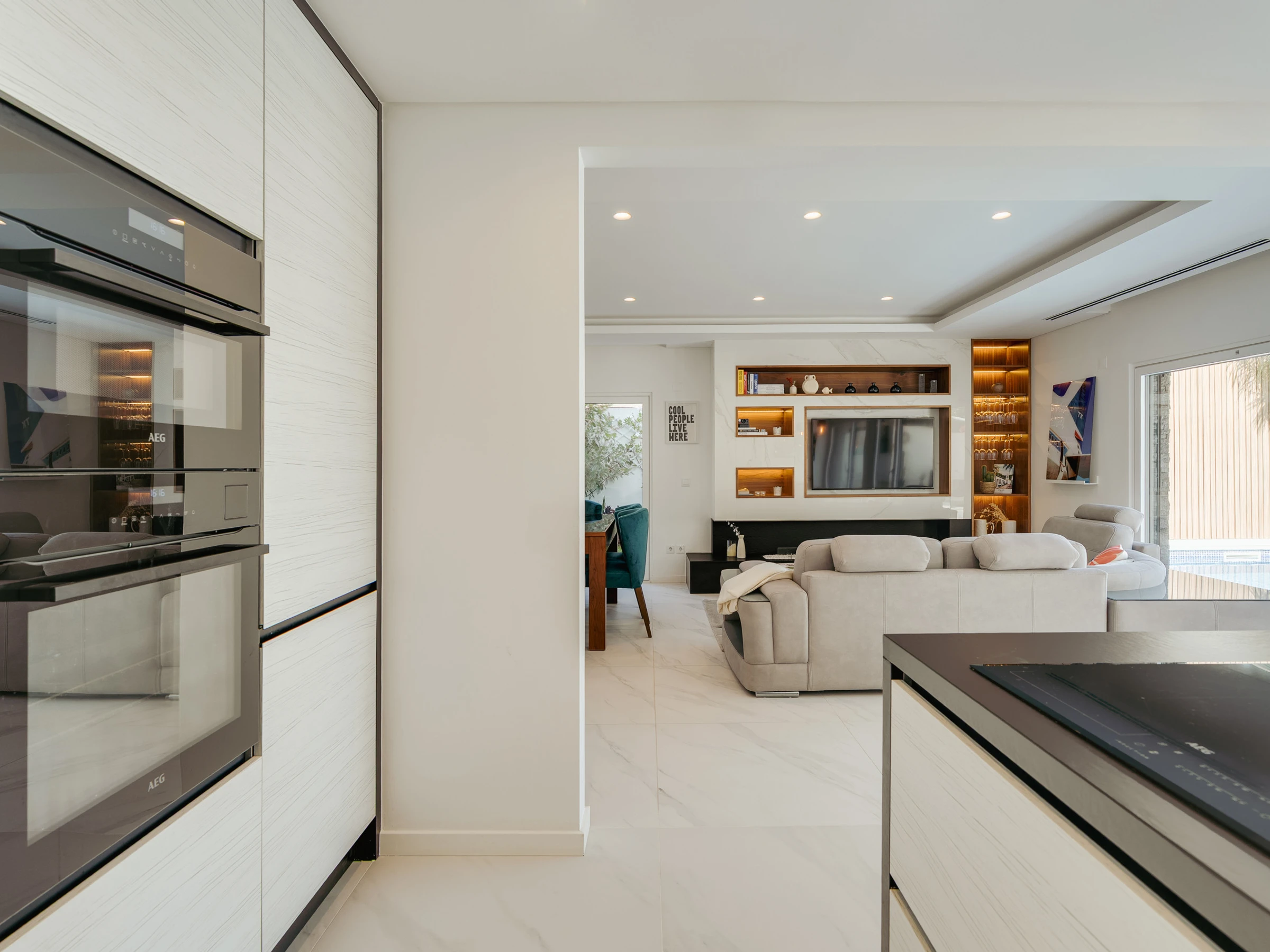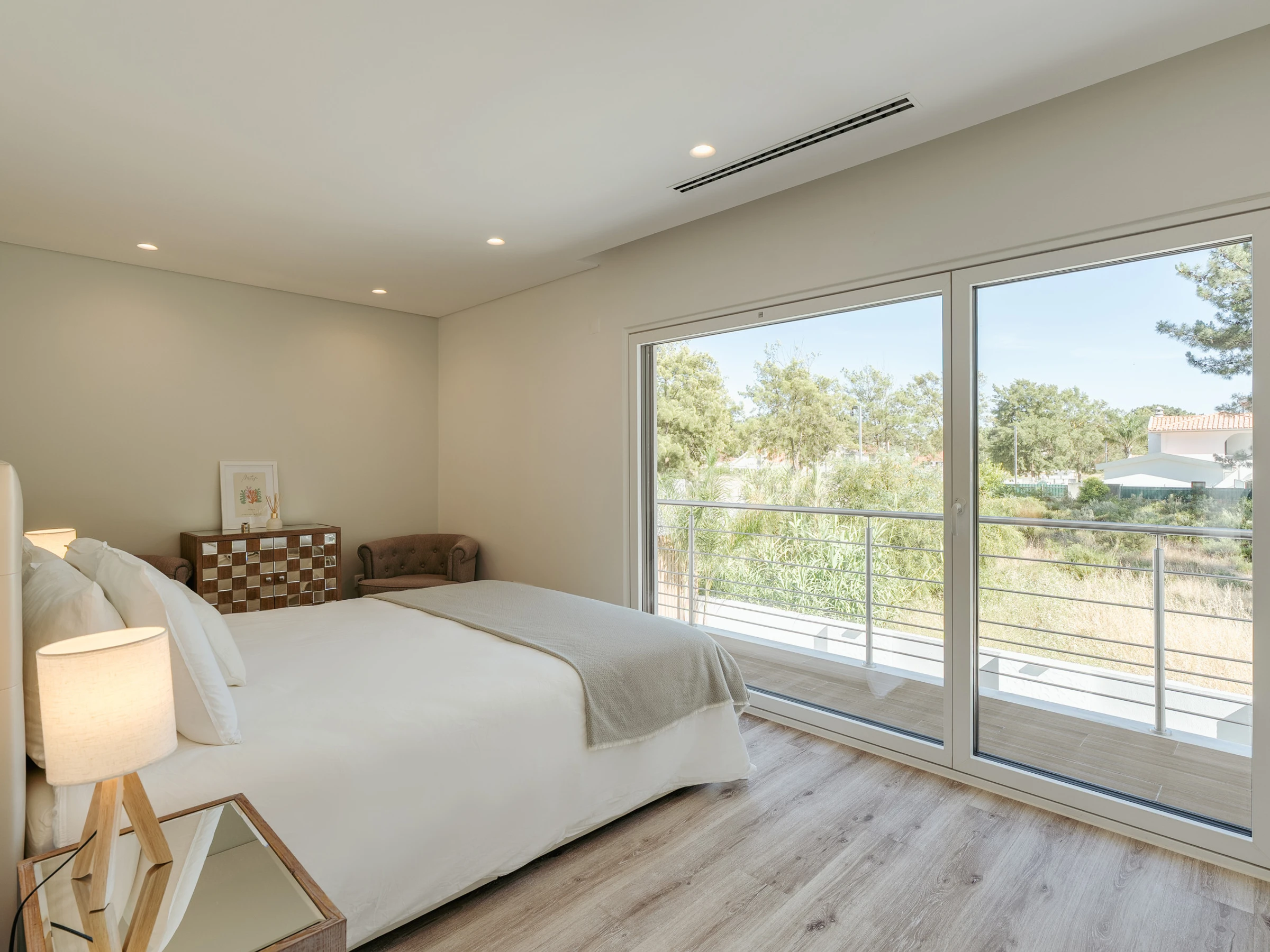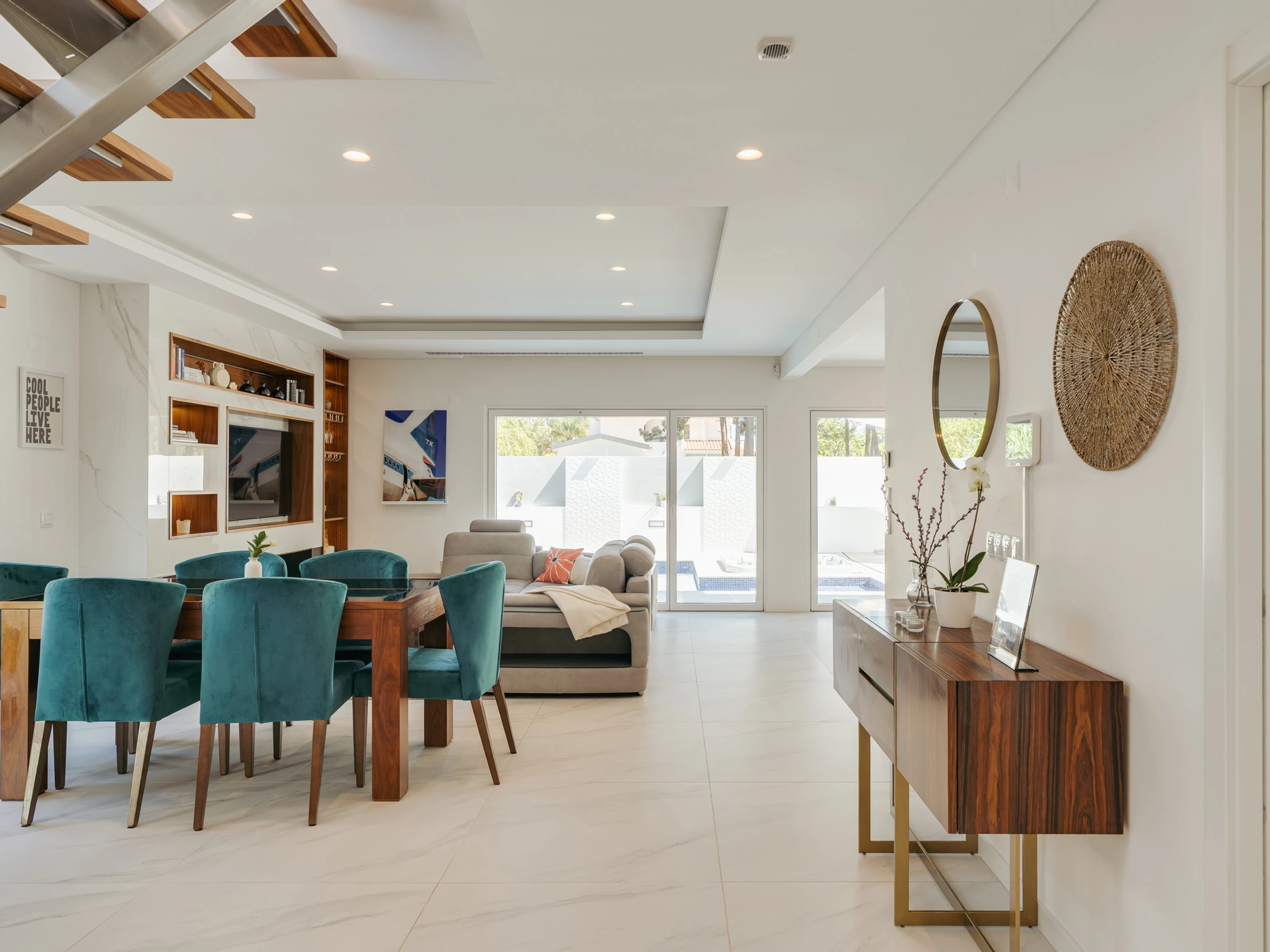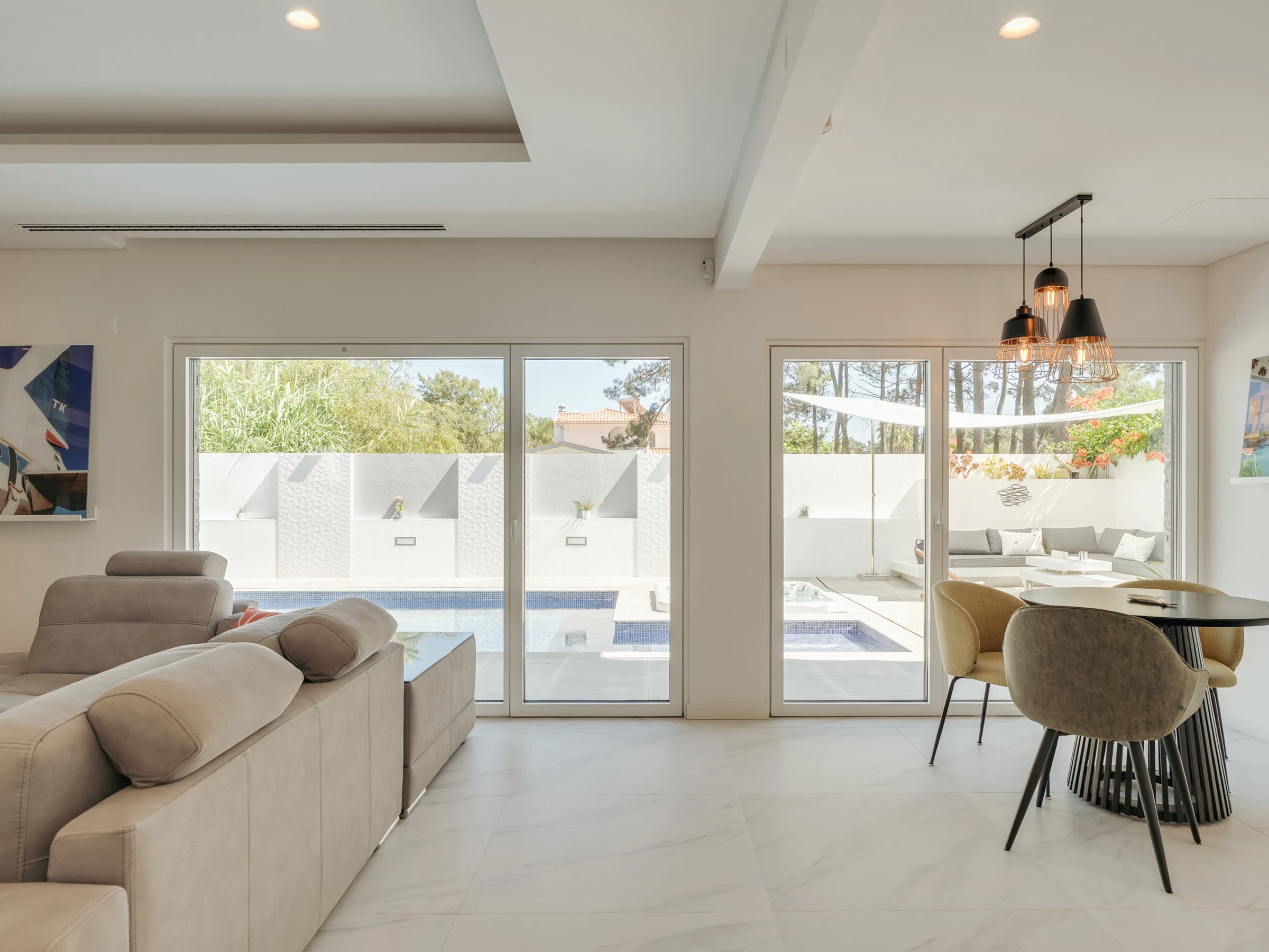 Im Inneren ist die Villa darauf ausgelegt, Raum, Funktionalität und eine einladende Atmosphäre zu bieten. Das Erdgeschoss verfügt über eine helle und offene Grundrissgestaltung mit einem geräumigen Wohn- und Essbereich, der nahtlos mit einer modernen amerikanischen Küche verbunden ist. Große Glastüren lassen natürliches Licht herein und ermöglichen einen einfachen Zugang zum Garten und Poolbereich. Ein Home-Office, das mit einem ausziehbaren Bett in ein Schlafzimmer umgewandelt werden kann, bietet zusätzliche Flexibilität für Gäste. Diese Ebene umfasst außerdem einen Waschraum, ein vollständiges Badezimmer und einen Inneneingang zur Garage. Im Obergeschoss befinden sich drei Doppelschlafzimmer, darunter eine Master-Suite mit Hydromassagewanne. Die beiden anderen Schlafzimmer teilen sich ein vollständiges Badezimmer mit einer begehbaren Dusche, und eines der Zimmer verfügt über Zugang zu einem großen Holzbalkon mit Sonnenliegen, der einen friedlichen Raum zum Entspannen bietet.