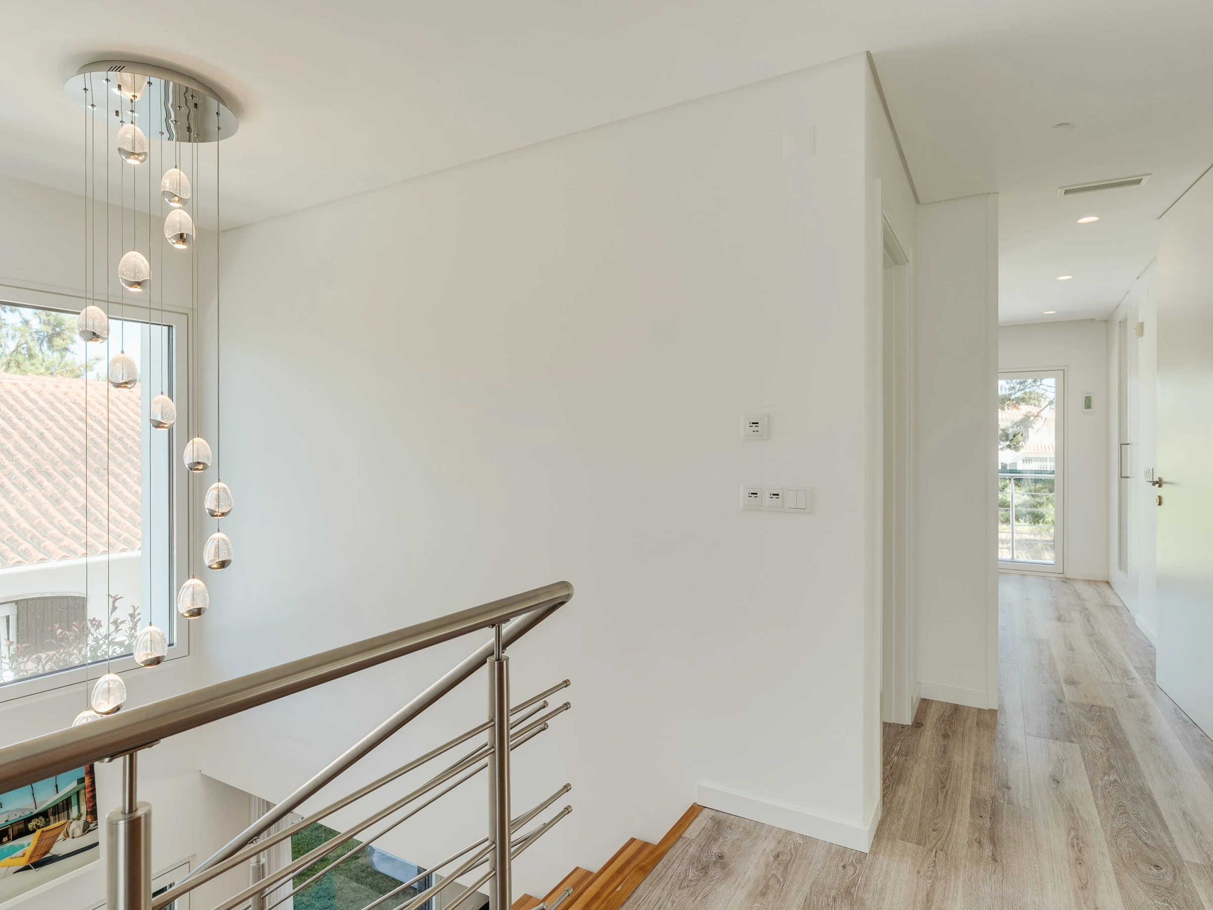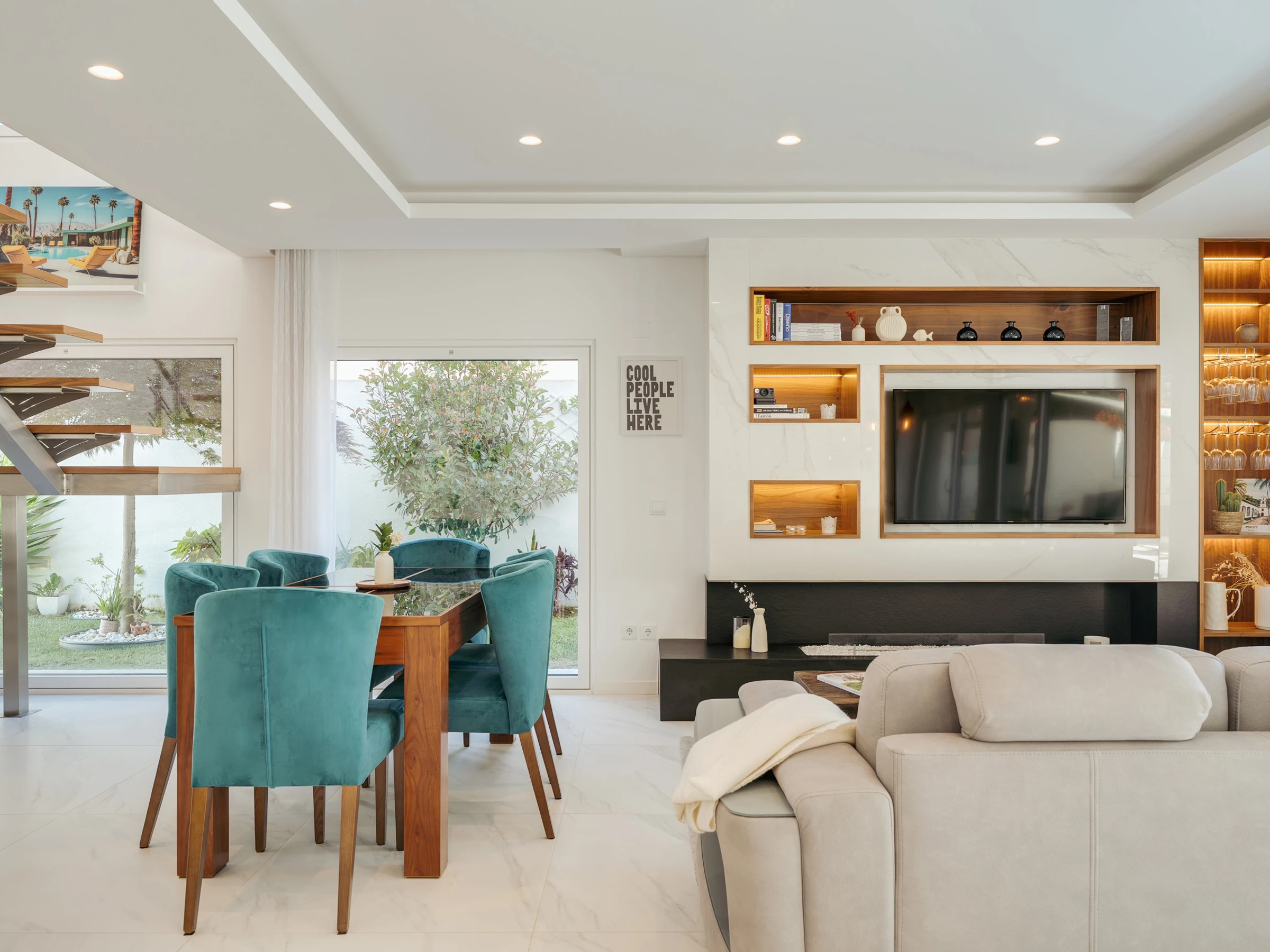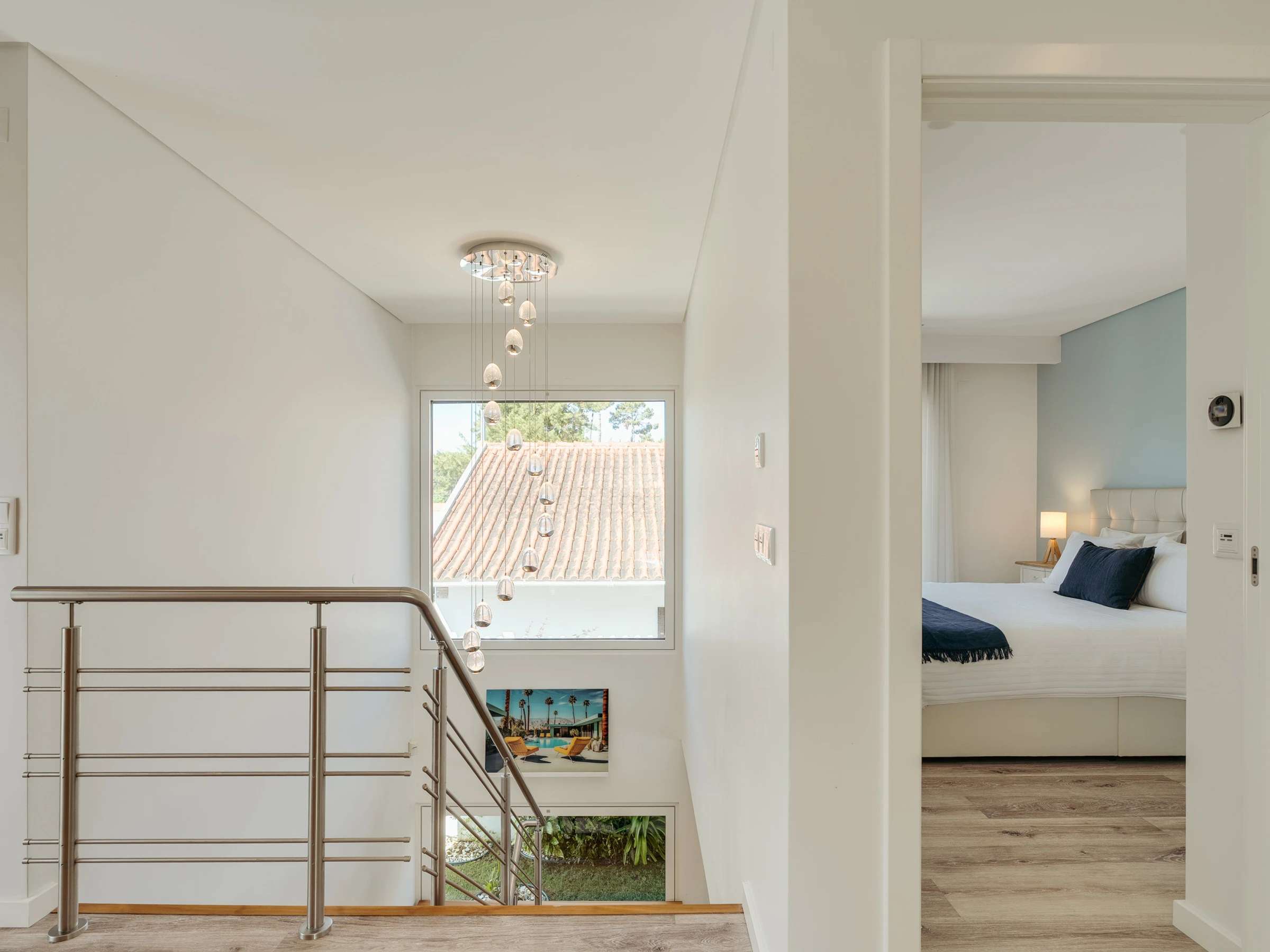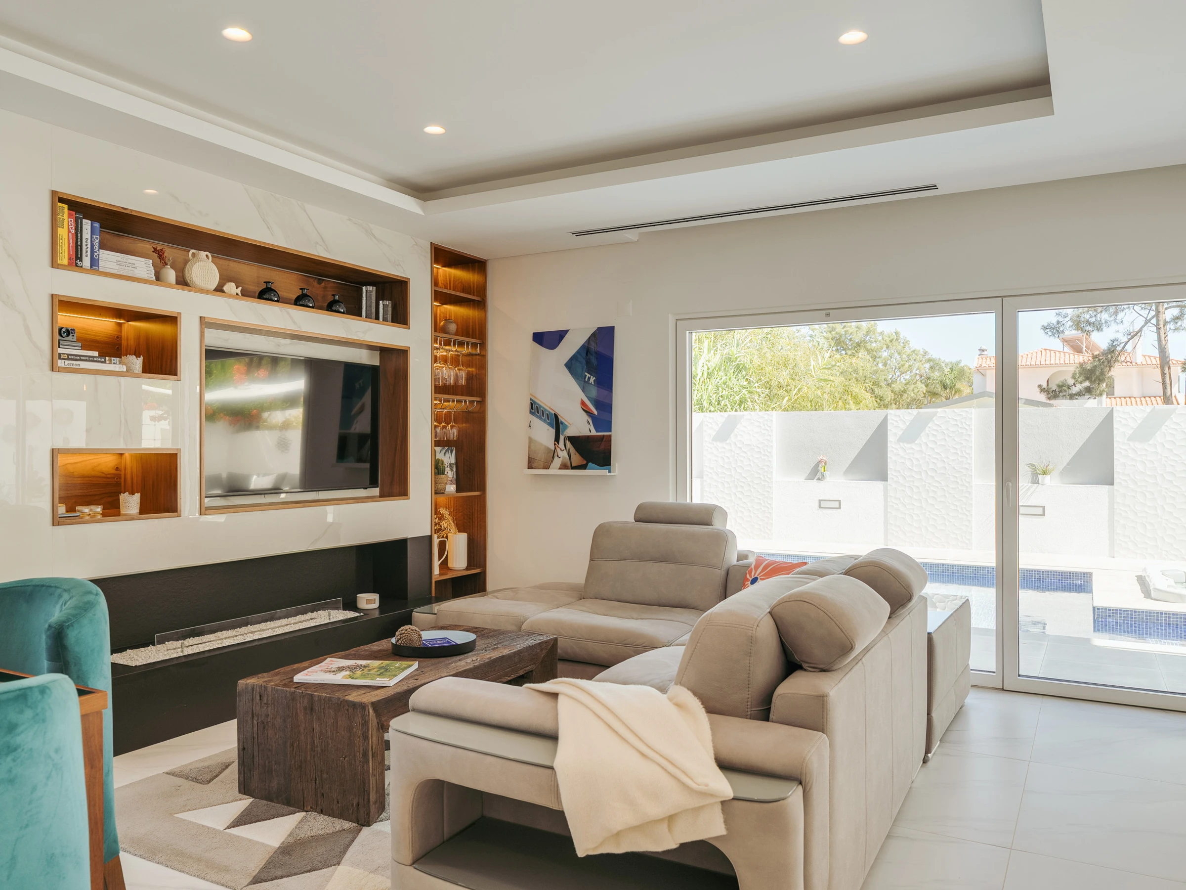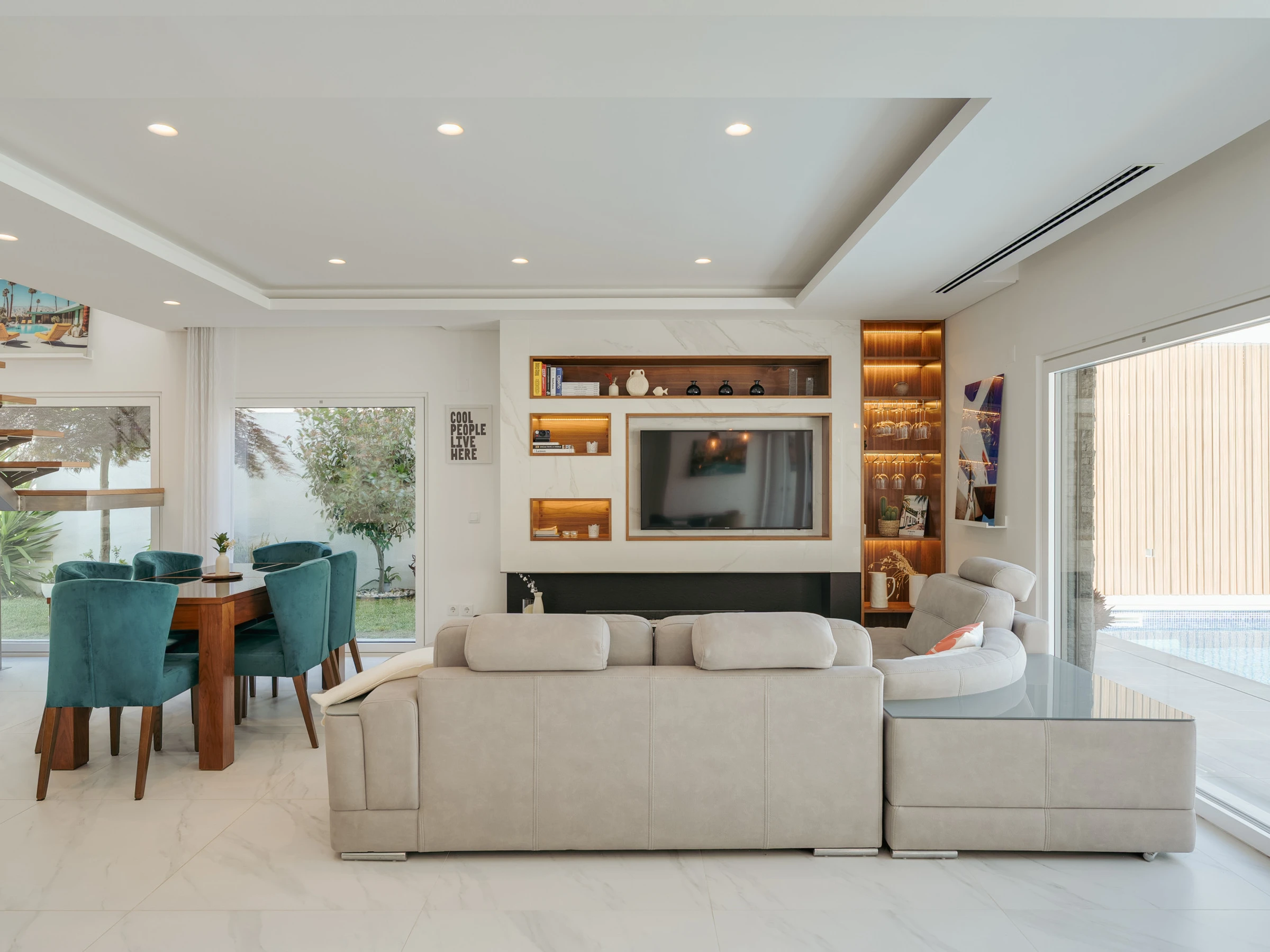Im Inneren ist die Villa darauf ausgelegt, Raum, Funktionalität und eine einladende Atmosphäre zu bieten. Das Erdgeschoss verfügt über eine helle und offene Grundrissgestaltung mit einem geräumigen Wohn- und Essbereich, der nahtlos mit einer modernen amerikanischen Küche verbunden ist. Große Glastüren lassen natürliches Licht herein und ermöglichen einen einfachen Zugang zum Garten und Poolbereich. Ein Home-Office, das mit einem ausziehbaren Bett in ein Schlafzimmer umgewandelt werden kann, bietet zusätzliche Flexibilität für Gäste. Diese Ebene umfasst außerdem einen Waschraum, ein vollständiges Badezimmer und einen Inneneingang zur Garage. Im Obergeschoss befinden sich drei Doppelschlafzimmer, darunter eine Master-Suite mit Hydromassagewanne. Die beiden anderen Schlafzimmer teilen sich ein vollständiges Badezimmer mit einer begehbaren Dusche, und eines der Zimmer verfügt über Zugang zu einem großen Holzbalkon mit Sonnenliegen, der einen friedlichen Raum zum Entspannen bietet.