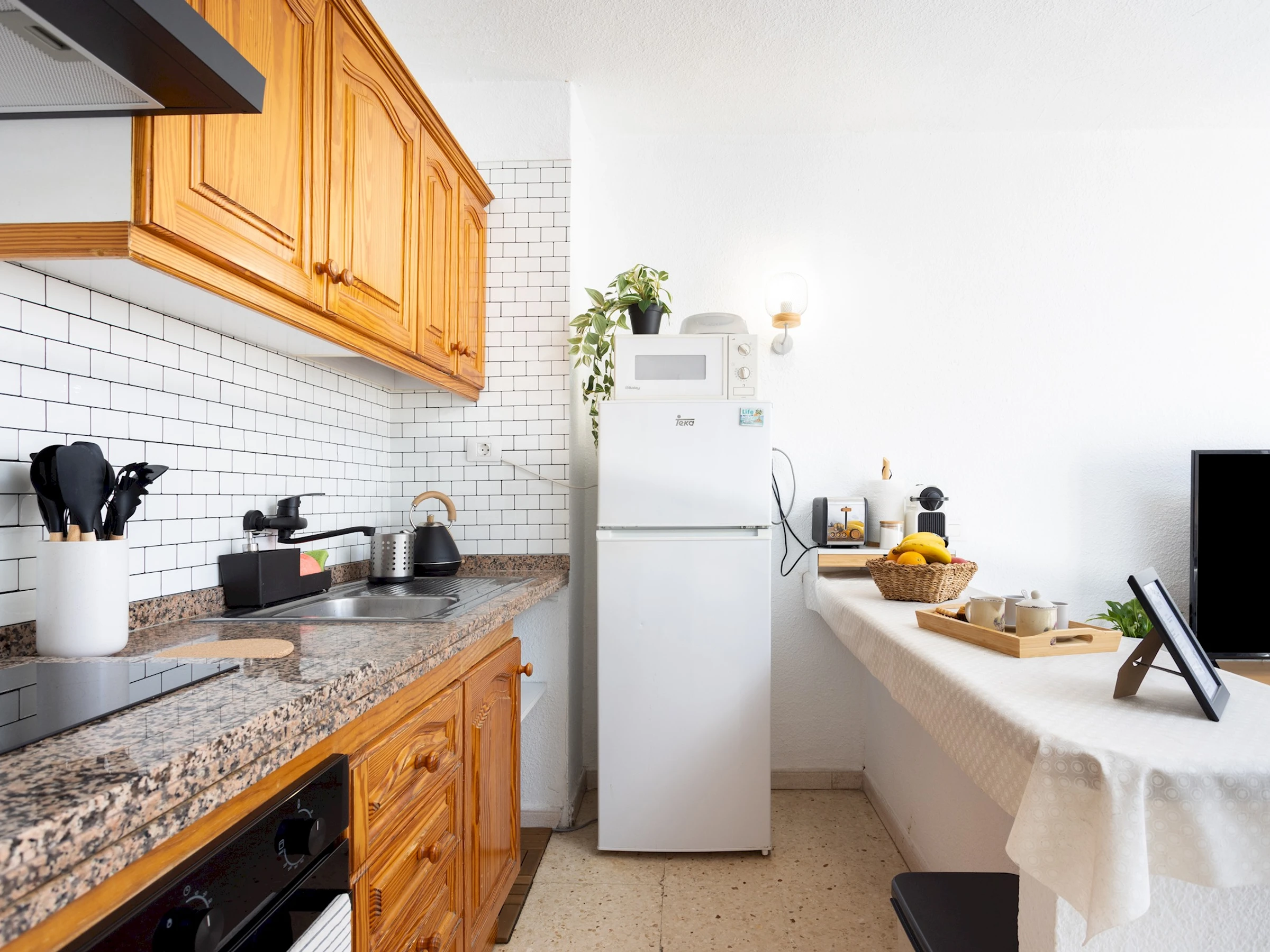 Dieses küche, ist ausgestattet in mikrowelle, backofen, kochutensilien und kaffeemaschine.