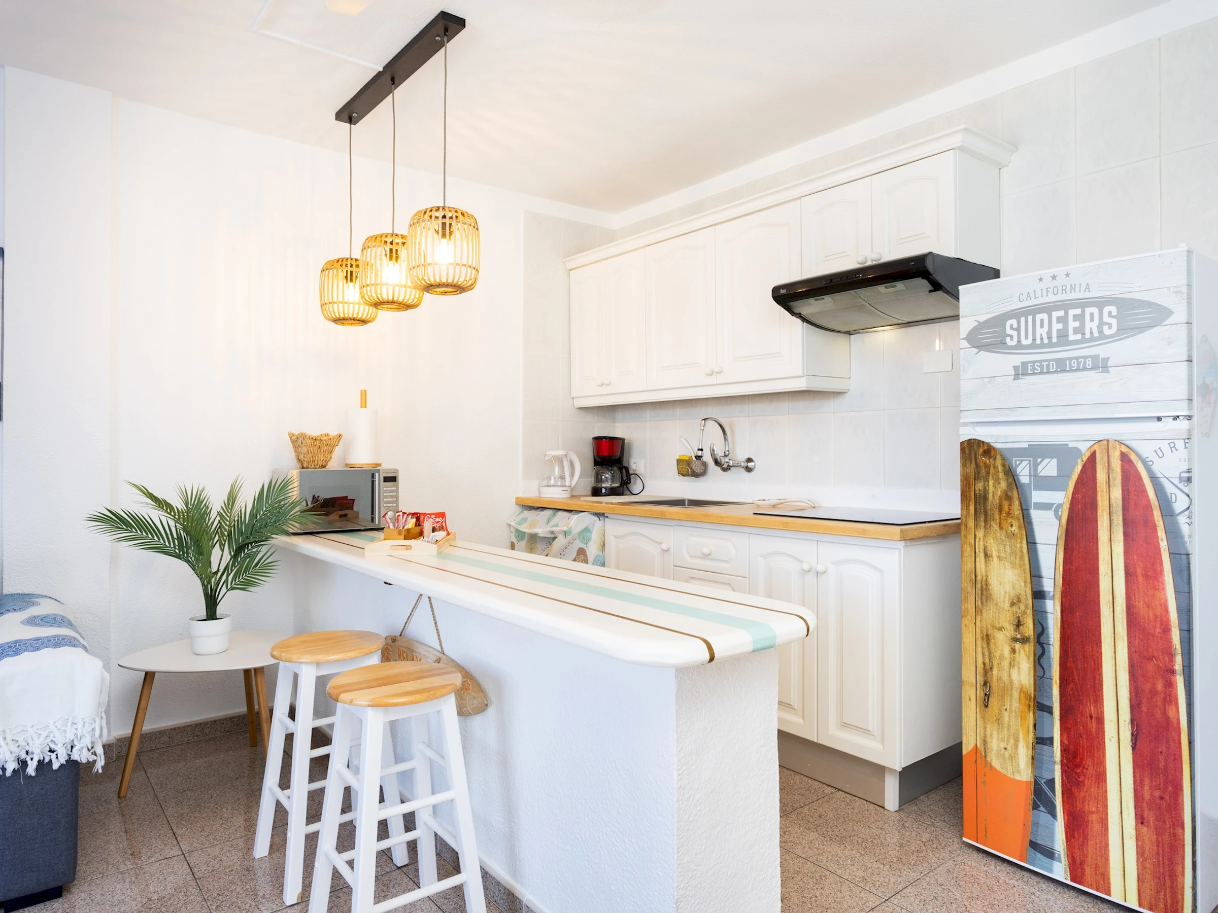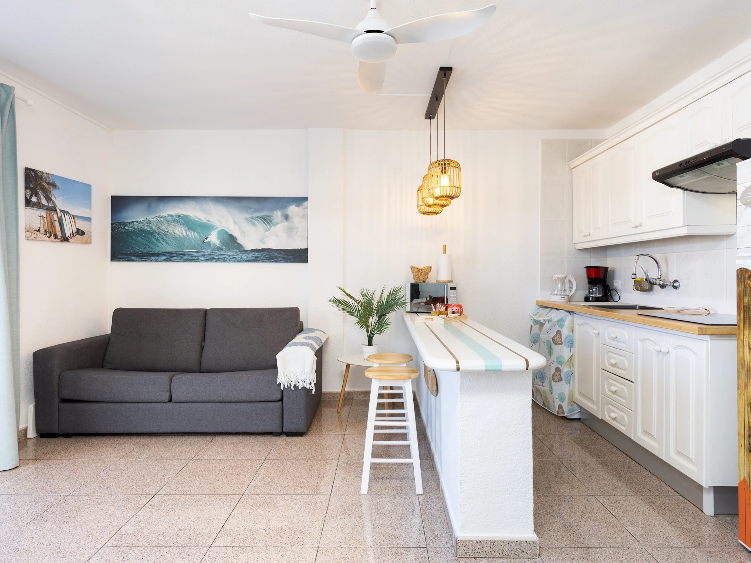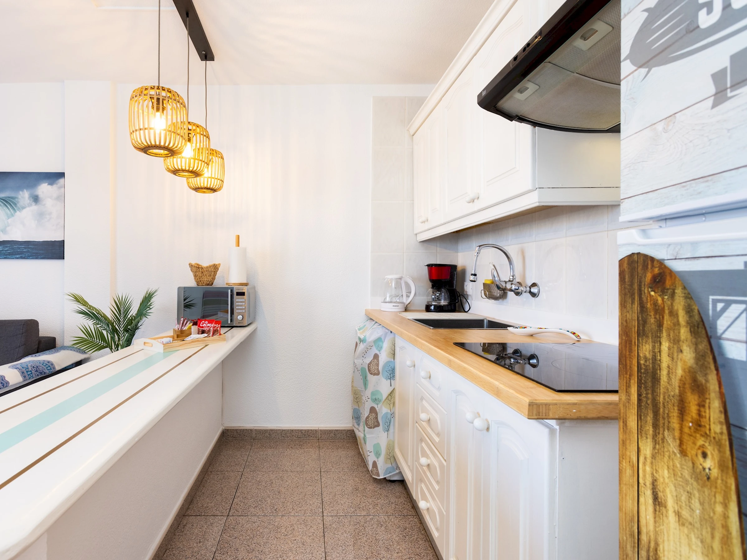 Dieses küche, ist ausgestattet in mikrowelle, kochutensilien und kaffeemaschine.