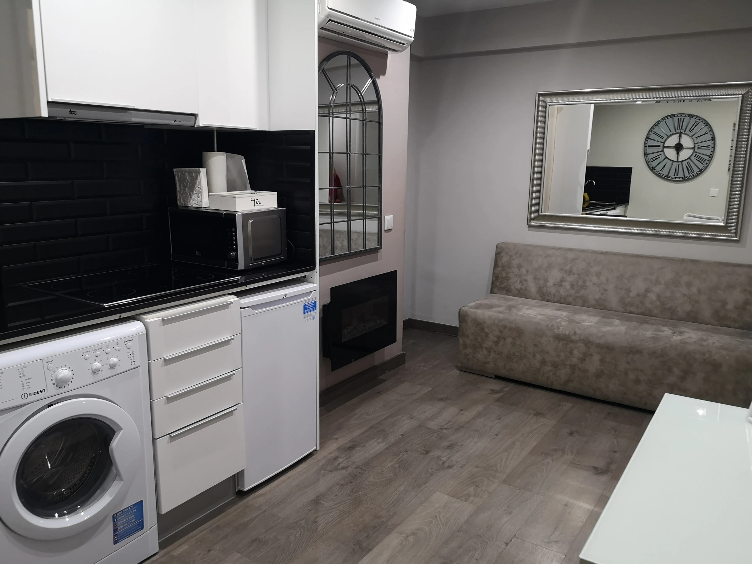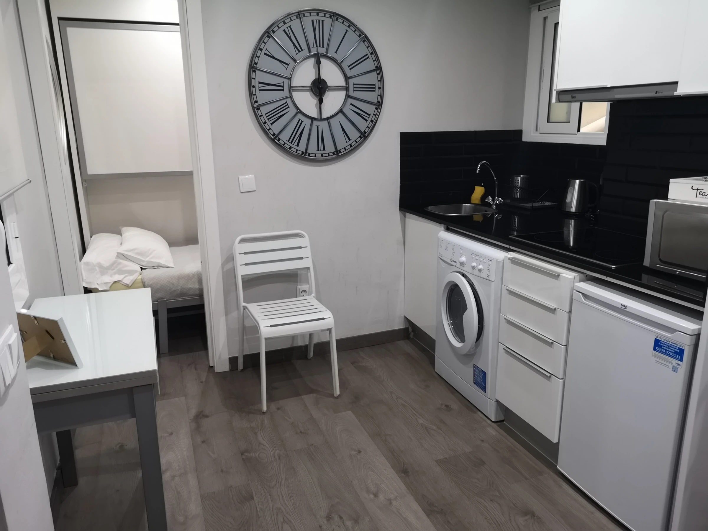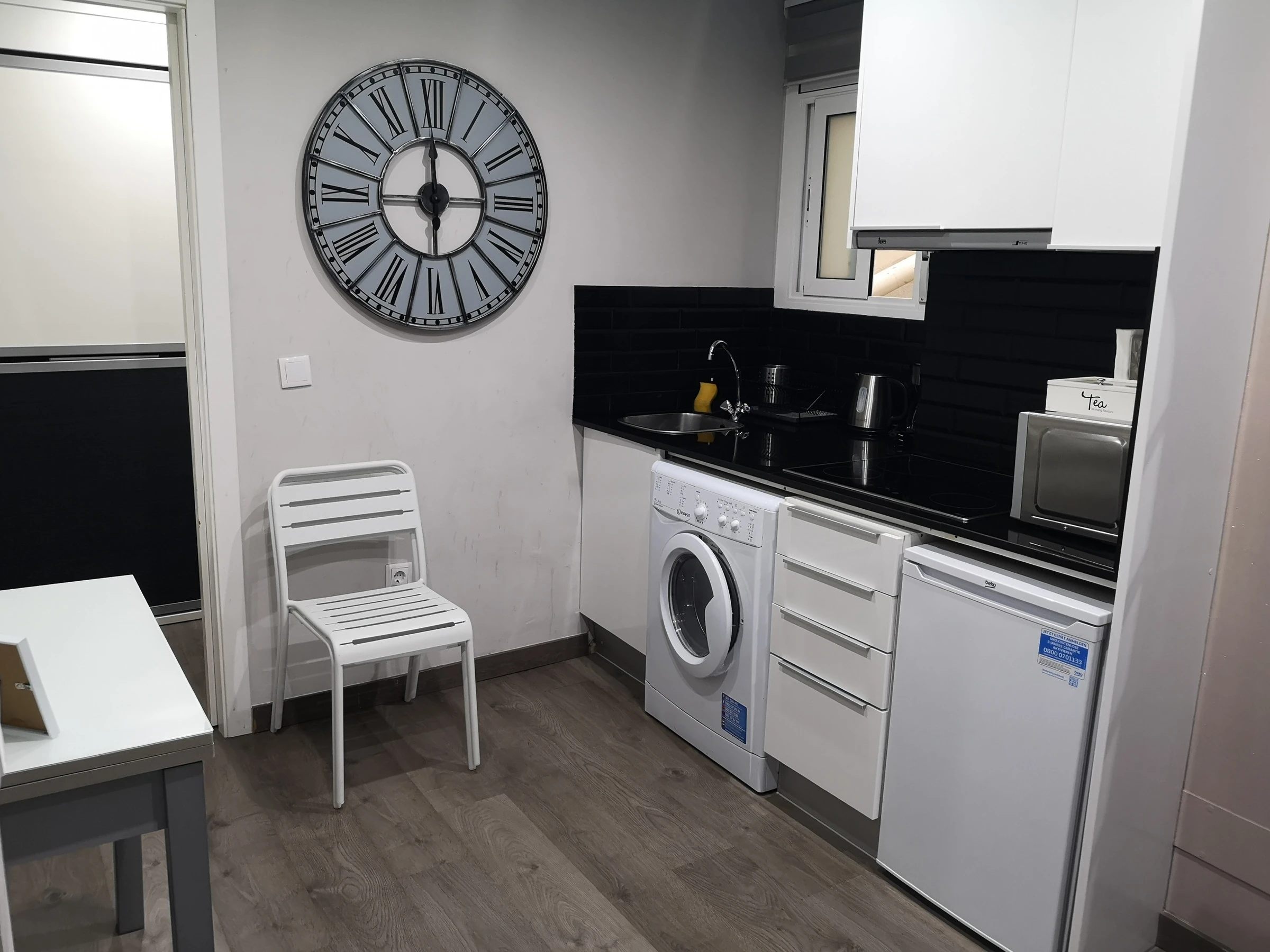 Dieses offene küche, mit induktions-kochfeld, ist ausgestattet in kühlschrank, mikrowelle, backofen, gefrierschrank, geschirr/besteck, kochutensilien, kaffeemaschine, toaster und wasserkocher.
