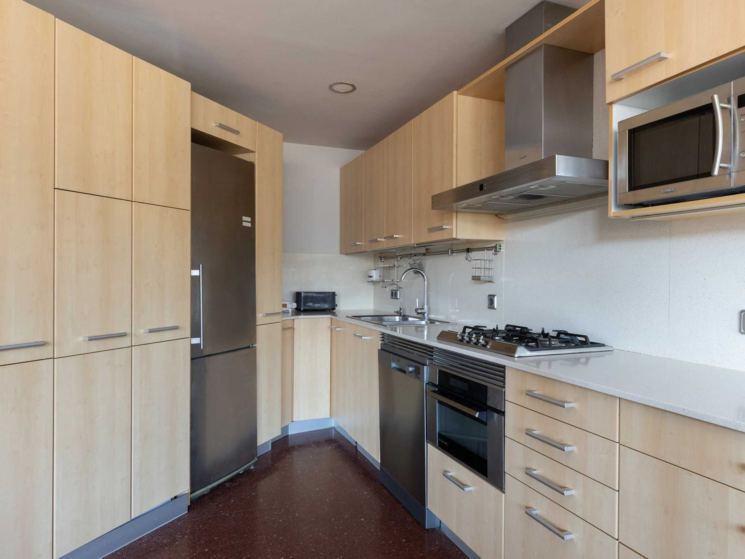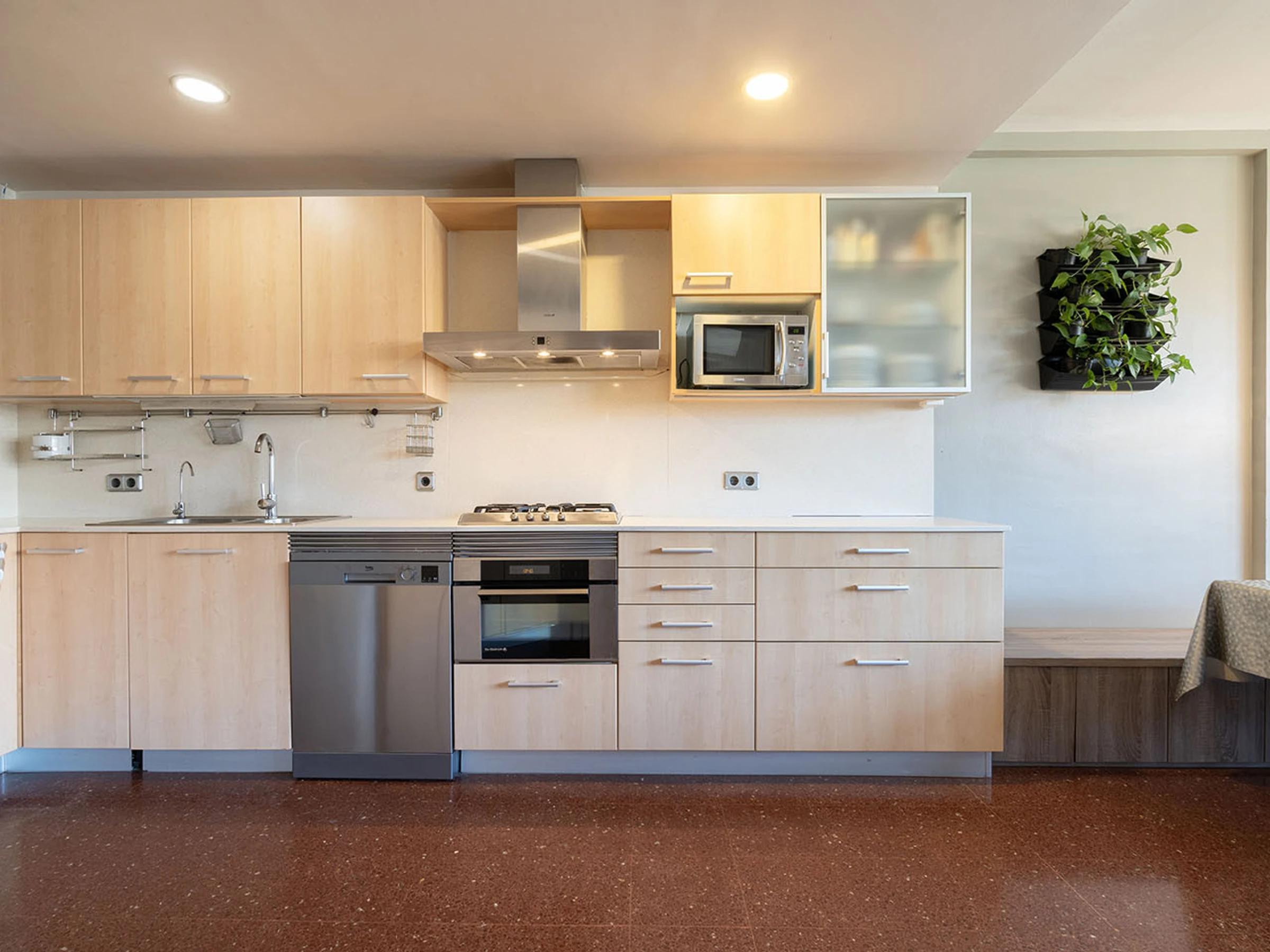 Dieses offene küche, mit gas-kochfeld, ist ausgestattet in kühlschrank, mikrowelle, backofen, gefrierschrank, spülmaschine, geschirr/besteck, kochutensilien, kaffeemaschine, toaster und wasserkocher.