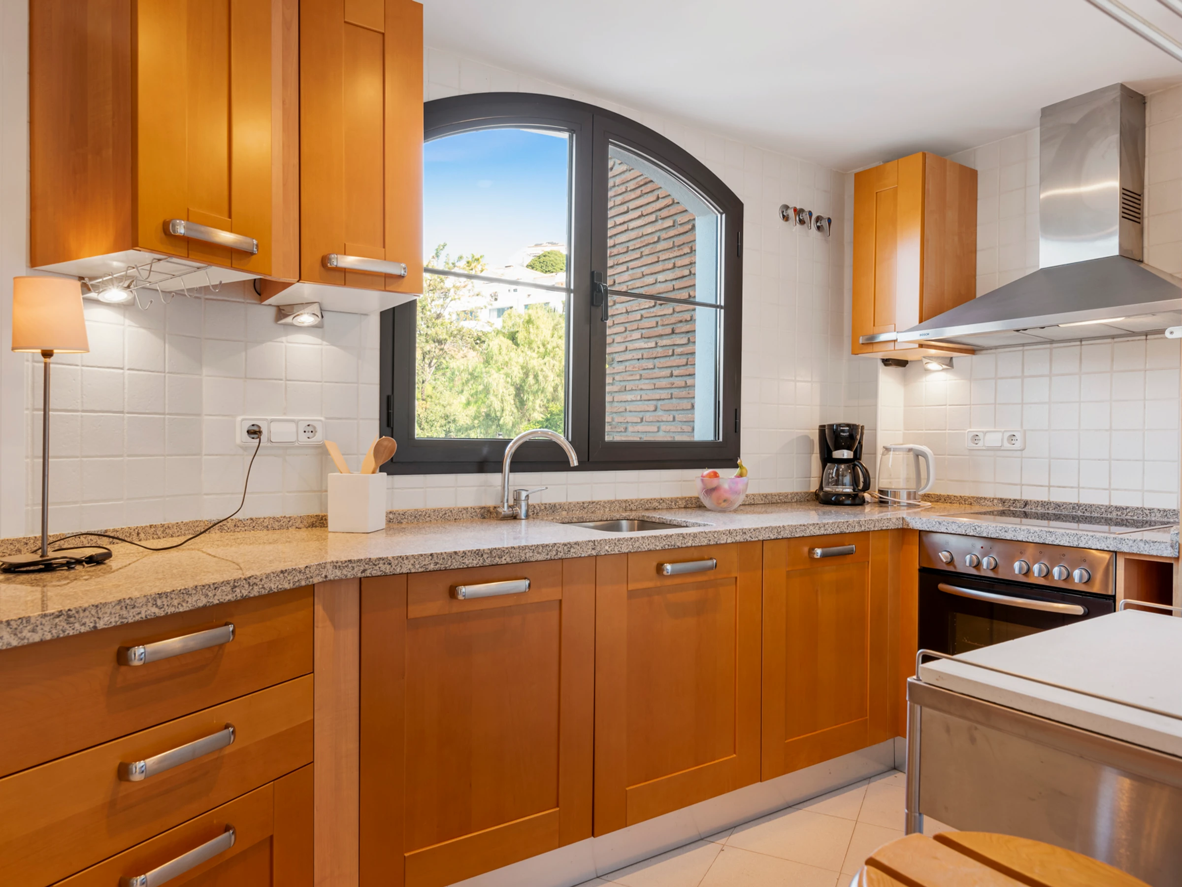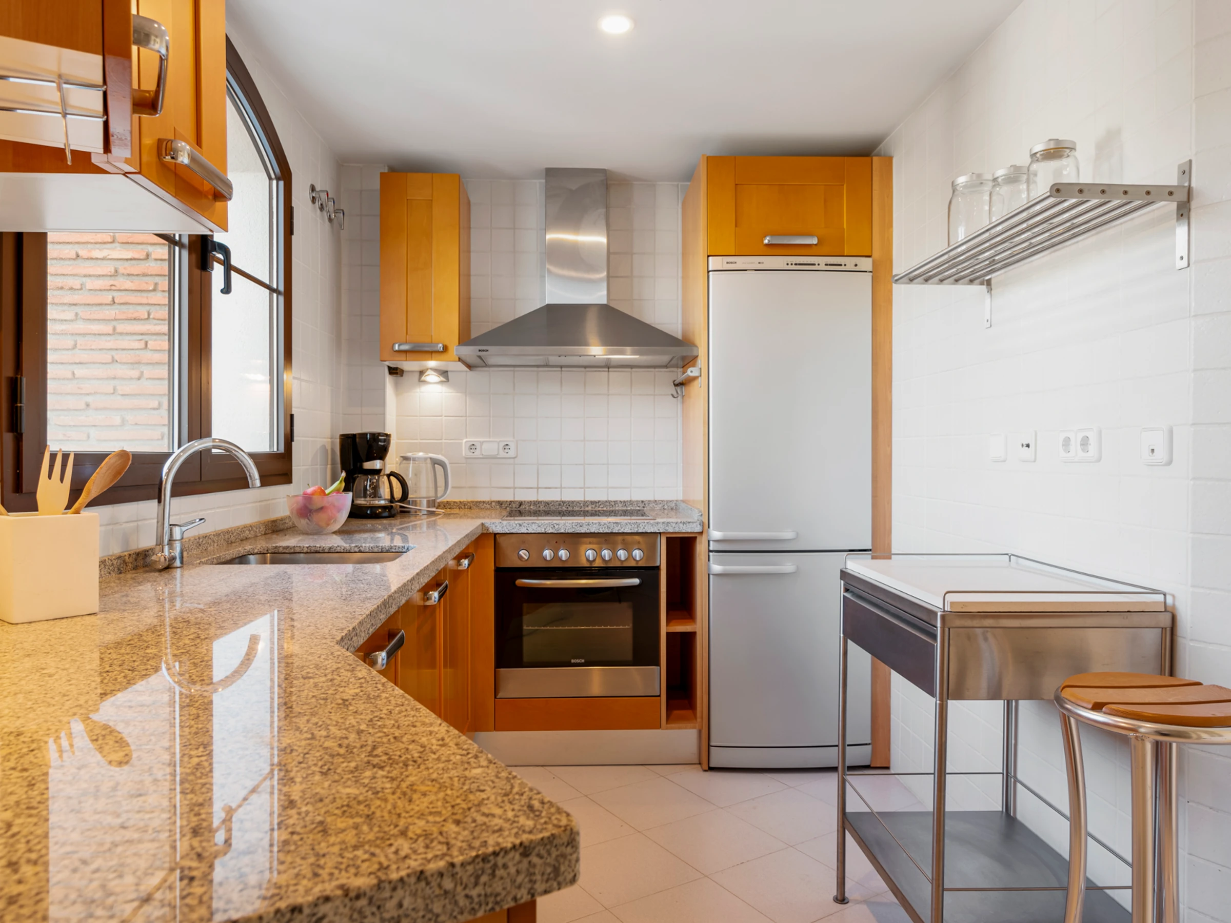 Dieses küche, ist ausgestattet in kühlschrank, backofen, gefrierschrank, spülmaschine, kochutensilien, kaffeemaschine und wasserkocher.