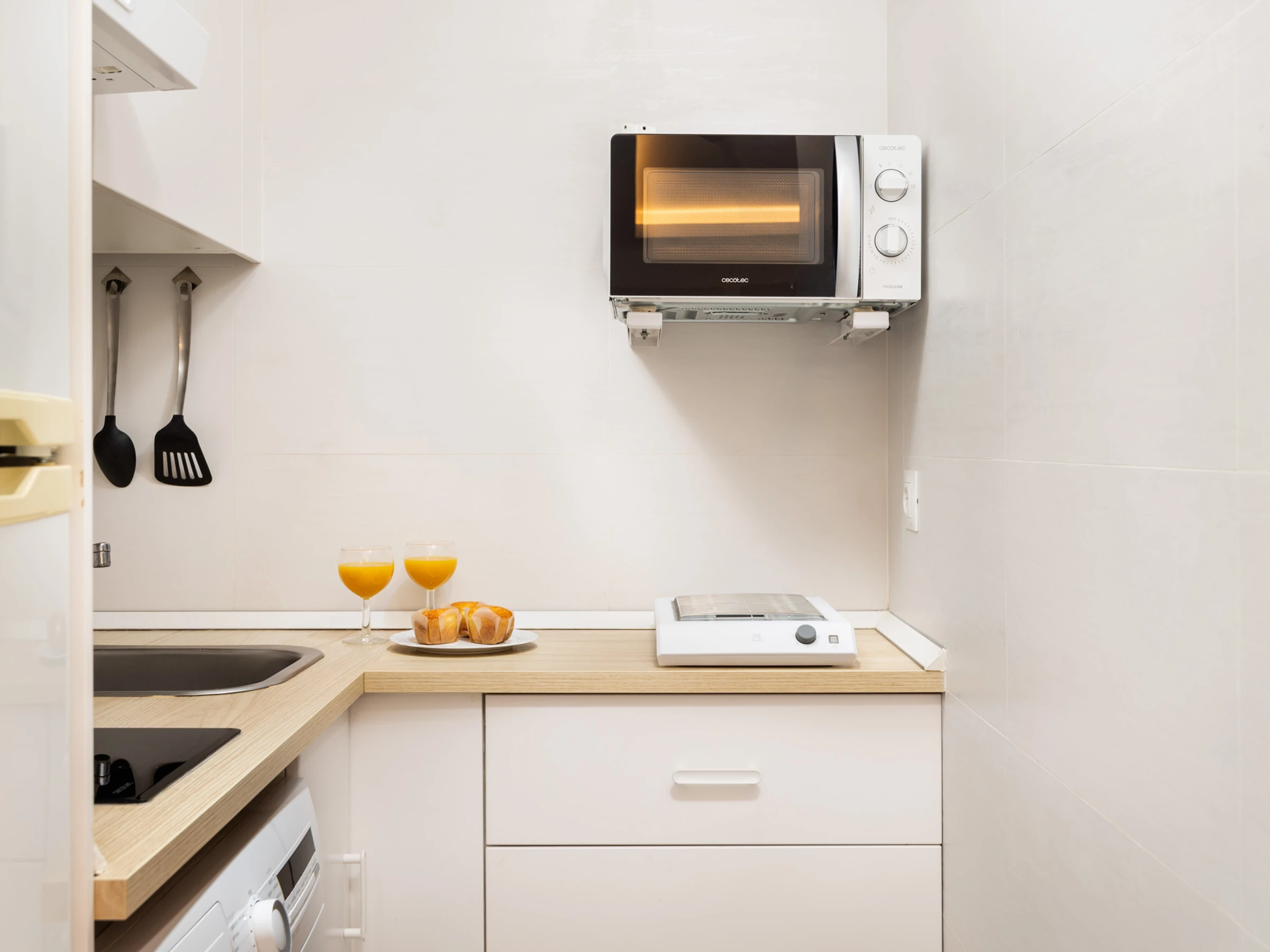 Dieses offene küche, mit ceranfeld, ist ausgestattet in kühlschrank, mikrowelle, gefrierschrank, geschirr/besteck, kochutensilien, kaffeemaschine, toaster, wasserkocher und saftpresse.