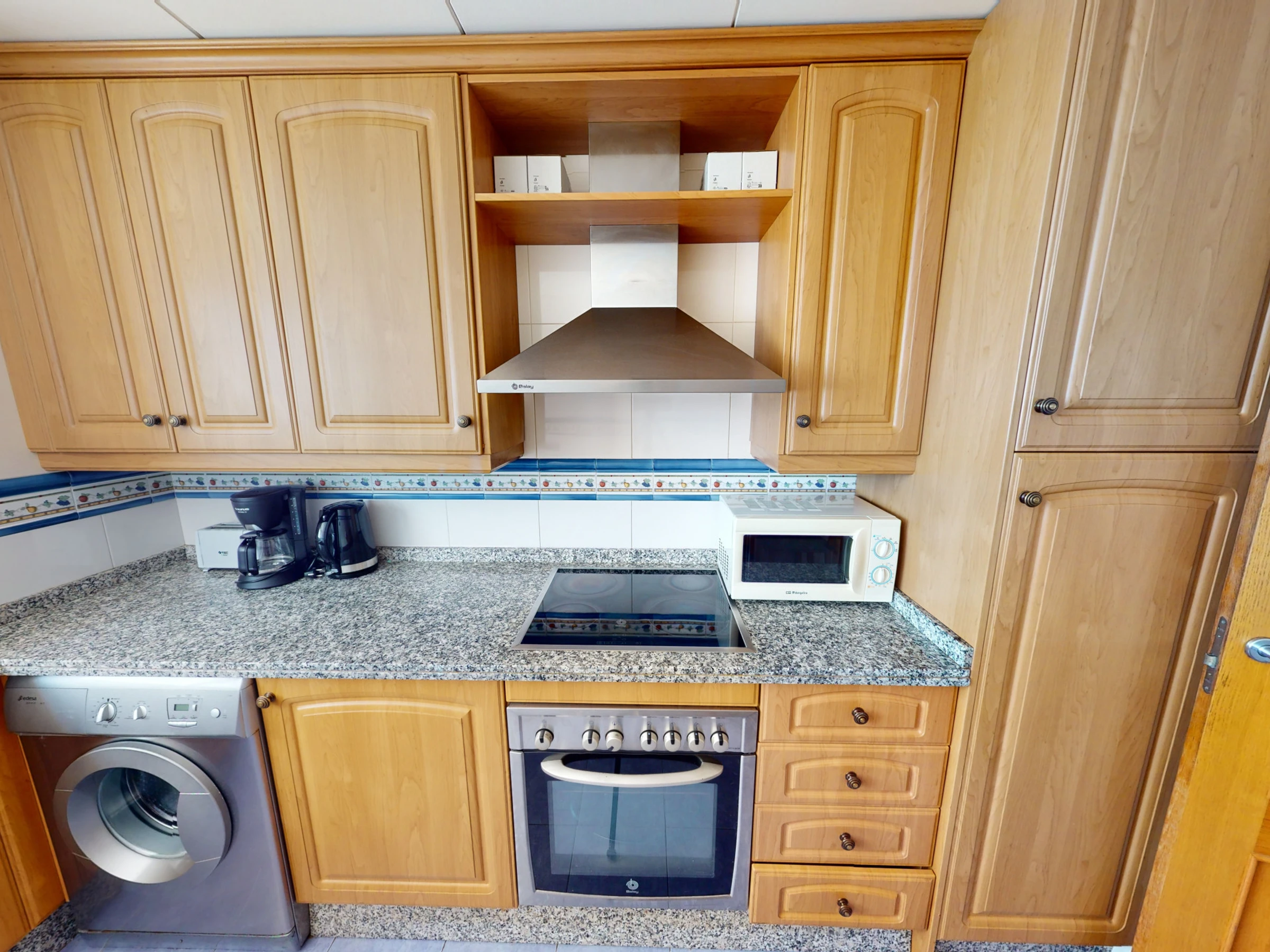 Dieses separate küche, mit ceranfeld, ist ausgestattet in kühlschrank, mikrowelle, backofen, gefrierschrank, spülmaschine, geschirr/besteck, kochutensilien, kaffeemaschine, toaster, wasserkocher und saftpresse.