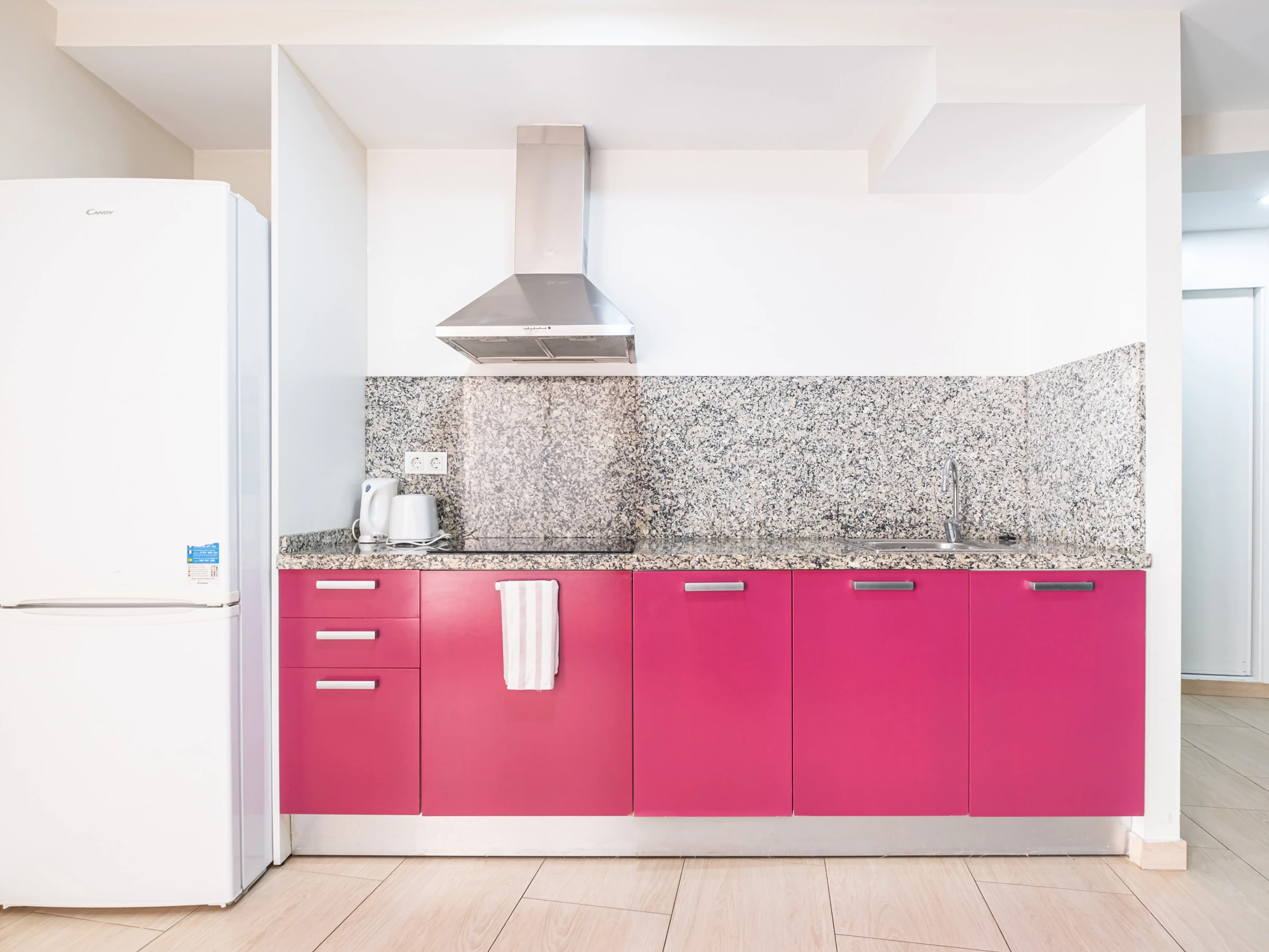 Dieses offene küche, mit ceranfeld, ist ausgestattet in kühlschrank, mikrowelle, gefrierschrank, geschirr/besteck, kochutensilien, kaffeemaschine, toaster, wasserkocher und saftpresse.