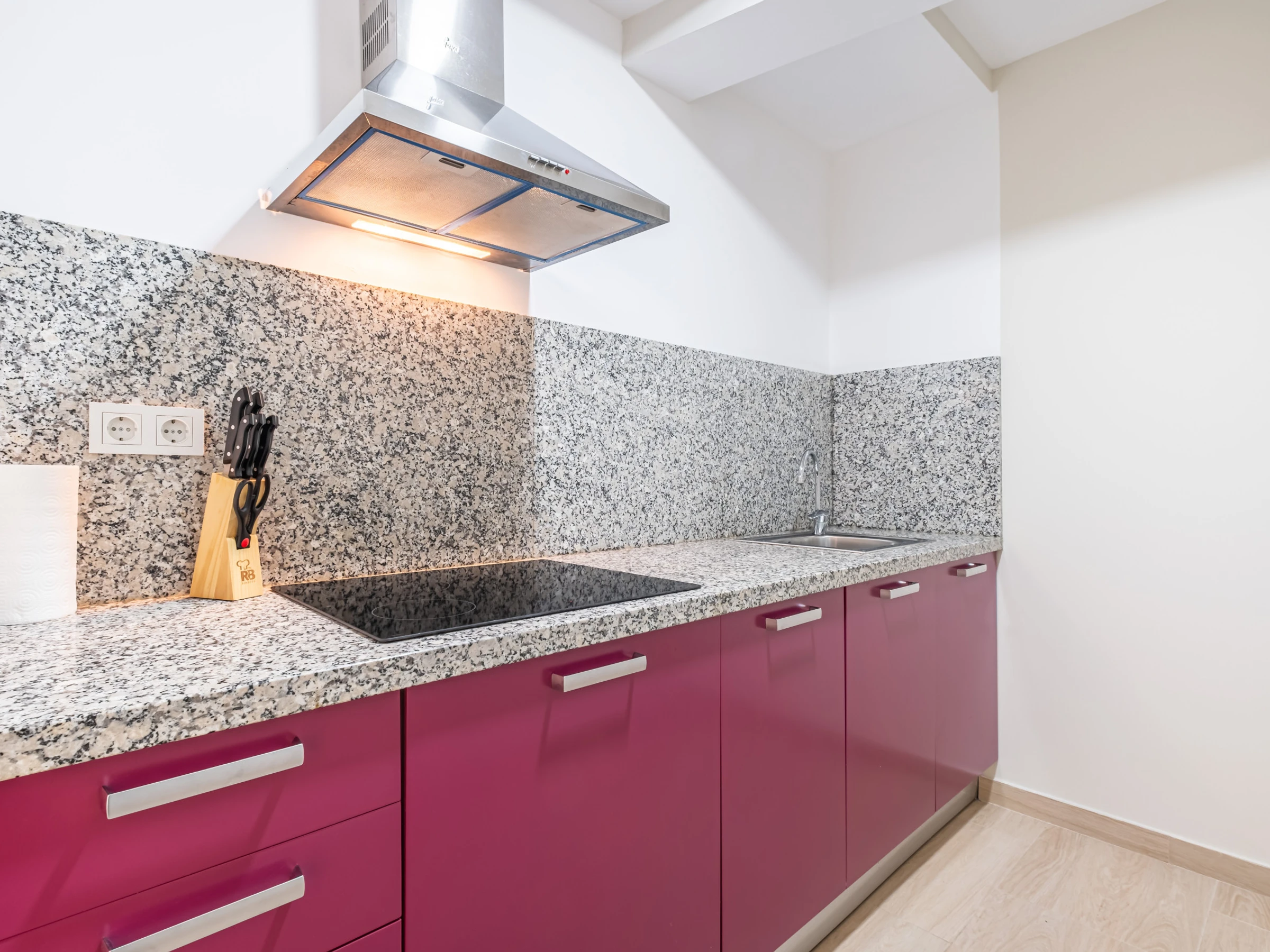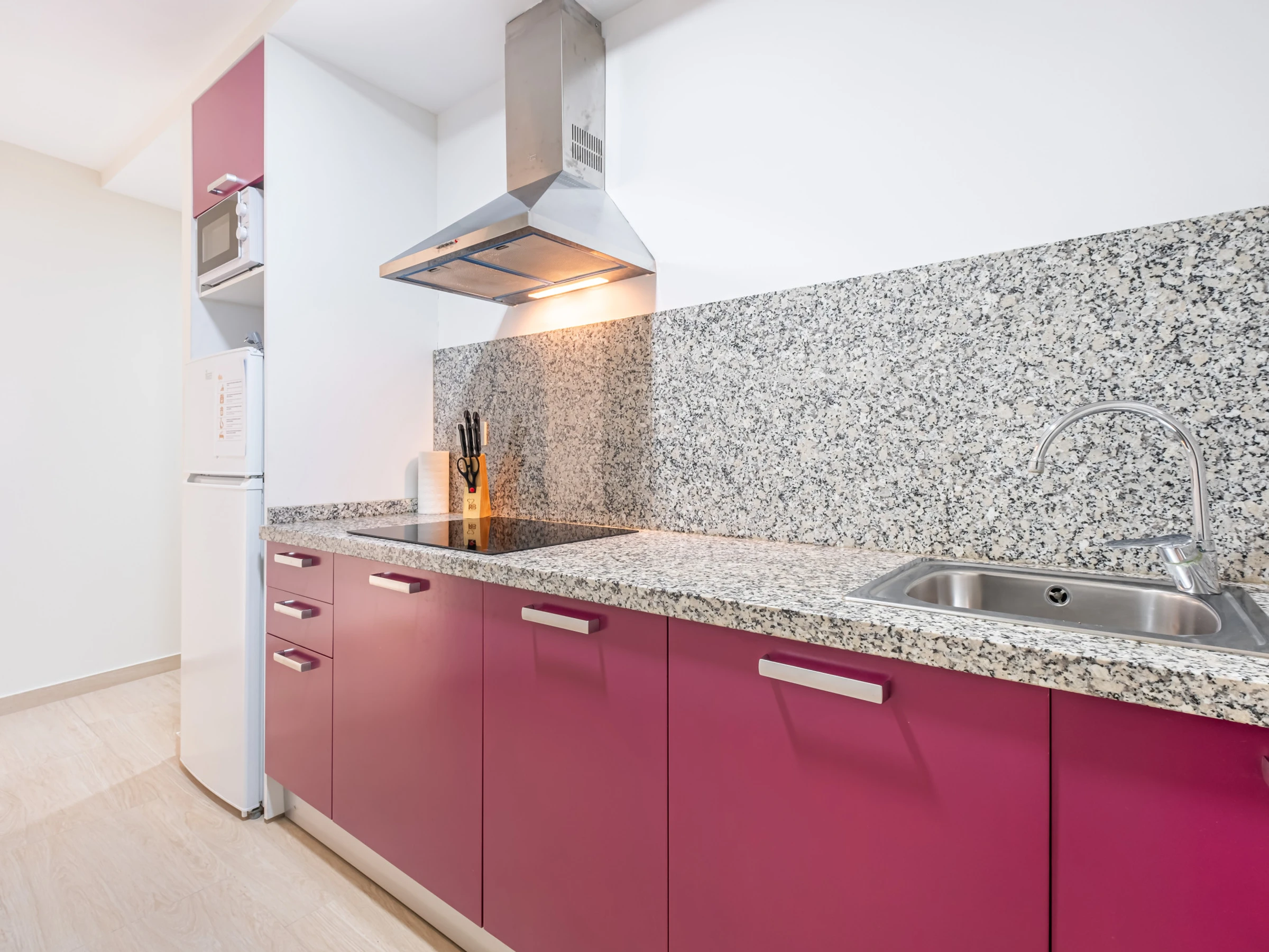 Dieses offene küche, mit ceranfeld, ist ausgestattet in kühlschrank, mikrowelle, gefrierschrank, geschirr/besteck, kochutensilien, kaffeemaschine, toaster, wasserkocher und saftpresse.